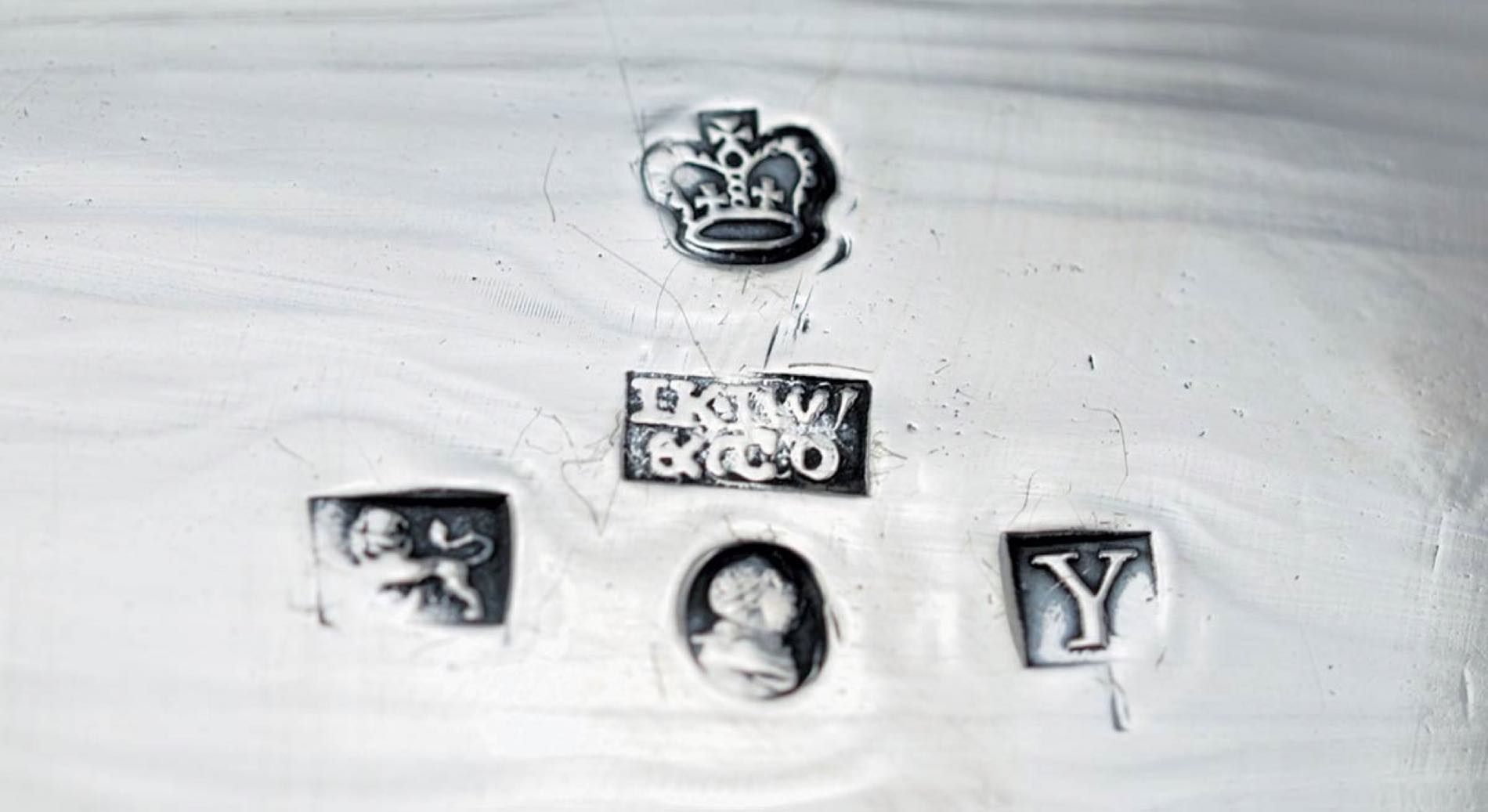 sbalzato e cesellato con pannelli floreali e decorazioni fogliate, presenta un bordo godronato. Piede ovale e manico pieghevole. Argento 925/1000, serie completa di marchi Sheffield 1821-1822, argentieri Kirby, Waterhouse & Co. Dimensioni 34 x 28 cm, altezza 11,7 cm (senza manico). Peso 1170 gr. Stato di conservazione: ***** eccellente.