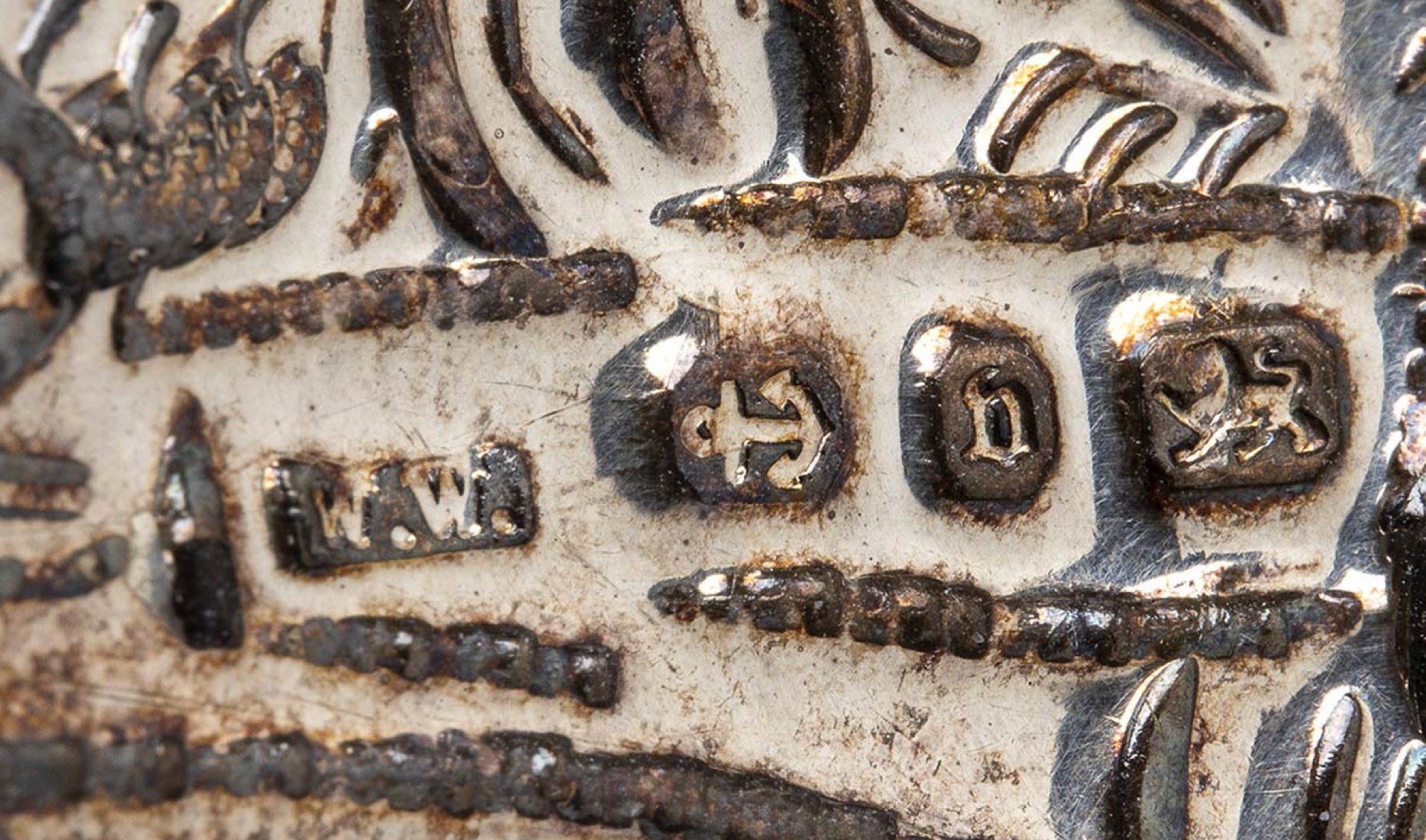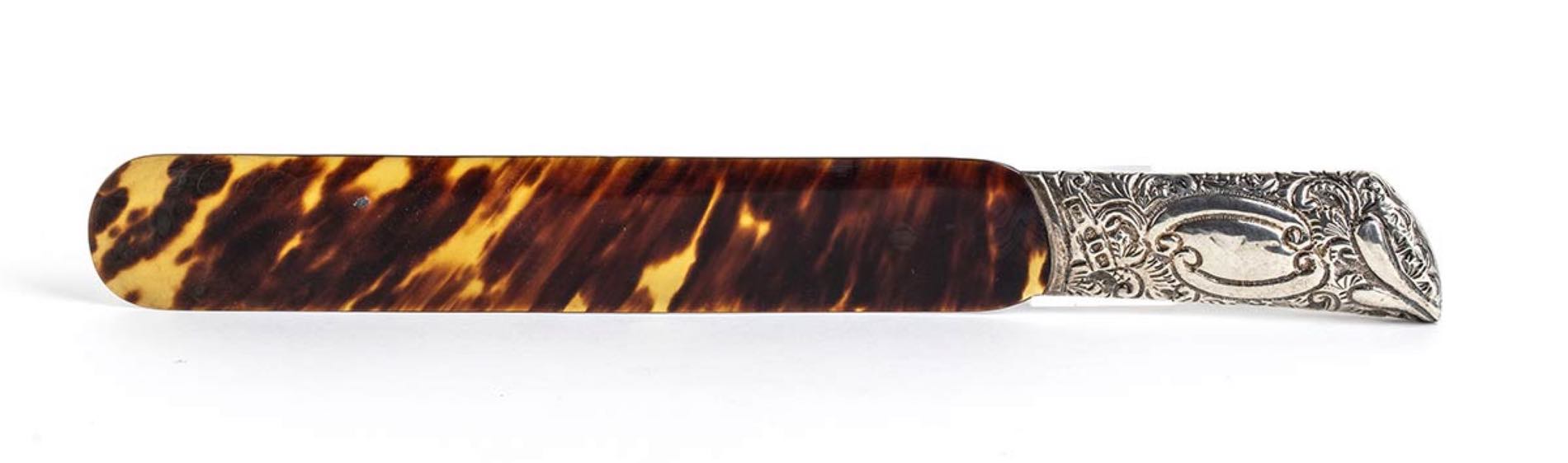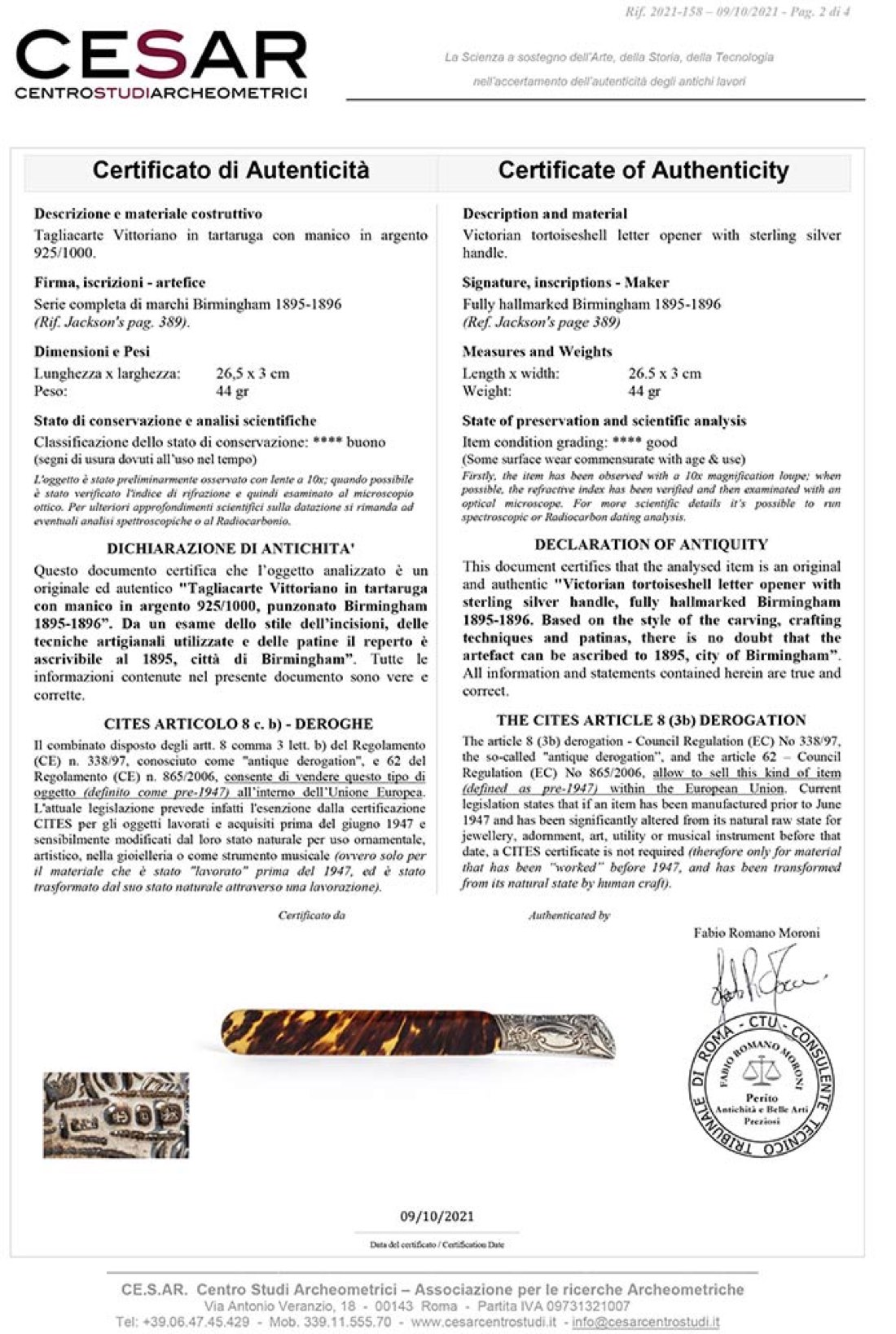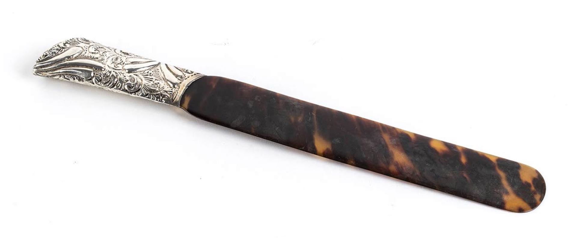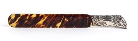 in tartaruga con manico in argento 925/1000. Serie completa di marchi Birmingham 1895-1896 (Rif. Jackson's pag. 389). Dimensioni 26,5 x 3 cm. Peso 44 gr. Stato di conservazione: **** buono. Accompagnato da certificato di autenticità Ce.S.Ar. Centro Studi Archeometrici (pre-1947).