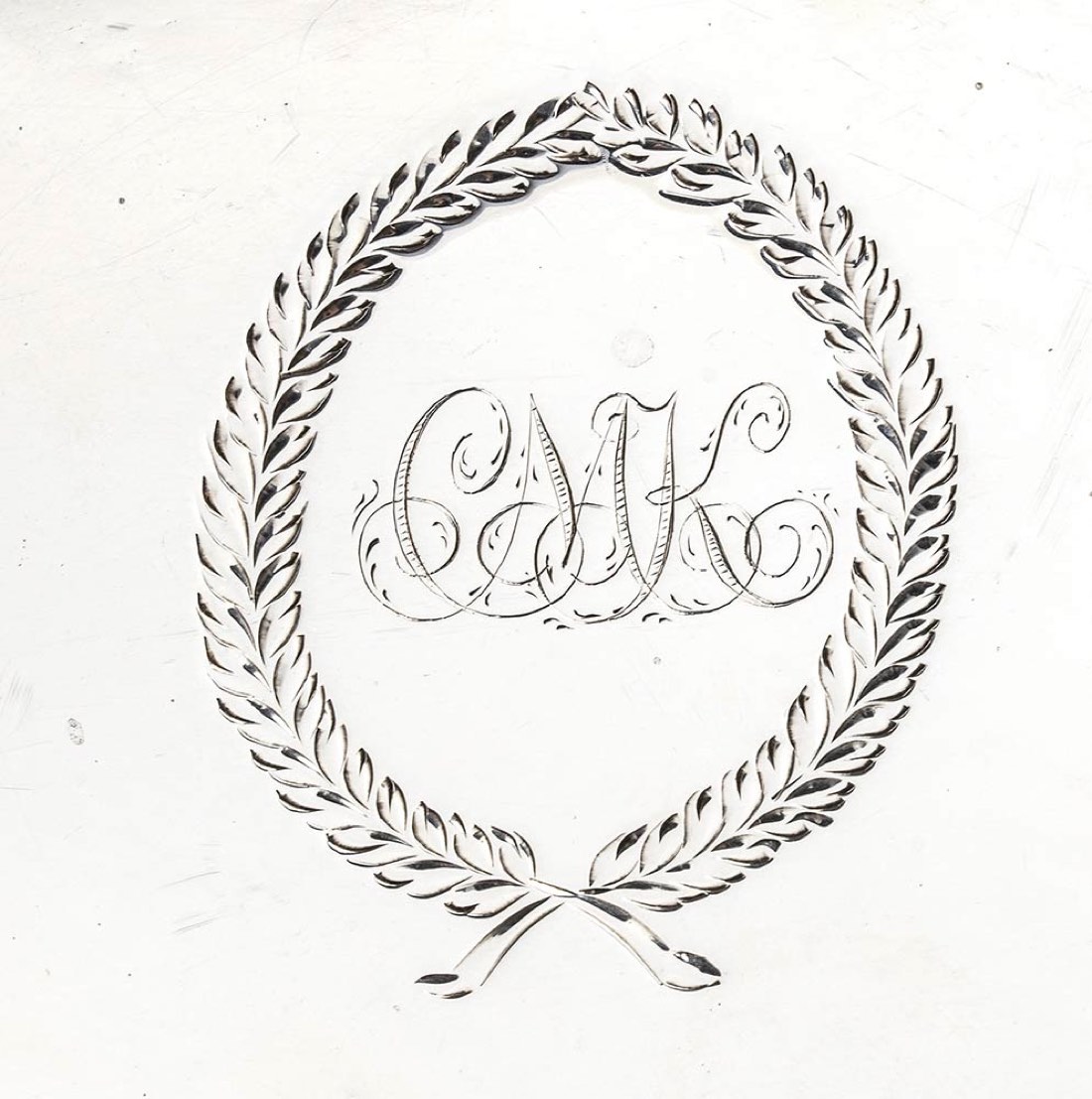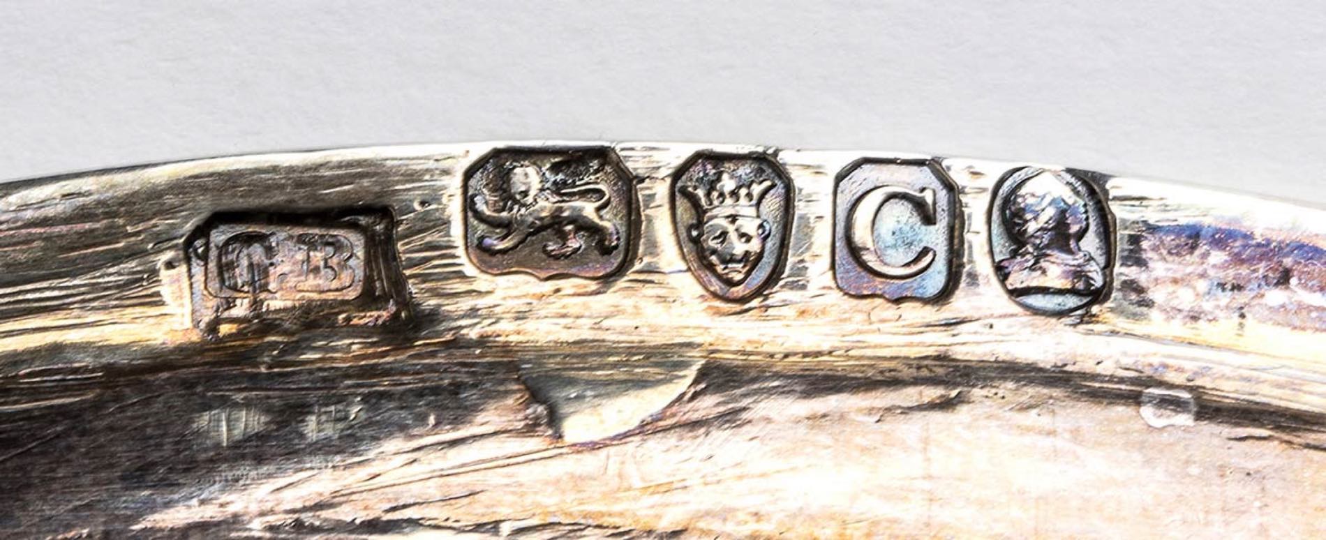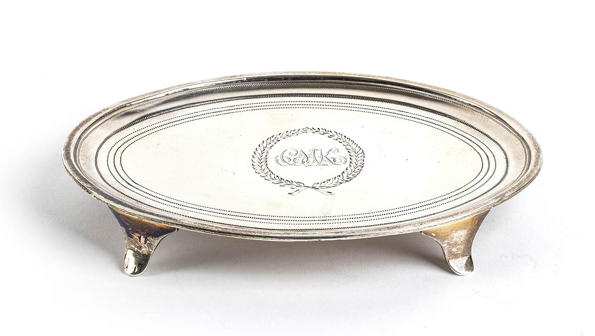 di forma ovale, a tre piedini; al centro un monogramma inciso. Argento 925/1000, serie completa di marchi Londra 1818-1819, argentiere George Beckwith (Rif. Jackson's pag. 60, Grimwade pag. 64 nr. 76). Dimensioni 11,5 x 6 cm. Peso 145 gr. Stato di conservazione: **** buono.