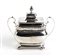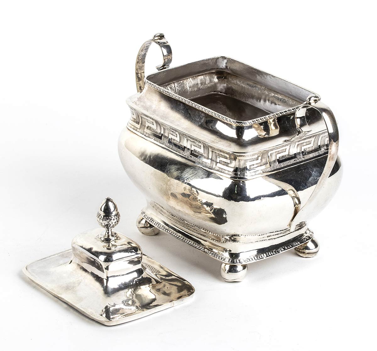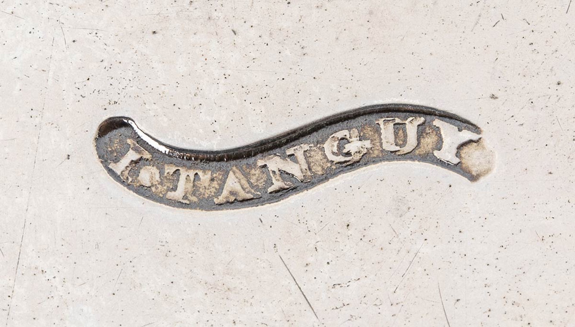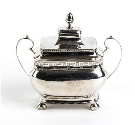 di forma rettangolare, con manici laterali, poggiante su quattro piedini schiacciato, modello molto popolare tra il 1800 e il 1815. Punzonata con il marchio di John Tanguy (1780 - 1858) attivo a Philadelphia tra il 1801 e il 1818. Altezza 18 cm, larghezza con i manici 21,5 cm. Peso 590 gr. Stato di conservazione: **** buono.