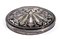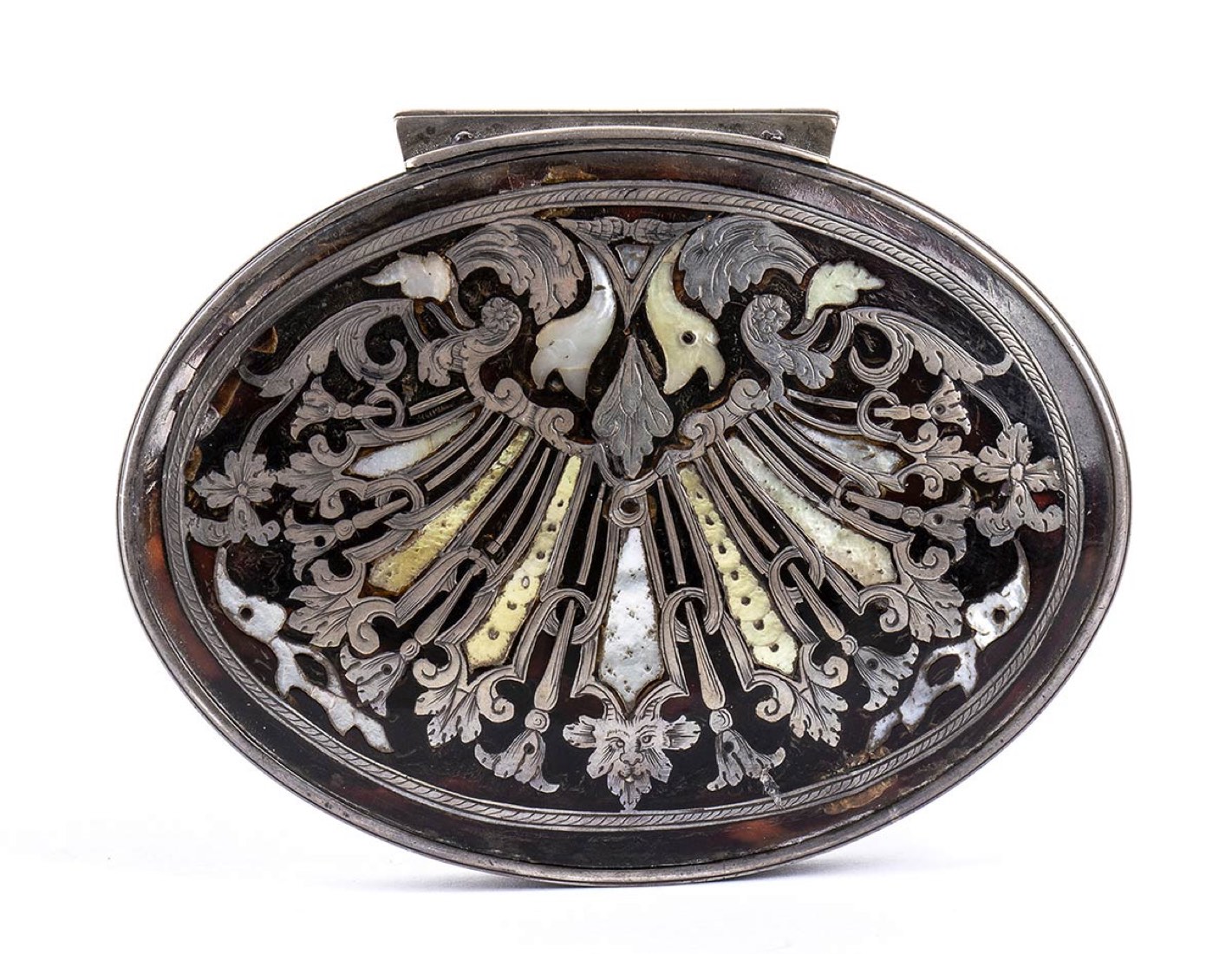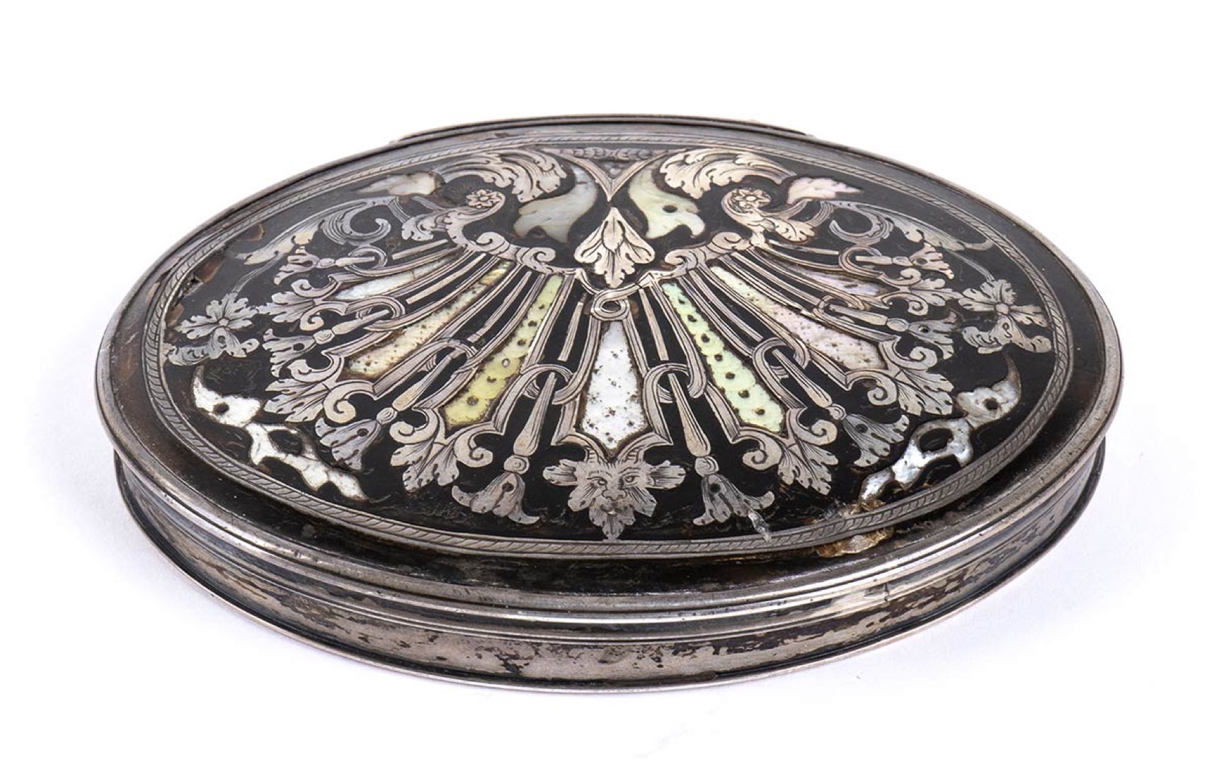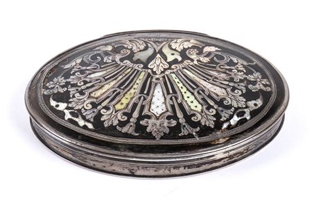 di forma ovale, in tartaruga con lati in argento e cerniera in argento a scomparsa, il coperchio leggermente bombato con volute floreali e fogliate piqué clouté, piqué posé ed in madreperla. Base in tartaruga. Le scatole di tartaruga antiche e i gioielli sono talvolta decorati dall'intarsio di piccole punte d'oro o d'argento.