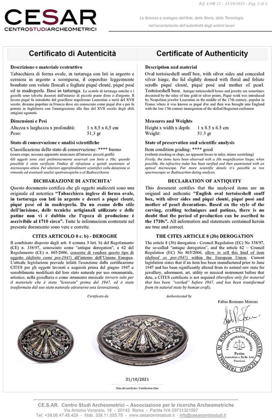 Il lavoro piqué fu introdotto dal gioielliere napoletano Laurentini a metà del XVII secolo, divenne popolare in Francia dove era conosciuto come piqué d'or e poi fu portato in Inghilterra con l'immigrazione alla fine del XVII secolo degli abili artigiani ugonotti. Altezza x larghezza x profondità 1 x 8,5 x 6,5 cm. Peso 51,3 gr. Stato di conservazione: **** buono (senza crepe; nessuna apparente mancanza all'intarsio, piccoli graffi). Accompagnato da certificato di autenticità Ce.S.Ar. Centro Studi Archeometrici (pre-1947).
