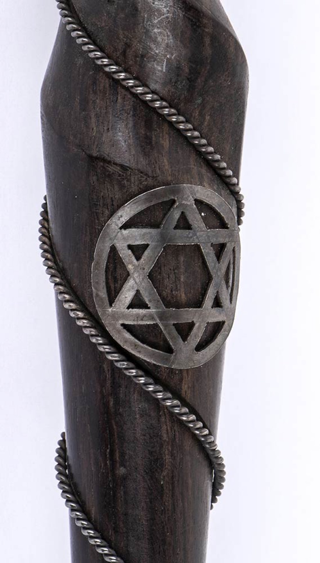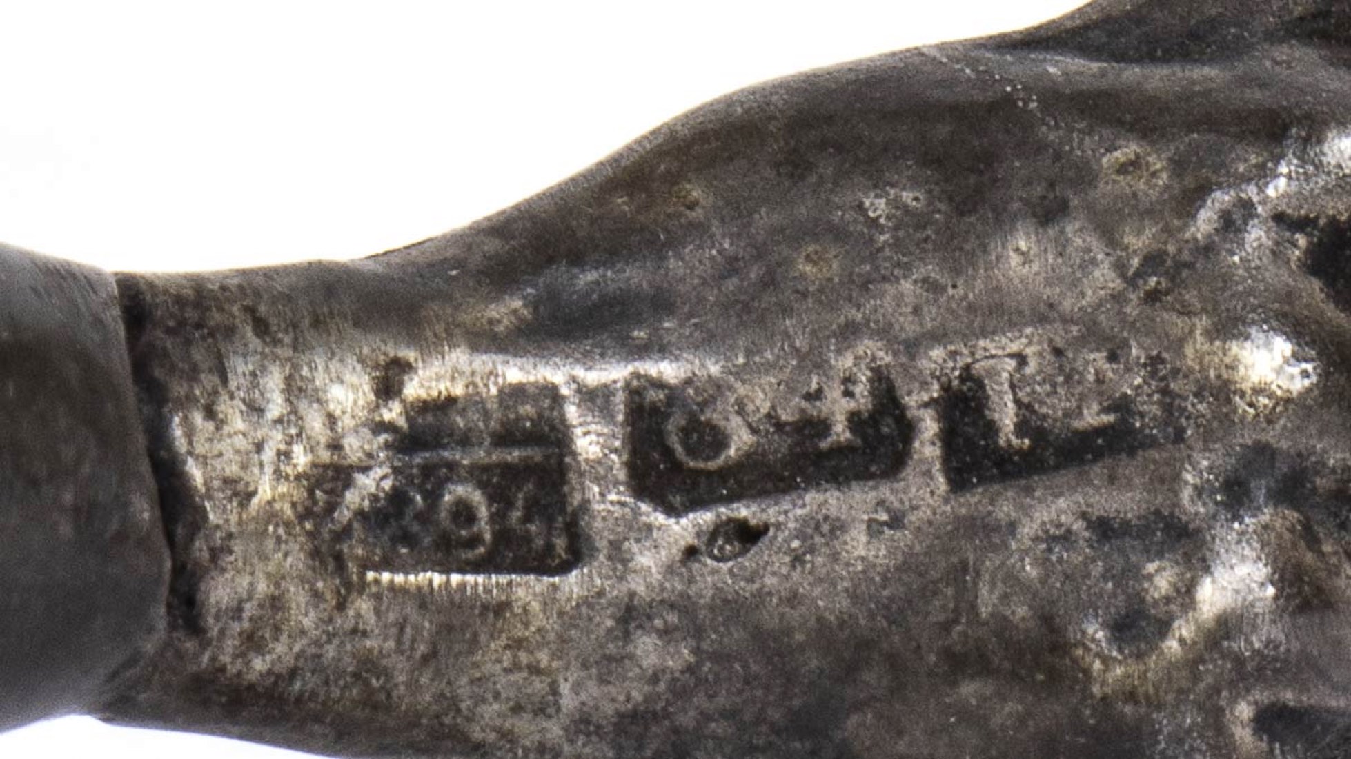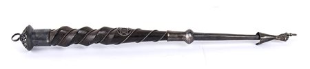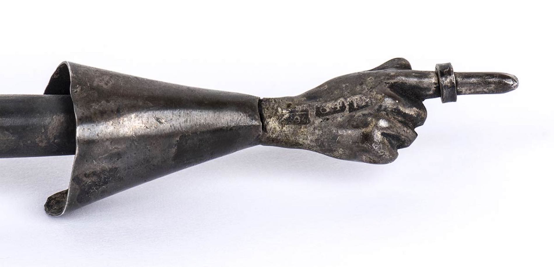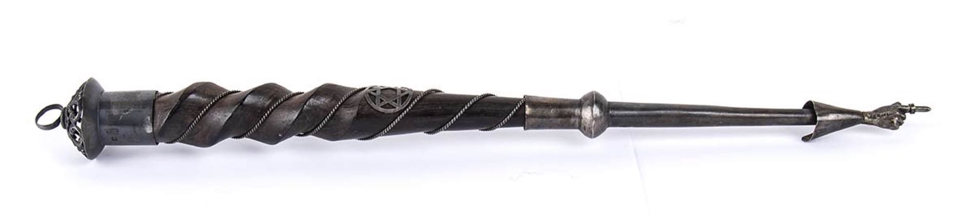 puntatore usato per guidare le letture pubbliche del testo dei rotoli della Torah. Punzonato con marchi Russi apocrifi del 1894 per l'argento al titolo di 84 zolotniks. Lunghezza 41 cm, larghezza 3,5 cm. Peso 142 gr. Stato di conservazione: **** buono.