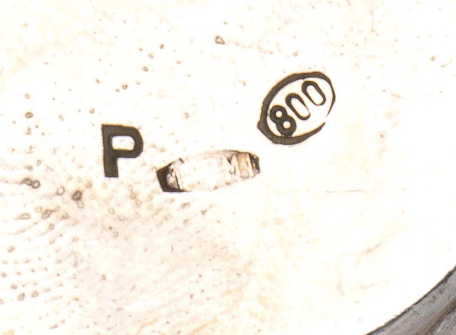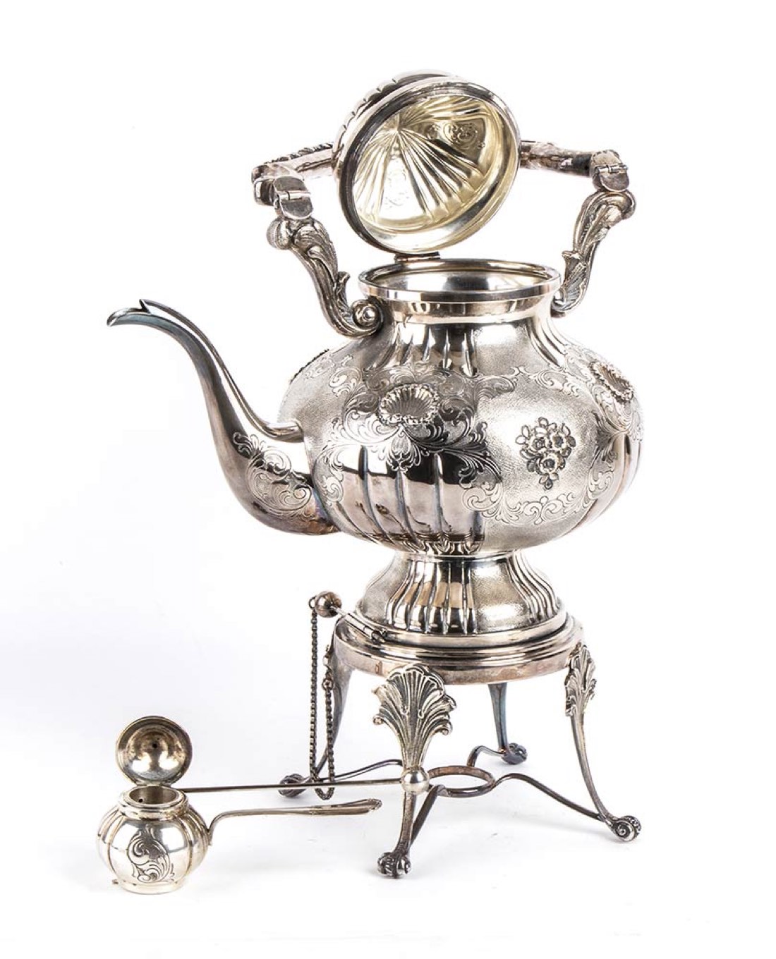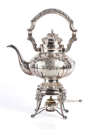 poggiante su quattro piedi a riccio, corpo globulare costolato con riserve decorate a volute floreali; fornello con i medesimi decori. Argento 800/1000, punzonato "800" "110 MI", argentiere Carmelo Ganci.