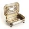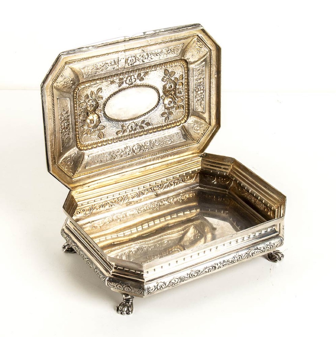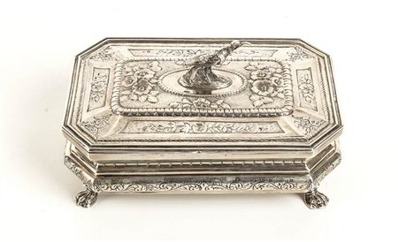 di forma rettangolare a decori floreali poggiante su quattro piedi a zampa ferina, coperchio incernierato. Argento 800/1000, punzonata "800".