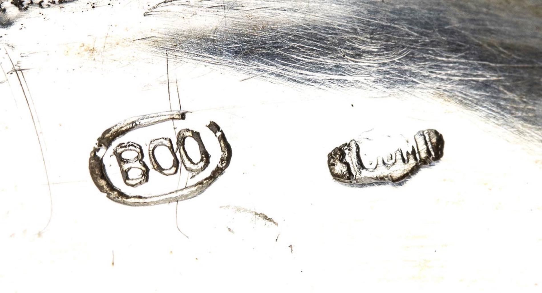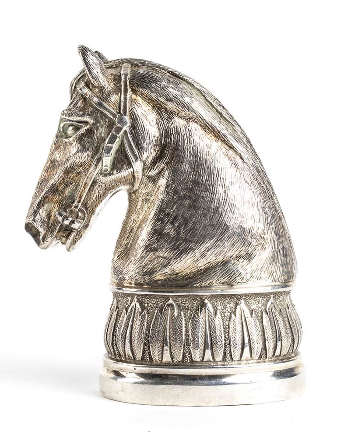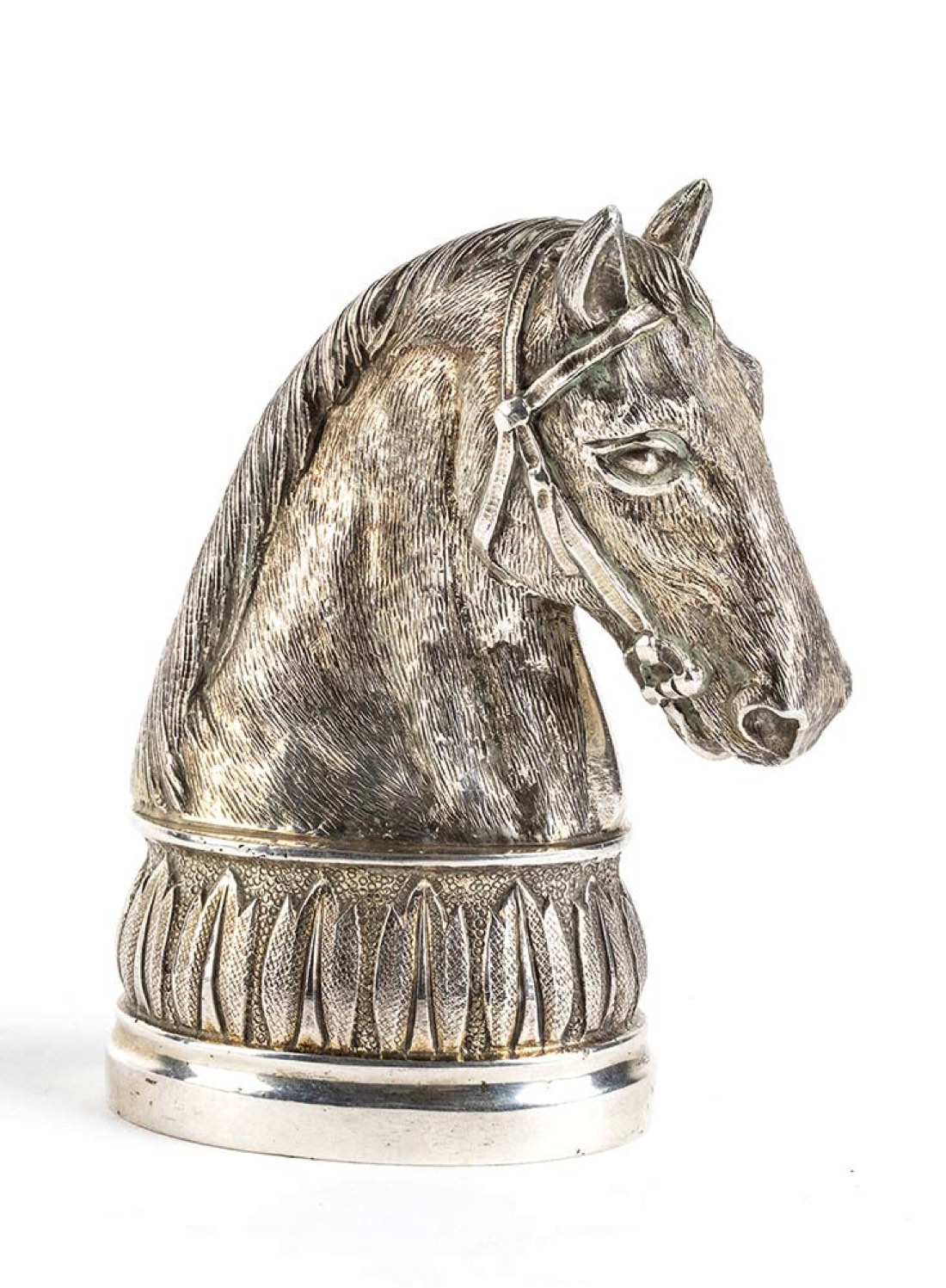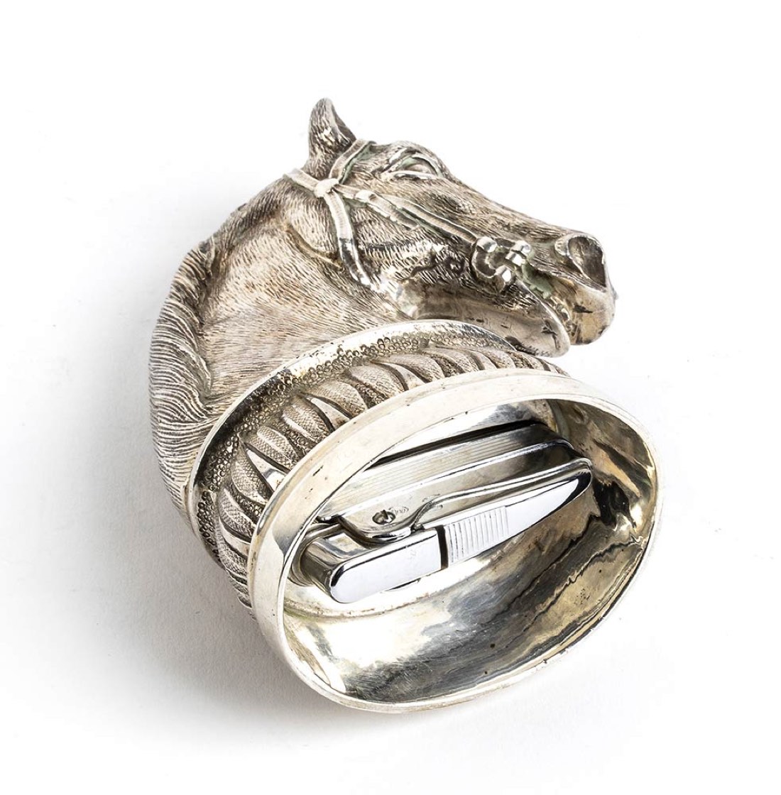a forma di cavallo con accendino rowenta incassato nella parte inferiore. Argento 800/1000, punzonato "165 MI", argentiere Sacconi Mario.