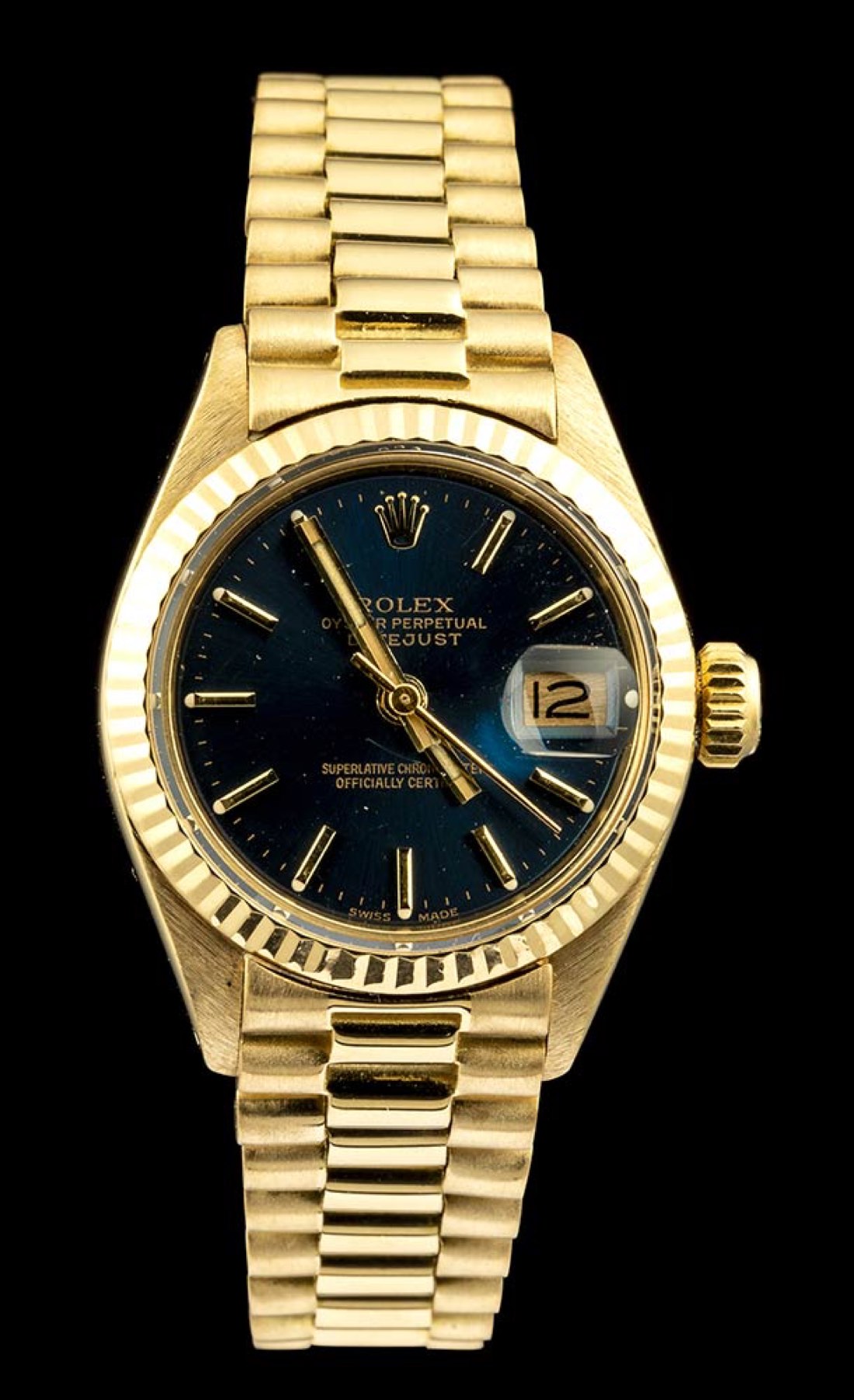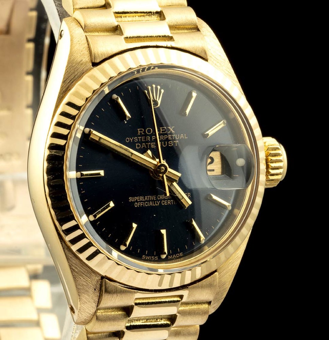 con quadrante nero e datario. Bracciale modello president con déployante a scomparsa. Ref. 6917 con vetro plastica. Diametro della cassa 26 mm. Lunghezza del bracciale 17,5 cm.