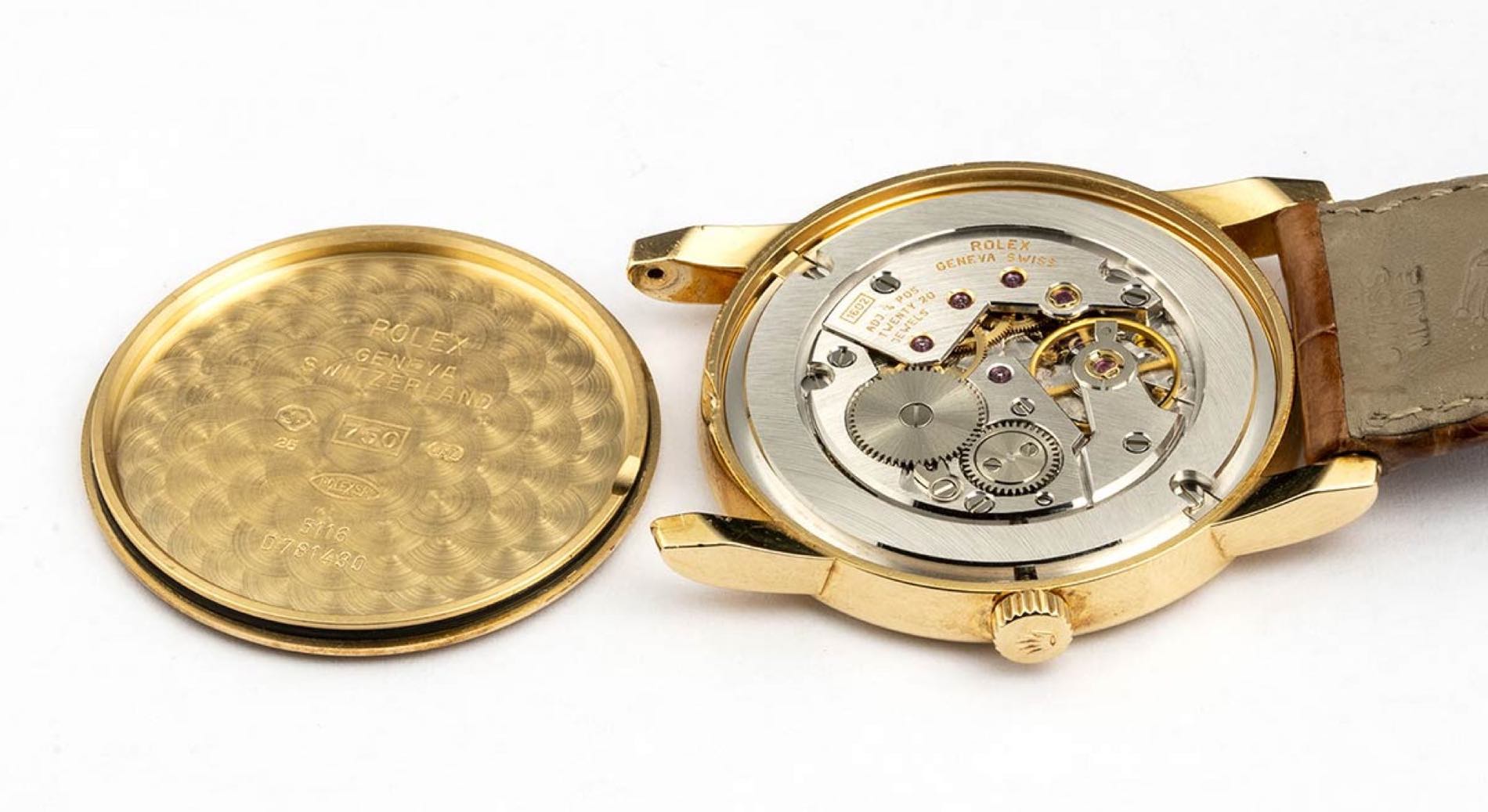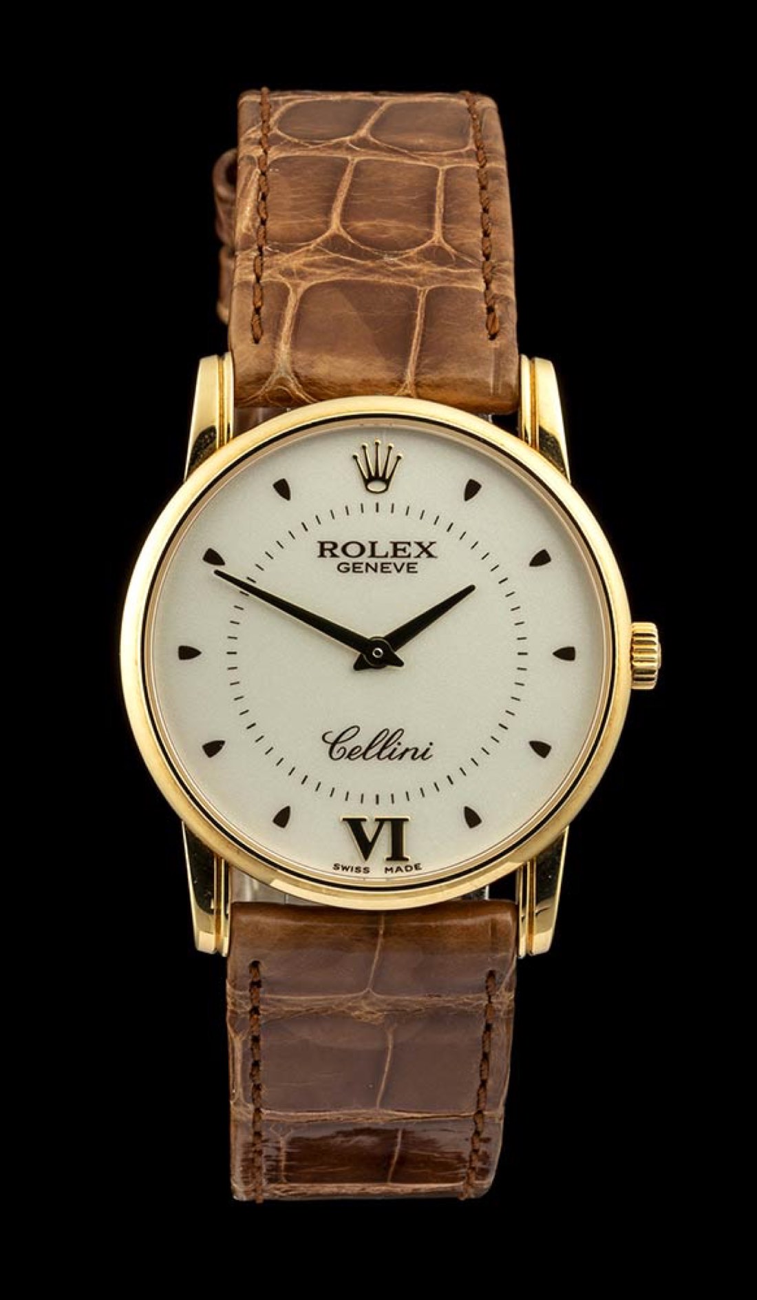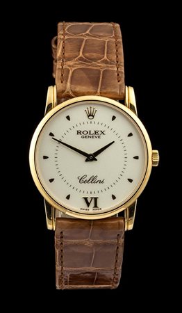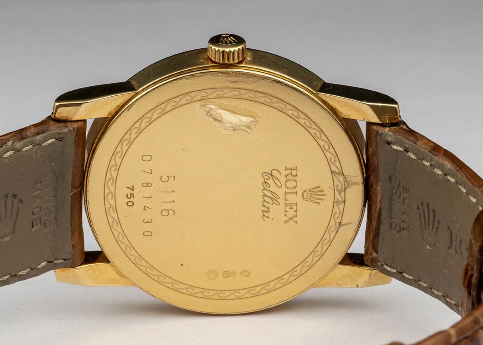 in oro giallo 18k con quadrante bianco e vetro zaffiro. Movimento a carica manuale, Rolex Cellini Classic. Ref. 5116. Cinturino in pelle con chiusura ardiglione in oro, originali. Diametro della cassa 32 mm. Orologio usato raramente, sul fondello si trova la plastica protettiva originale. Completo di scatola originale.