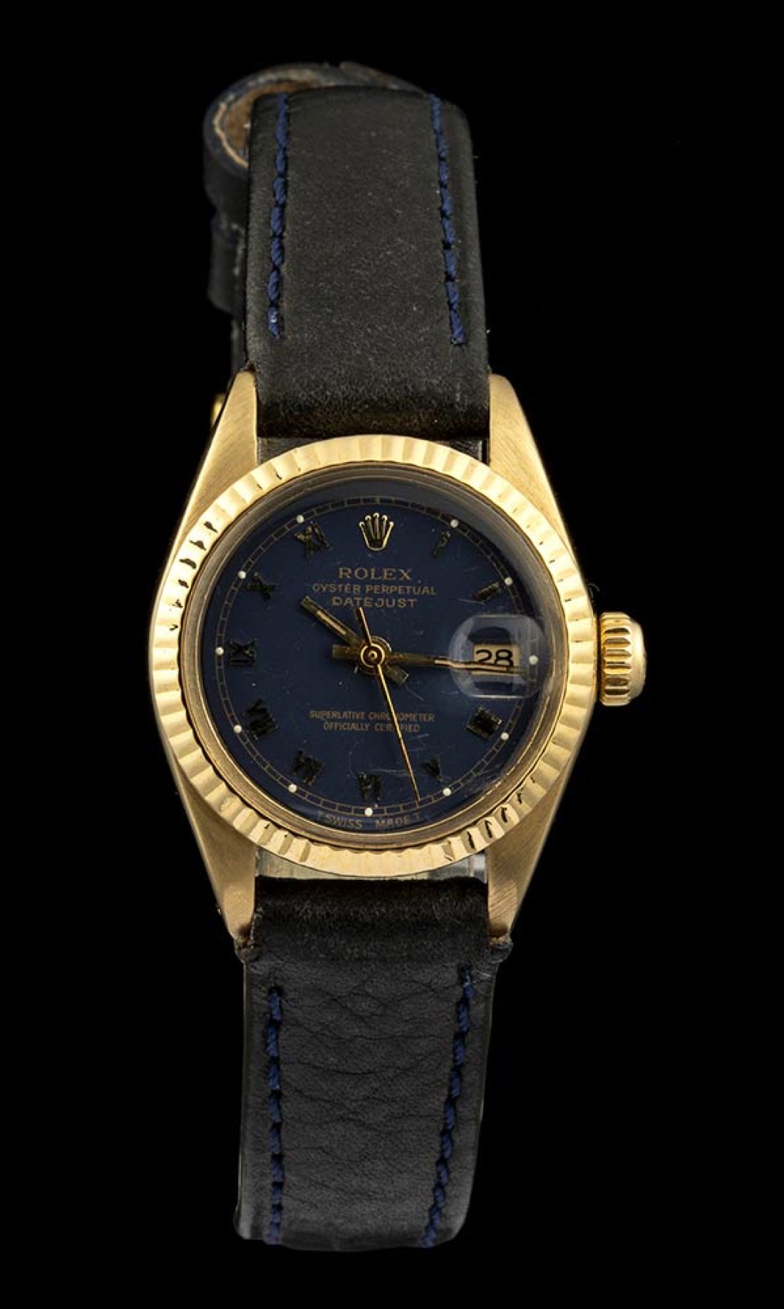 in oro giallo 18k, quadrante blù con indici a bastoni. Movimento automatico, ref. 6717. Vetro plexiglass. Diametro della cassa 26 mm. Cinturino in pelle blu con chiusura ardiglione.