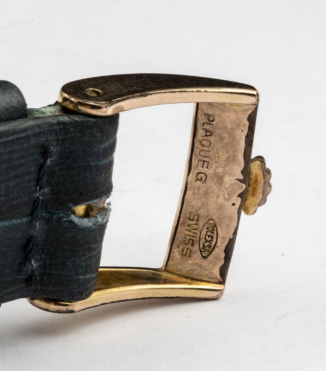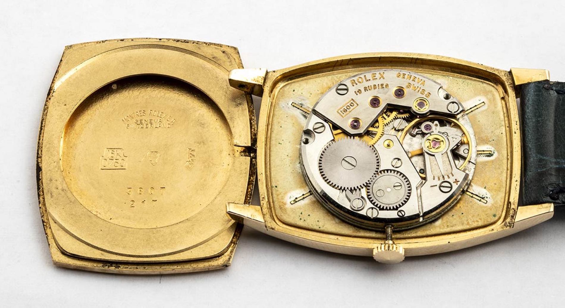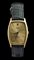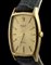 in oro giallo 18k, quadrante dorato con indici a bastoni, vetro zaffiro. Movimento a carica manuale ref. 3807. Bracciale in pelle con chiusura ad ardiglione aftermarket placcata oro. Cassa 25 x 31 mm.
