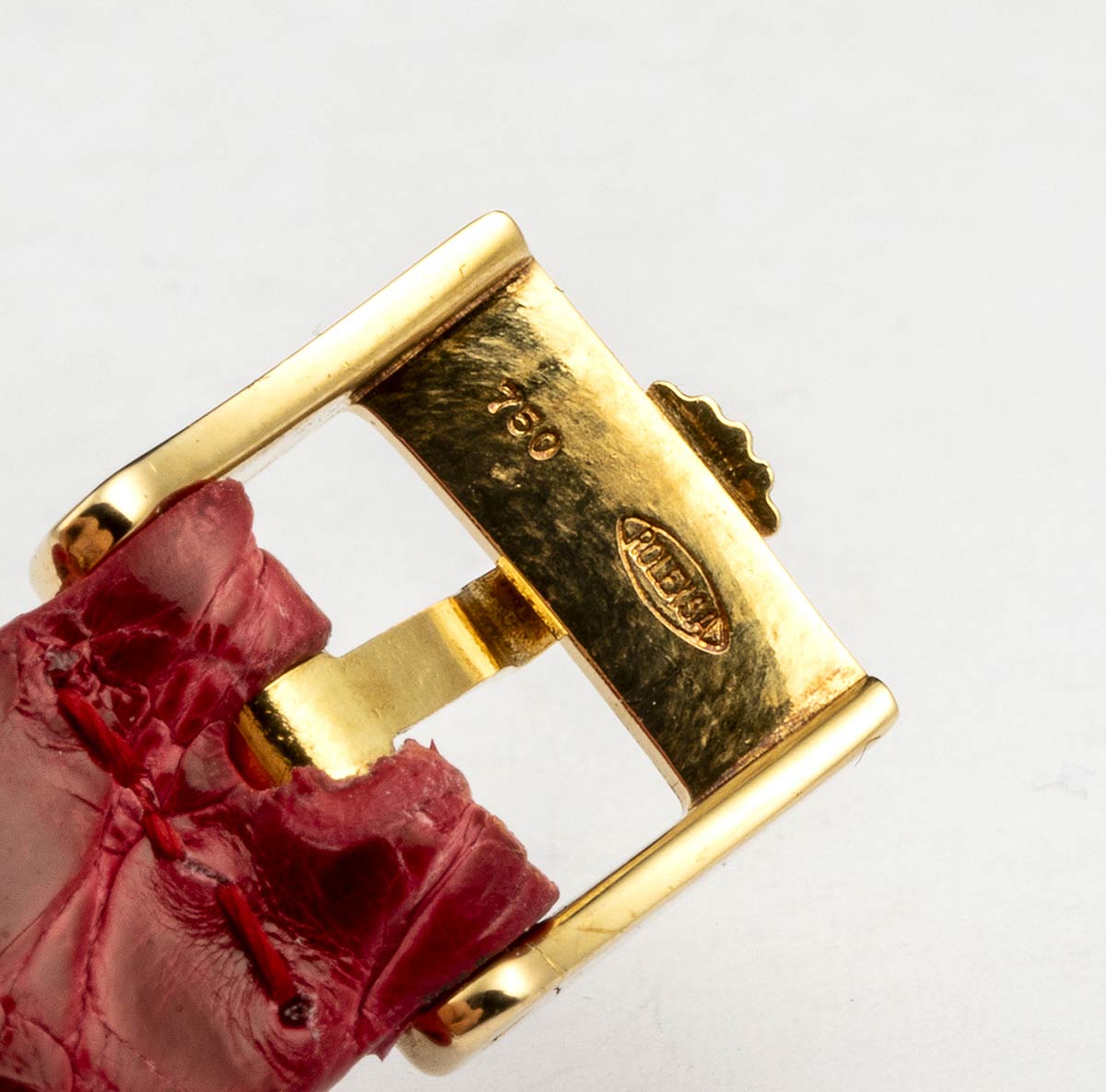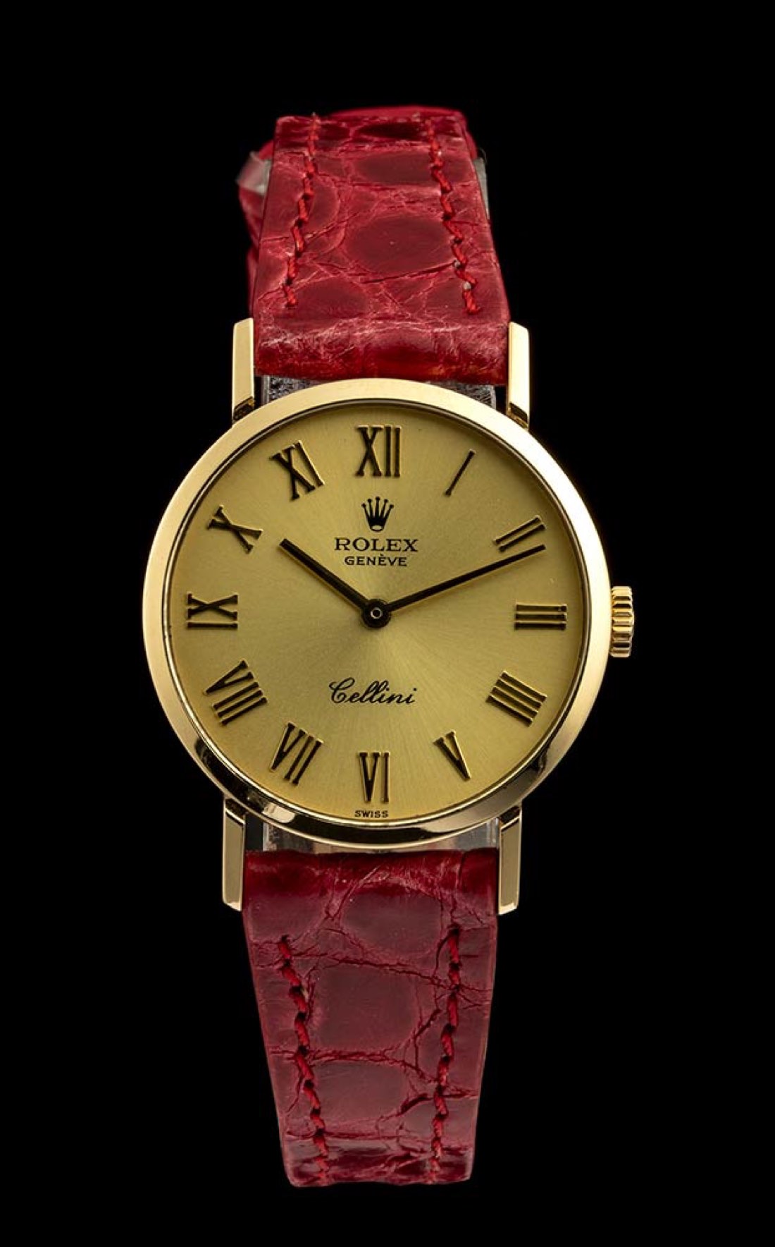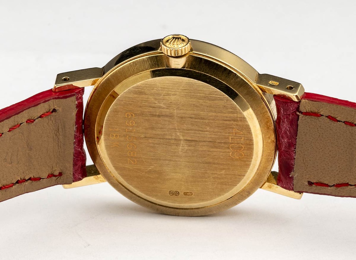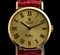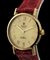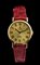 cassa in oro giallo 18k, diametro 26 mm con quadrante dorato e indici a numeri romani, vetro zaffiro. Movimento a carica manuale. Ref. 4109. Bracciale nuovo in pelle rosso con chiusura ad ardiglione in oro 18k.