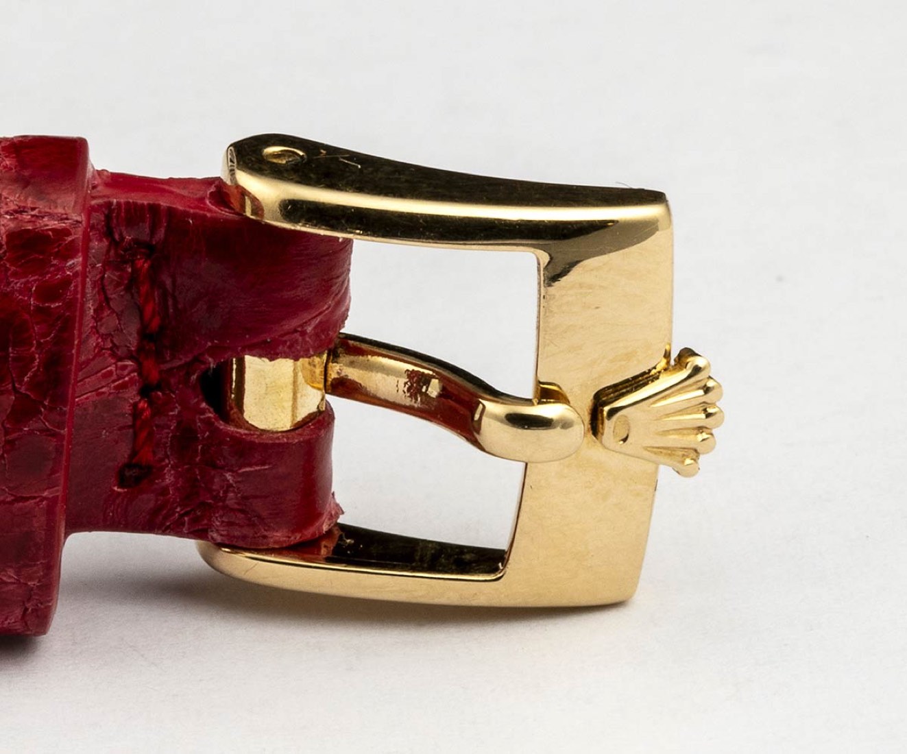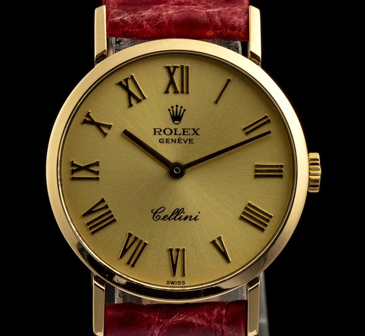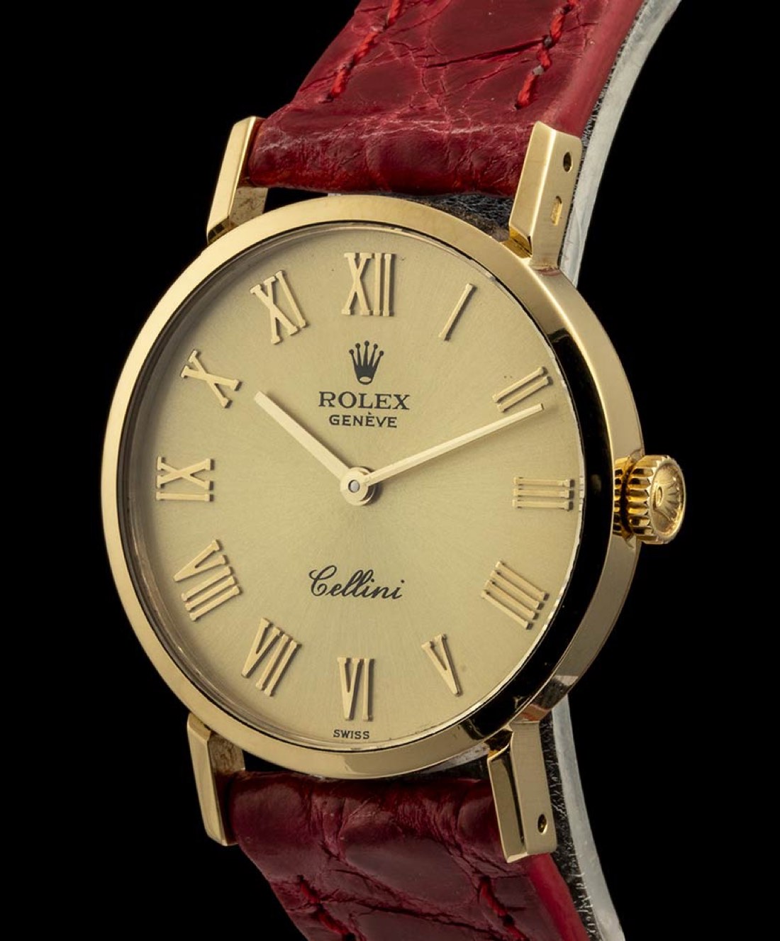 cassa in oro giallo 18k, diametro 26 mm con quadrante dorato e indici a numeri romani, vetro zaffiro. Movimento a carica manuale. Ref. 4109. Bracciale nuovo in pelle rosso con chiusura ad ardiglione in oro 18k.