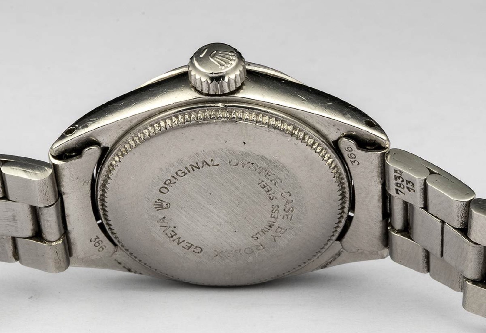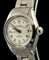 in acciaio, quadrante bianco con indici a numeri romani. Movimento a carica automatica. Cassa, corona, fondello e bracciale timbrati rolex, bracciale oyster in acciaio. Cassa 26 mm, lunghezza 15,5 cm. Garanzia e scatola originali.