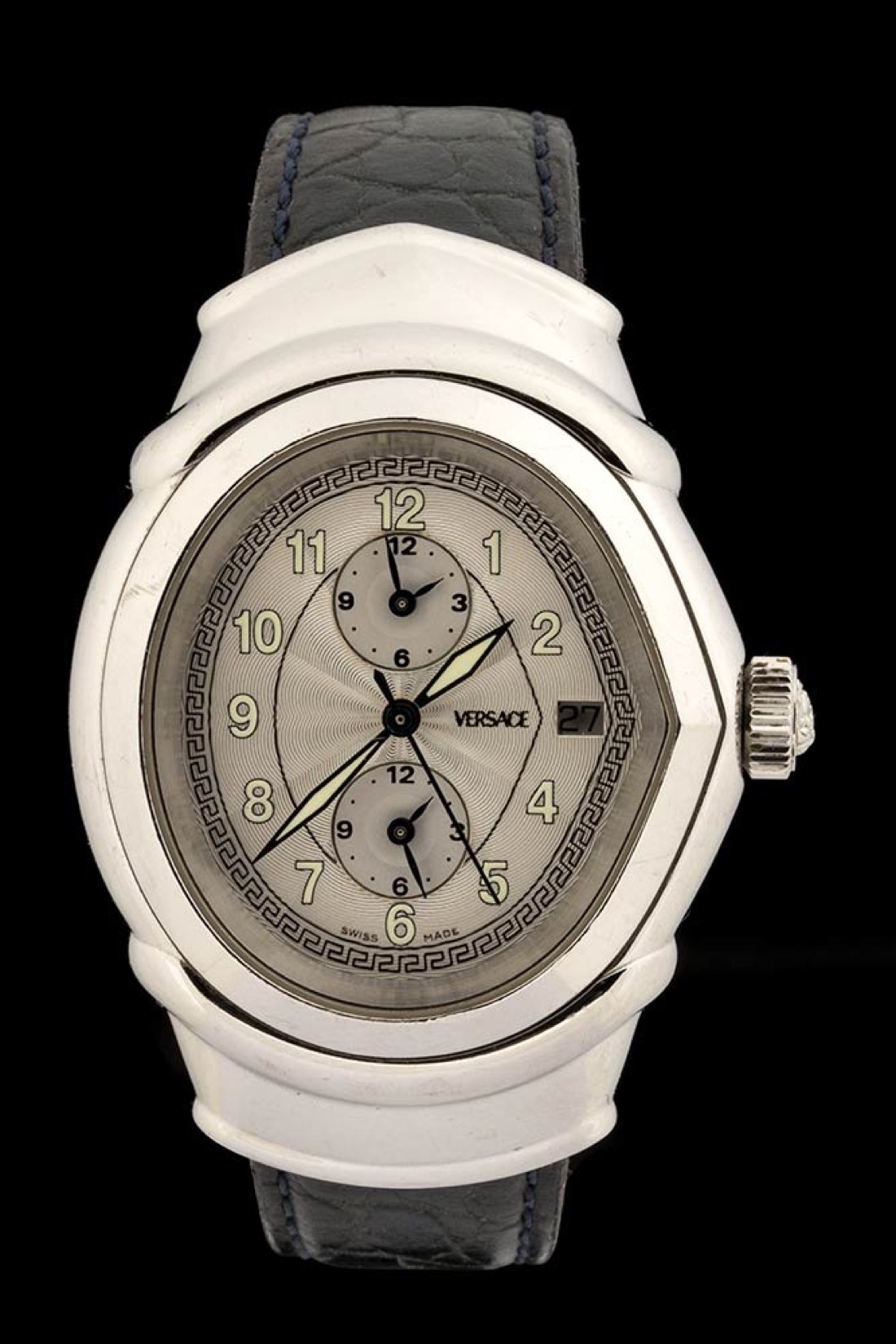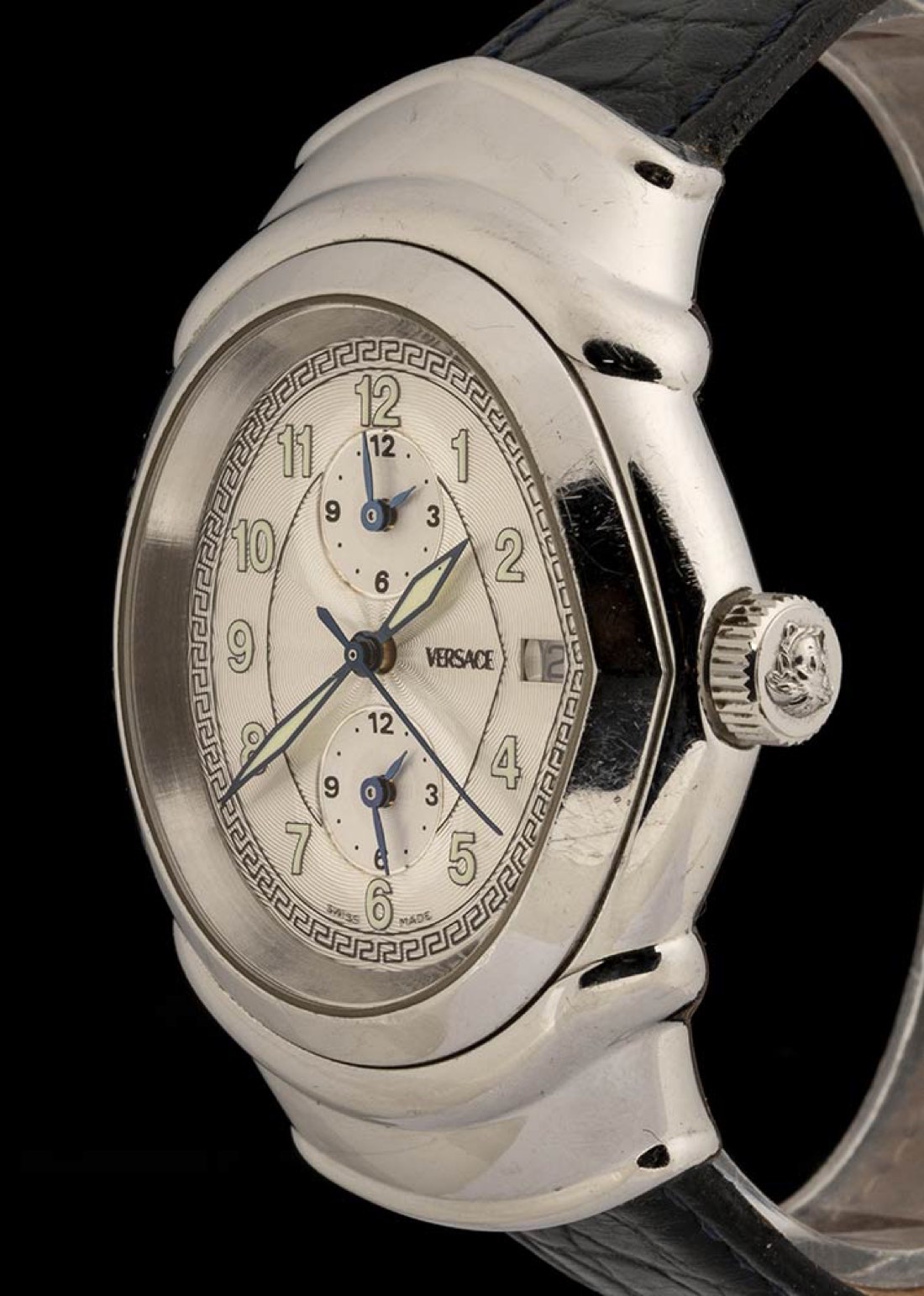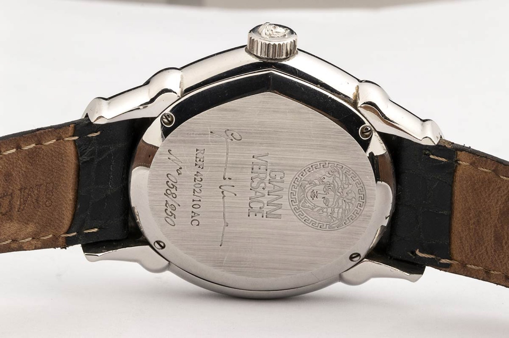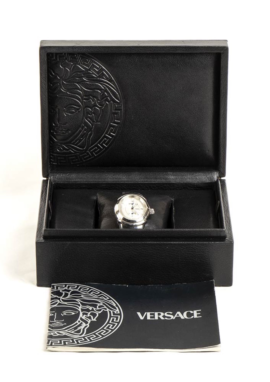 quadrante argento guilloché con movimento automatico Franck Muller. Orologio creato dalla collaborazione di Gianni Versace e Franck Muller, edizione limitata di 250 pezzi. Numero seriale 58/250, referenza 4202/10AC. Cassa in acciaio 39 mm. Cinturino in pelle con chiusura ardiglione. Vetro in zaffiro. Corredato da scatola originale e garanzia.