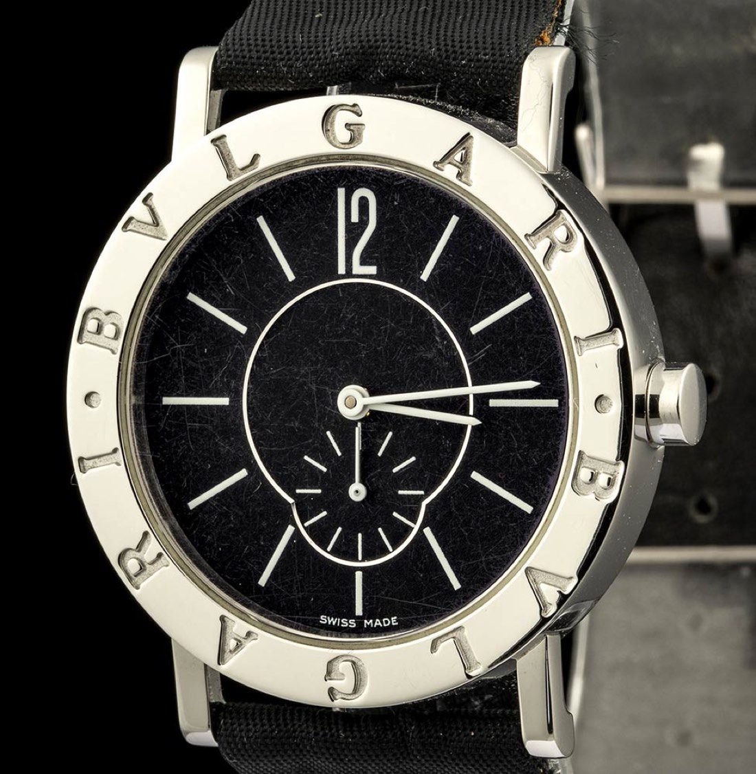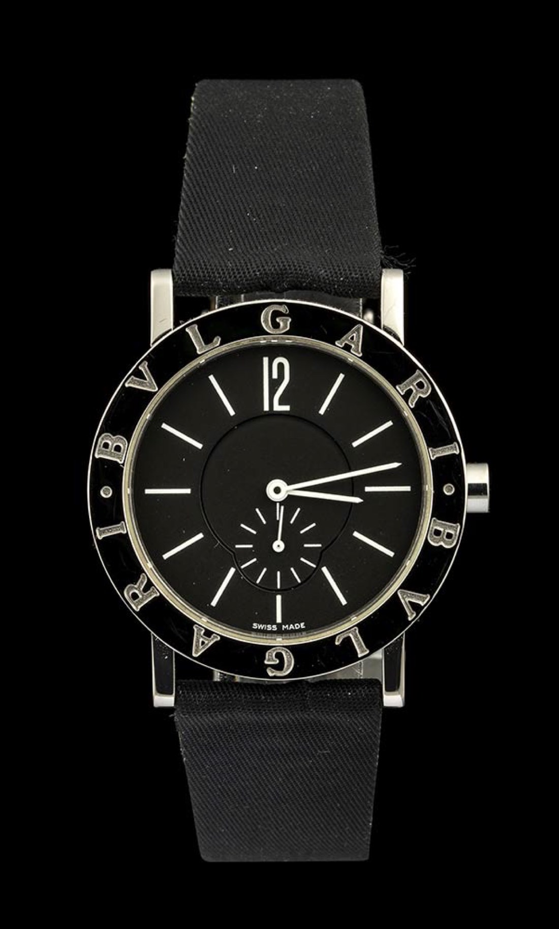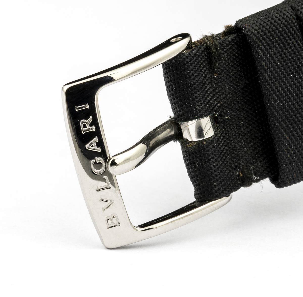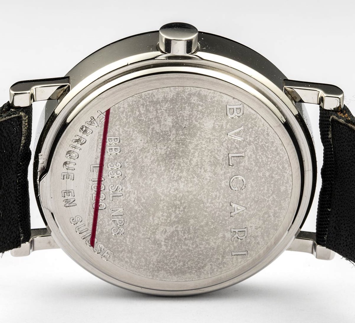 quadrante nero con indici applicati a bastone e numeri arabi, fibbia in acciaio. Modello BVLGARI BVLGARI ref. BB 33 SL NPS. Diametro cassa 33 mm. Movimentoi al quarzo.