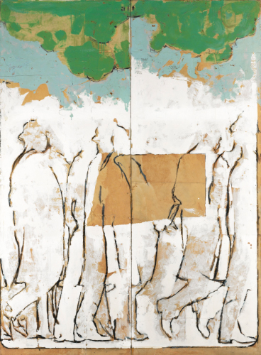 MARIO SCHIFANO 1934 - 1998 WHEN I REMEMBER GIACOMO BALLA signed, titled and dated 64 on the reverse, enamel, pastels and charcoal on paper collage applied on canvas firmato, intitolato e datato 64 sul retro smalto, pastelli e carboncino su collage di carta da pacco applicato su tela cm 172x126,5 (dittico) Opera registrata presso l'Archivio Mario Schifano, Roma, con il n. 02375130309 L'opera è accompagnata da certificato su fotografia rilasciato dall'Archivio Mario Schifano, Roma PROVENANCE Odyssia Gallery, New York Studio Marconi, Milano Ivi acquistato dall'attuale proprietario nel 1967 LETTERATURA F. Di Castro, Artisti italiani alla Biennale, in "Le Arti" anno XIV, n. 6, giugno 1964, illustrato Fondazione Marconi, Schifano 1964-1970. Dal paesaggio alla tv, Milano 2006, vol. II, pag. 21, illustrato a colori a piena pagina