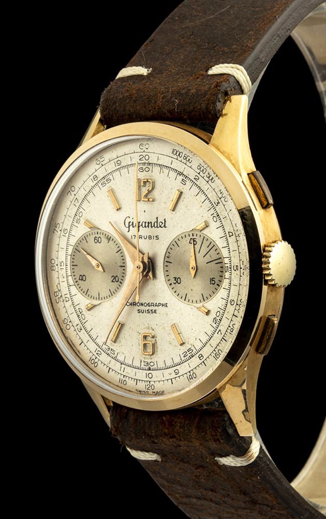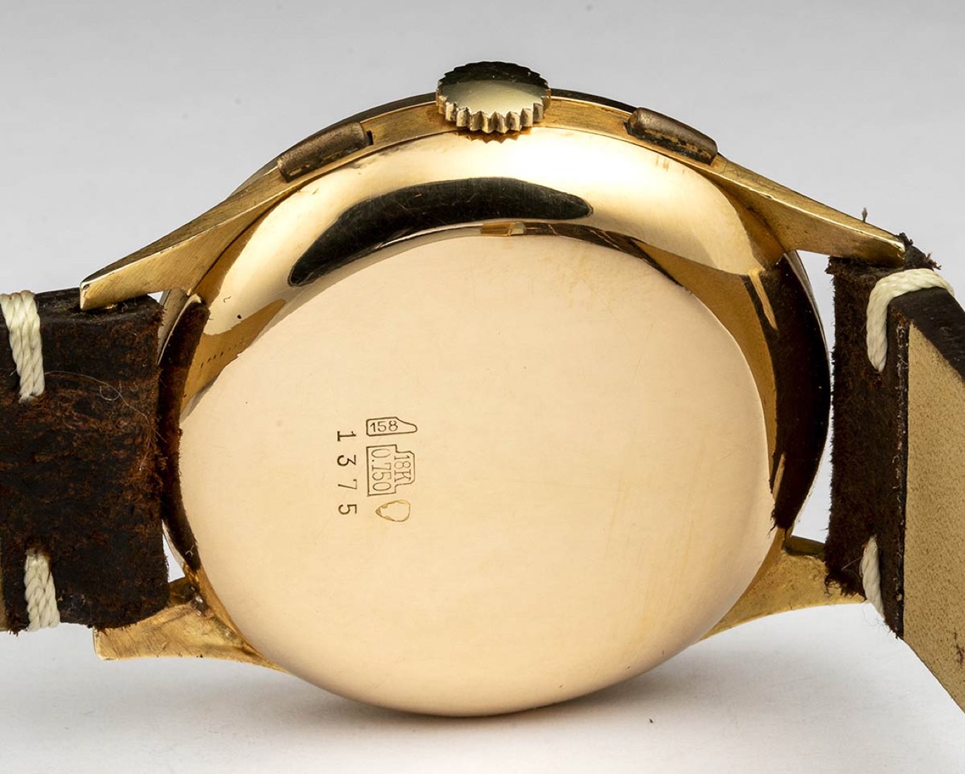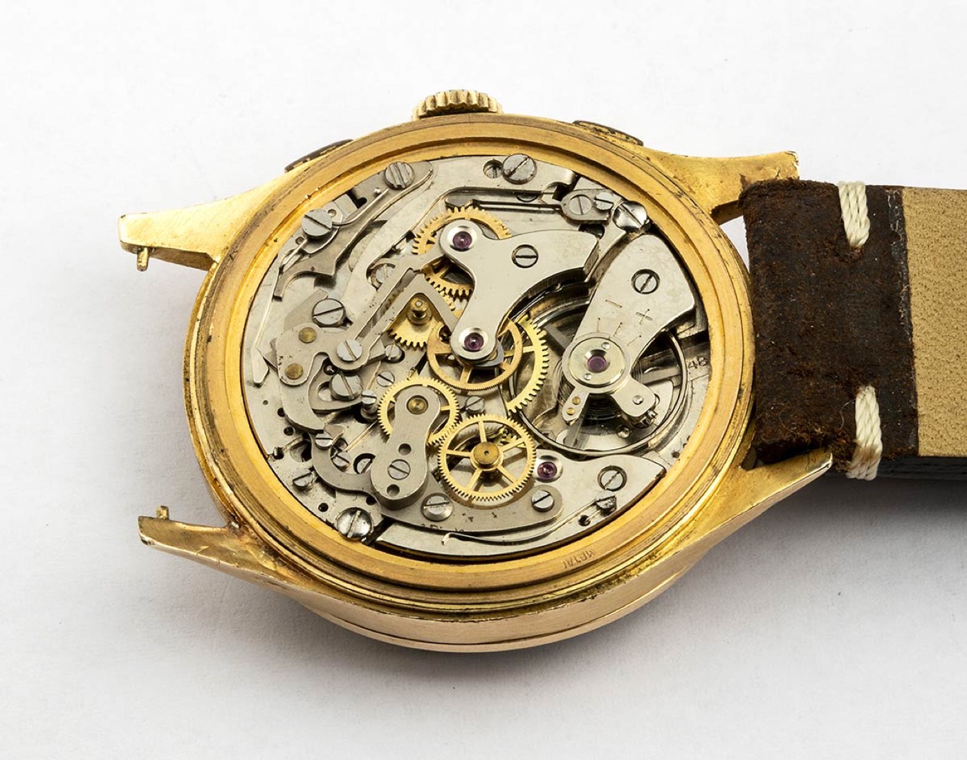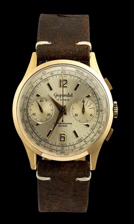 in oro rosa 18k e quadrante color argento. Movimento cronografo a cartica manuale ref. 1375 L 248 e vetro plexiglass. Fibbia in metallo e cinturino in pelle. Diametro della cassa 38 mm.