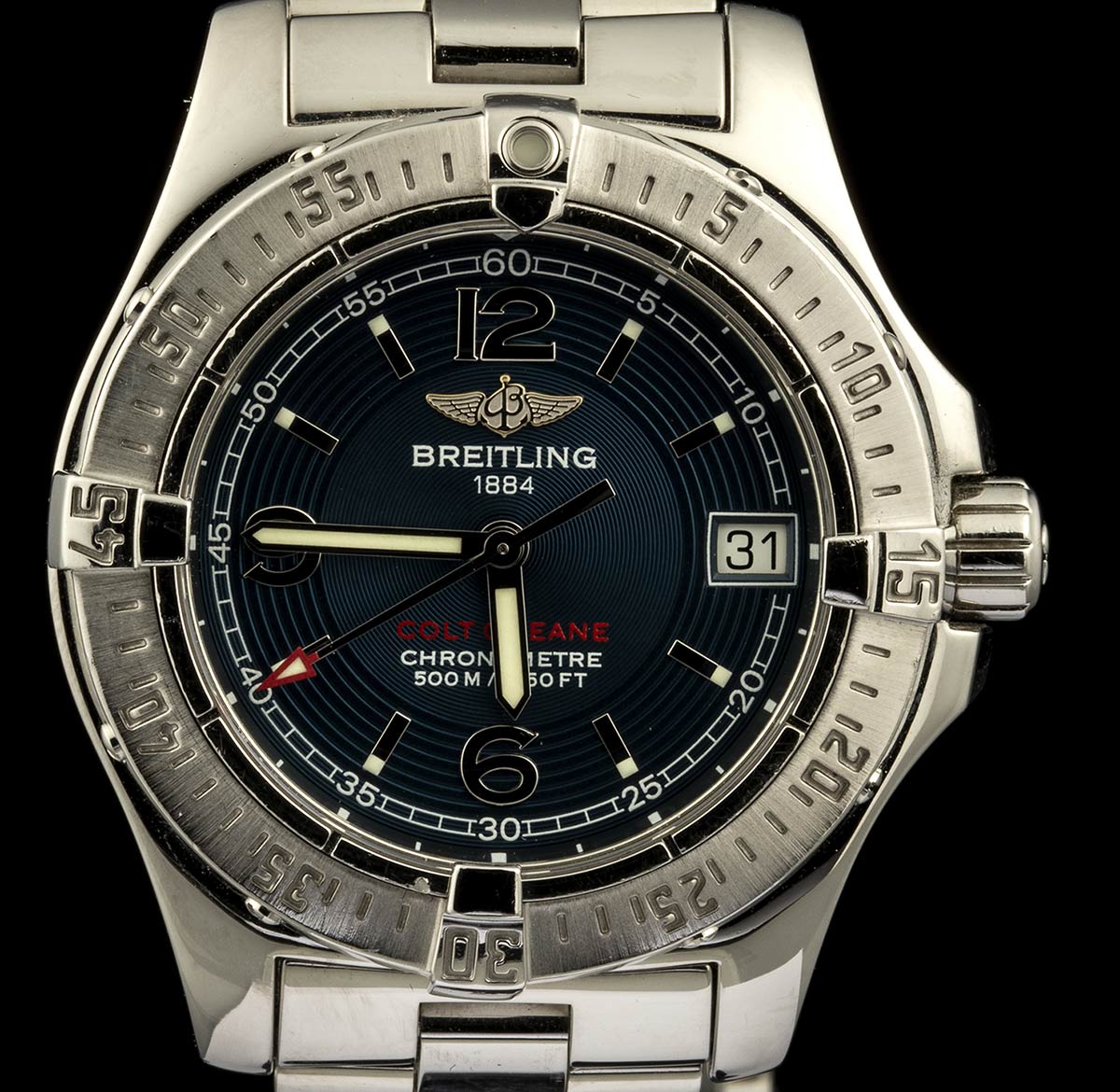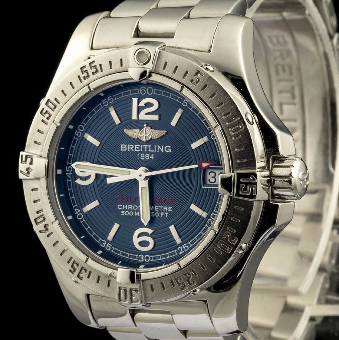 in acciaio con quadrante blù con indici bastoni e numeri arabi, datario alle 3 e vetro zaffiro. Movimento al quarzo Diametro della cassa 33 mm, bracciale con chiusura deployante, lunghezza 19 cm. Usato raramente.
