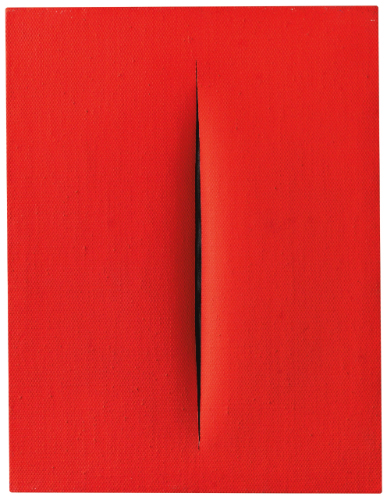 LUCIO FONTANA 1899 - 1968 CONCETTO SPAZIALE, ATTESA signed, titiled and inscribed on the reverse, waterpaint on canvas, executed in 1964-65 firmato, intitolato e iscritto sul retro Domenica-gennaio 19 febbraio idropittura su tela cm 35x27 Eseguito nel 1964-65 PROVENANCE Galleria della Steccata, Parma Collezione Lino Montali, Parma Collezione Pier-Luigi Mercadanti, Parma Acquistato dall'attuale proprietario negli anni Ottanta EXHIBITED Parma, Galleria Consigli d'Arte, Opere del XX secolo da Collezioni Private parmensi, 1982 LETTERATURA E. Crispolti, Lucio Fontana. Catalogo generale, Milano 1986, vol. II, pag. 550, illustrato E. Crispolti, Lucio Fontana. Catalogo ragionato di sculture, dipinti, ambientazioni, Milano 2006, vol. II, pag. 735, n. 64- 65 T 24, illustrato