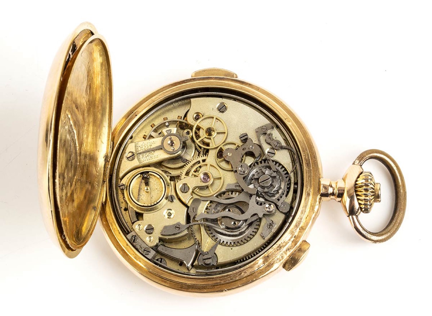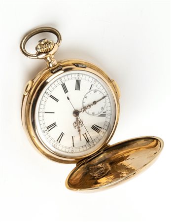 doppia cassa in oro giallo 18k, quandrante con numeri romani, secondi in basso. Un cursore laterale attiva la ripetizione mentre un ulteriore pulsante a pressione attiva le funzioni cronografiche. Movimento con scappamento ad ancora e carica a remontoir. Funzionante.