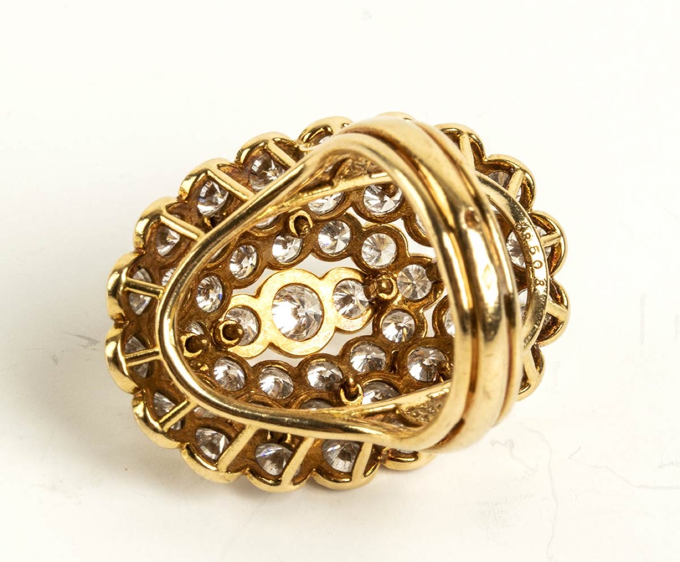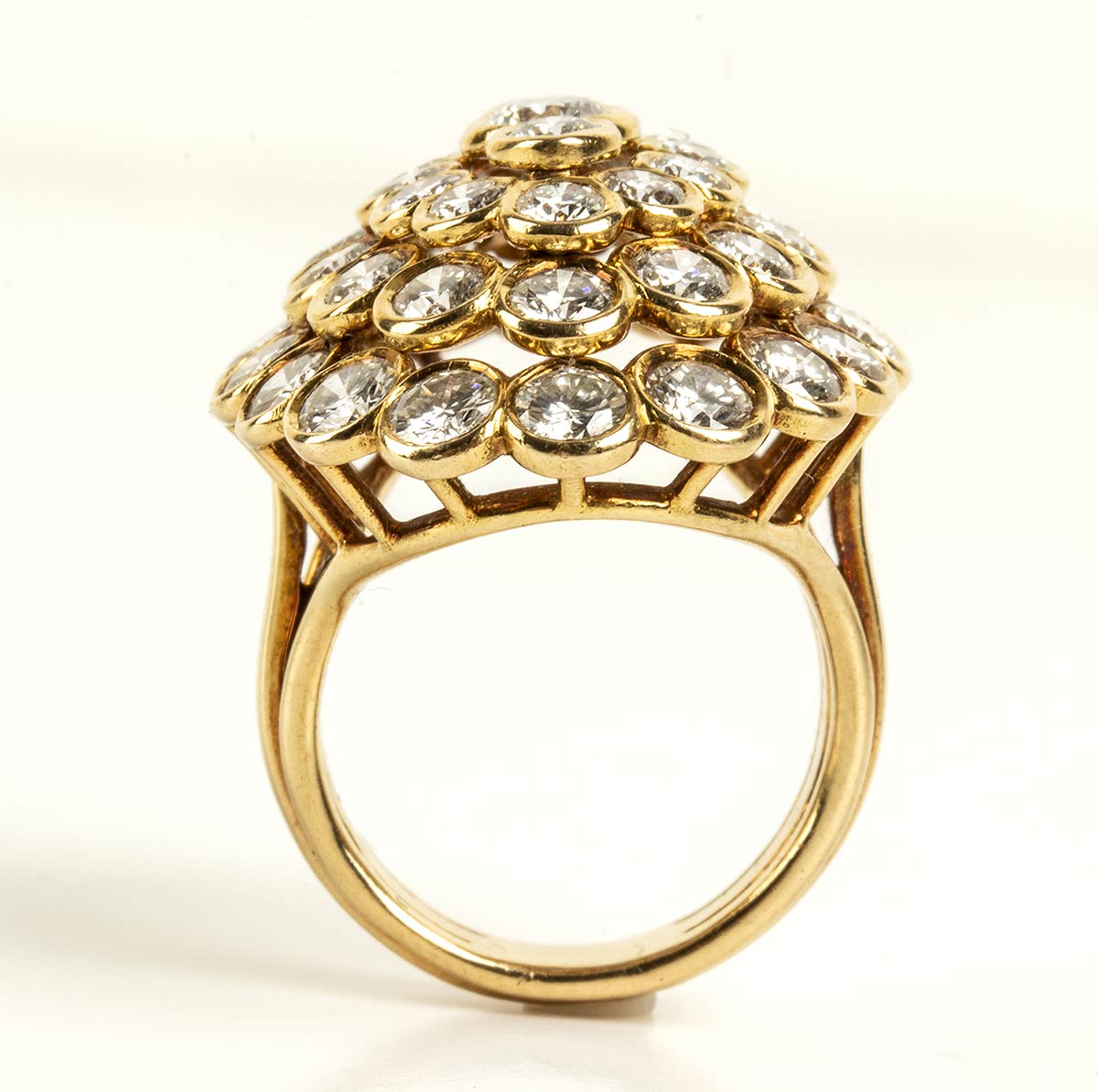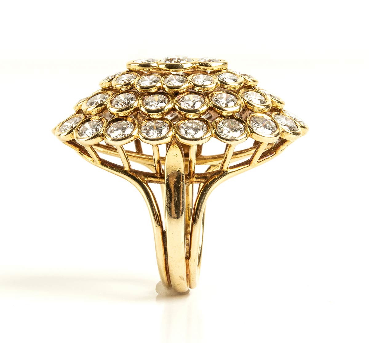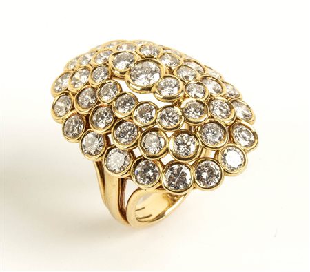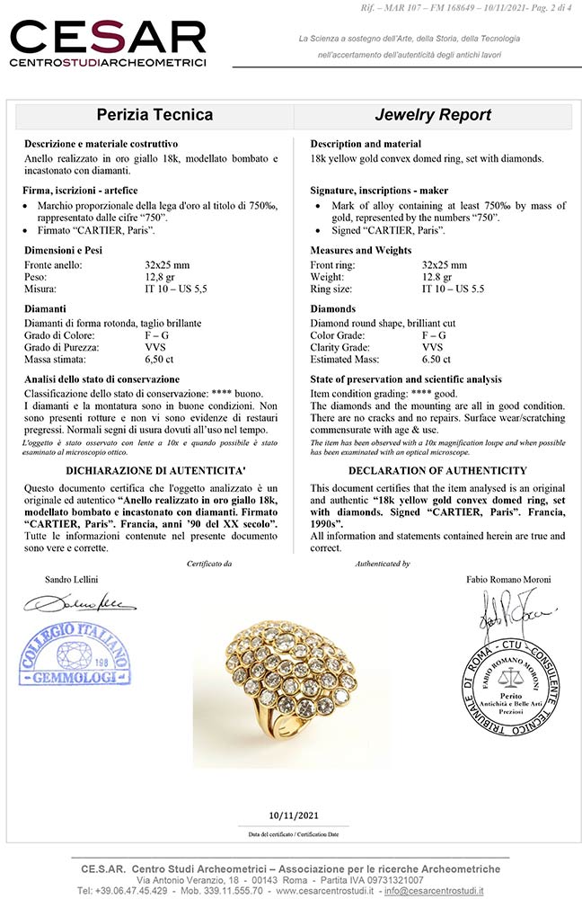 oro giallo 18k, modellato bombato, incastonato con diamanti taglio brillante 6,50 ct circa, F-G, VVS. Manifattura CARTIER anni 90'. Dimensioni fronte 32 x 25 mm. Misura IT 11 - Misura US 5,5. Peso 12,8 gr.