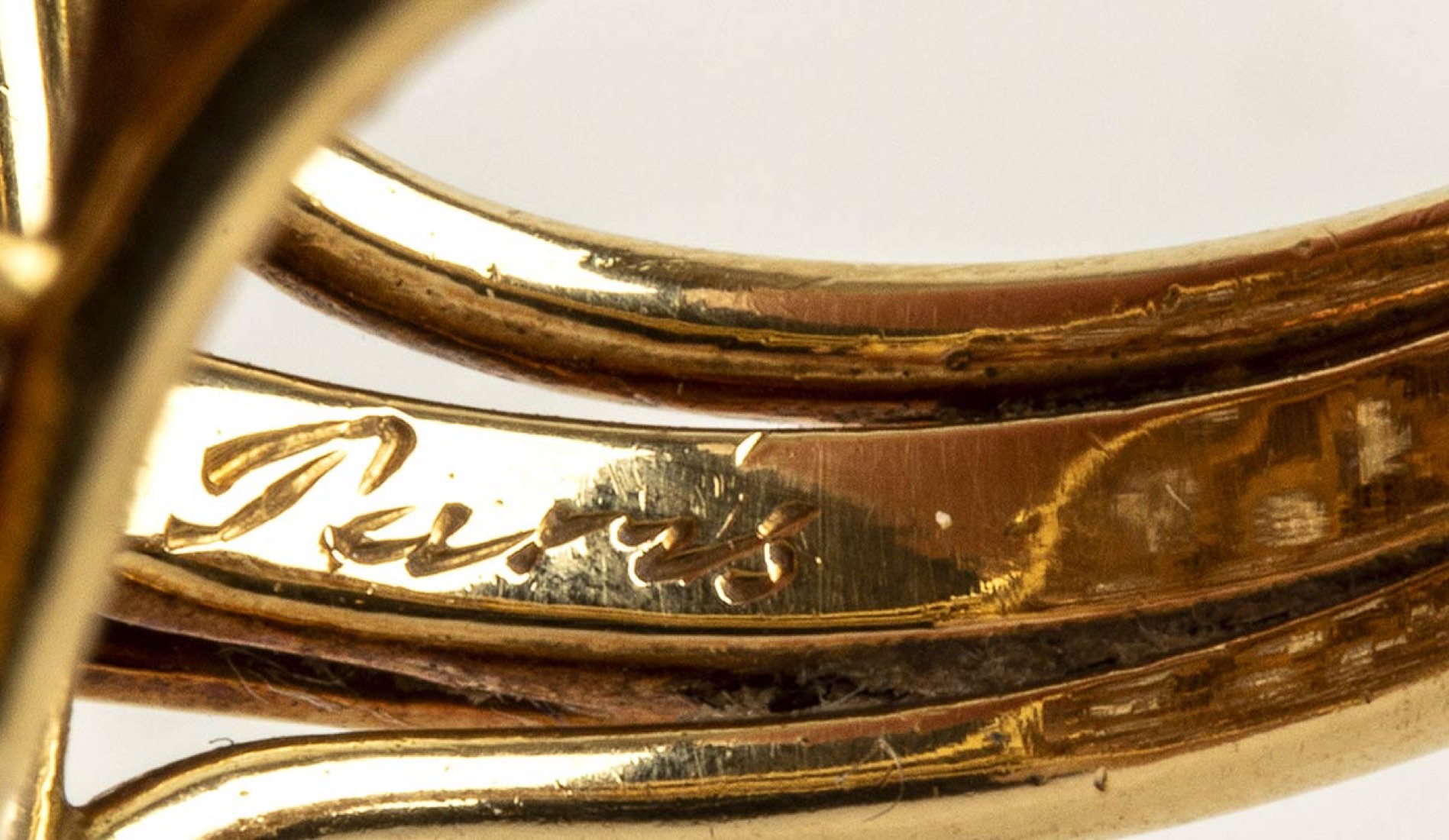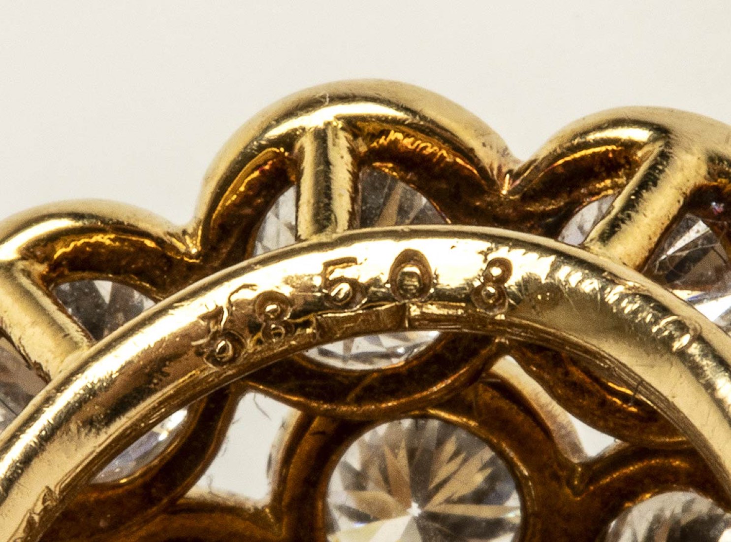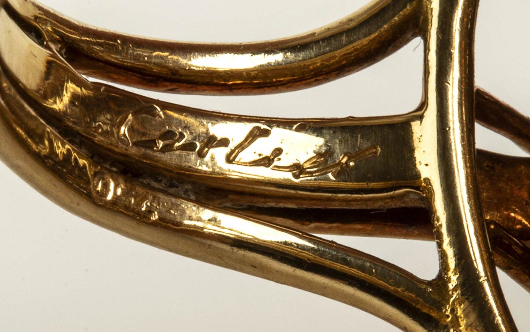 oro giallo 18k, modellato bombato, incastonato con diamanti taglio brillante 6,50 ct circa, F-G, VVS. Manifattura CARTIER anni 90'. Dimensioni fronte 32 x 25 mm. Misura IT 11 - Misura US 5,5. Peso 12,8 gr.
