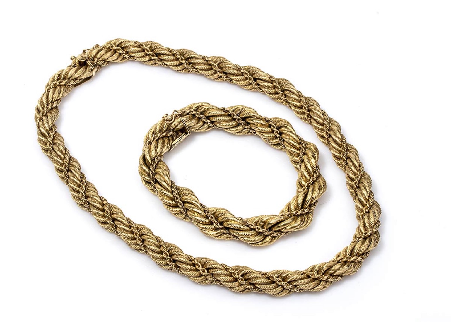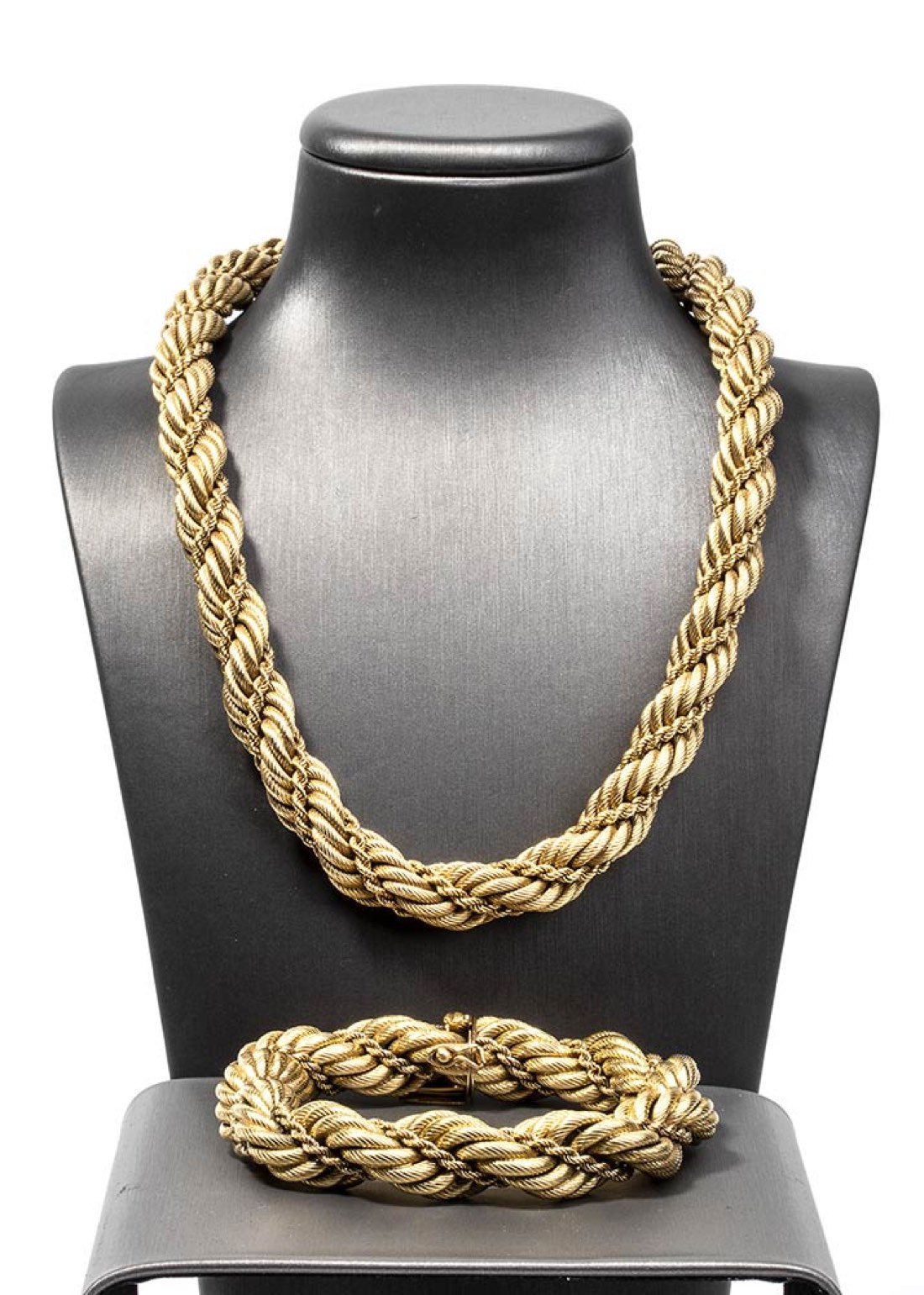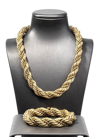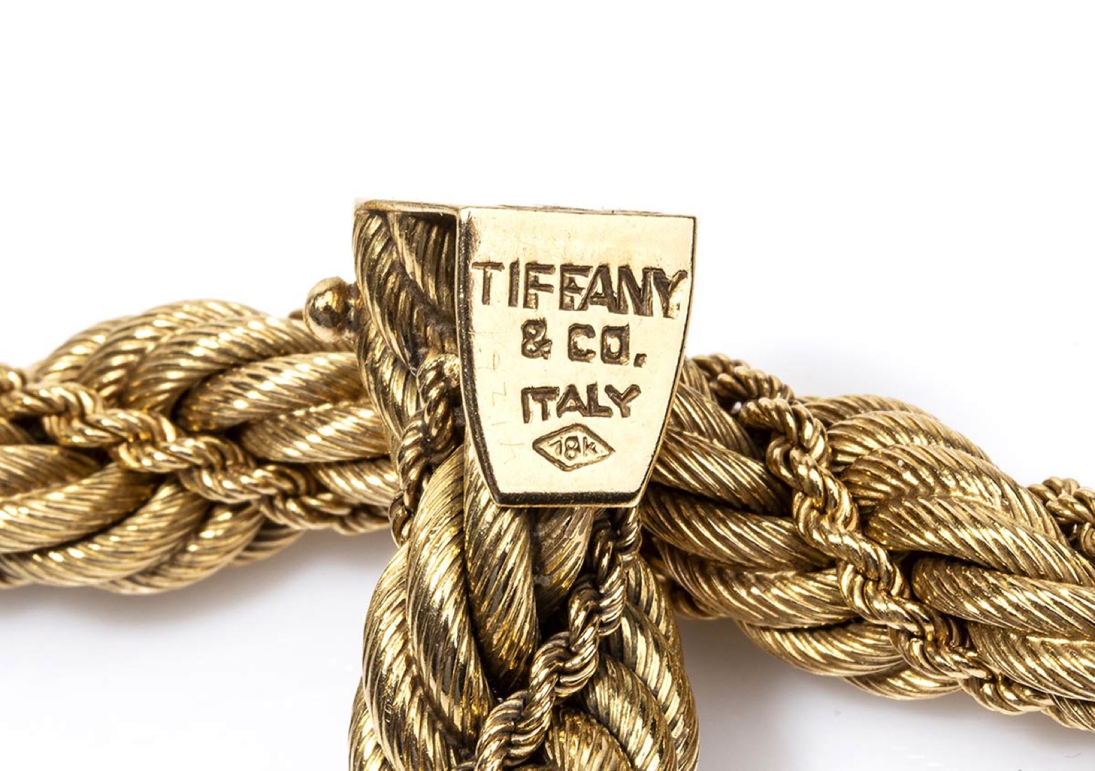 in oro 18k, modello a doppia maglia a cordonetto. Punzonati "Tiffany & Co.", "Italy", "750". Lunghezza 40,5 cm, diametro 1,1 cm. Peso 84,3 gr. Lunghezza bracciale 20 cm. Diametro bracciale 1,3 cm. Peso 51,9 gr. Stato di conservazione: ***** eccellente.