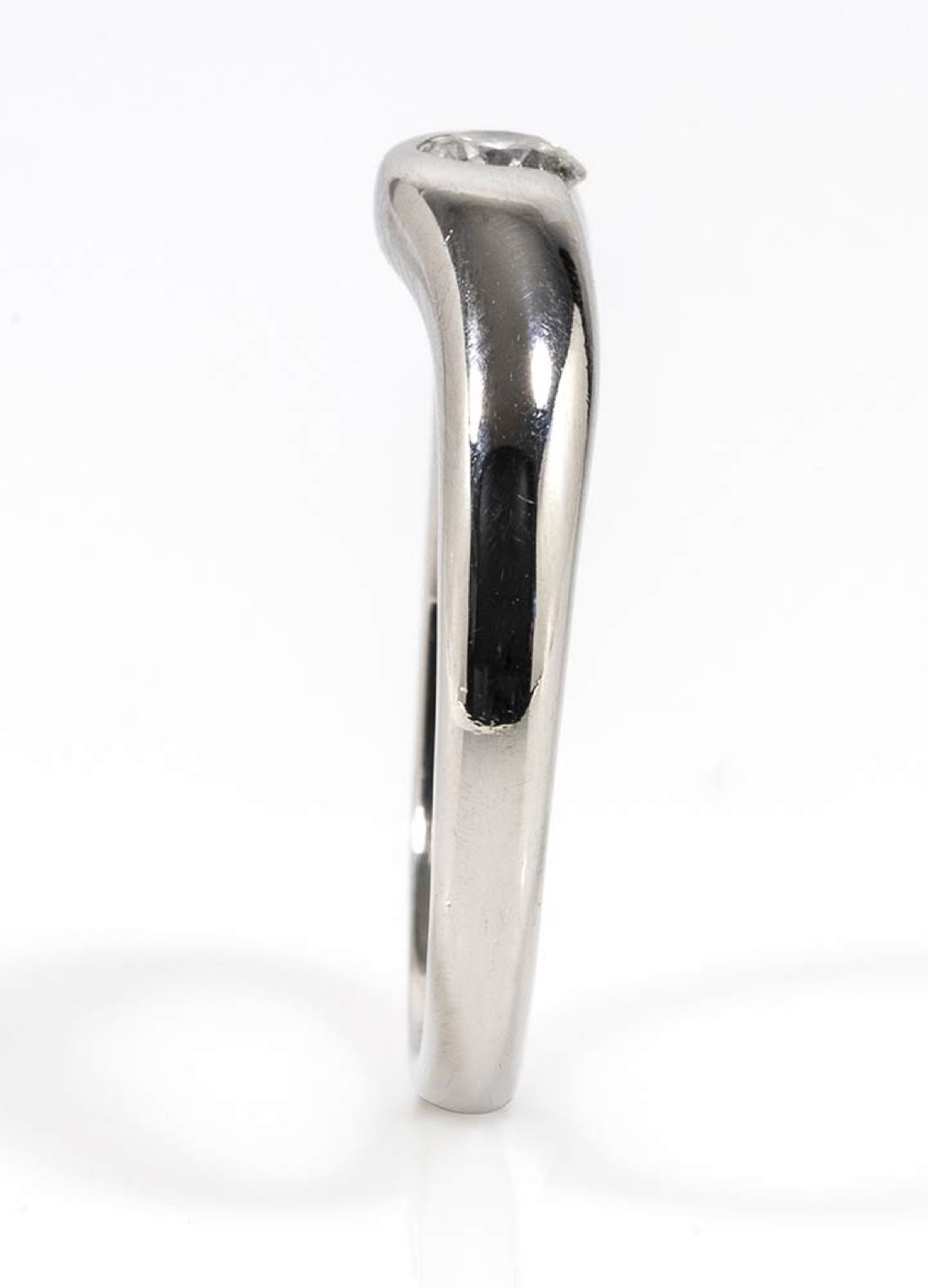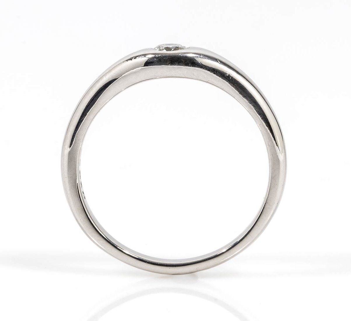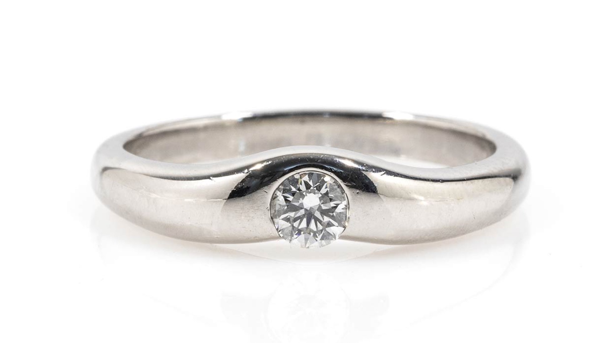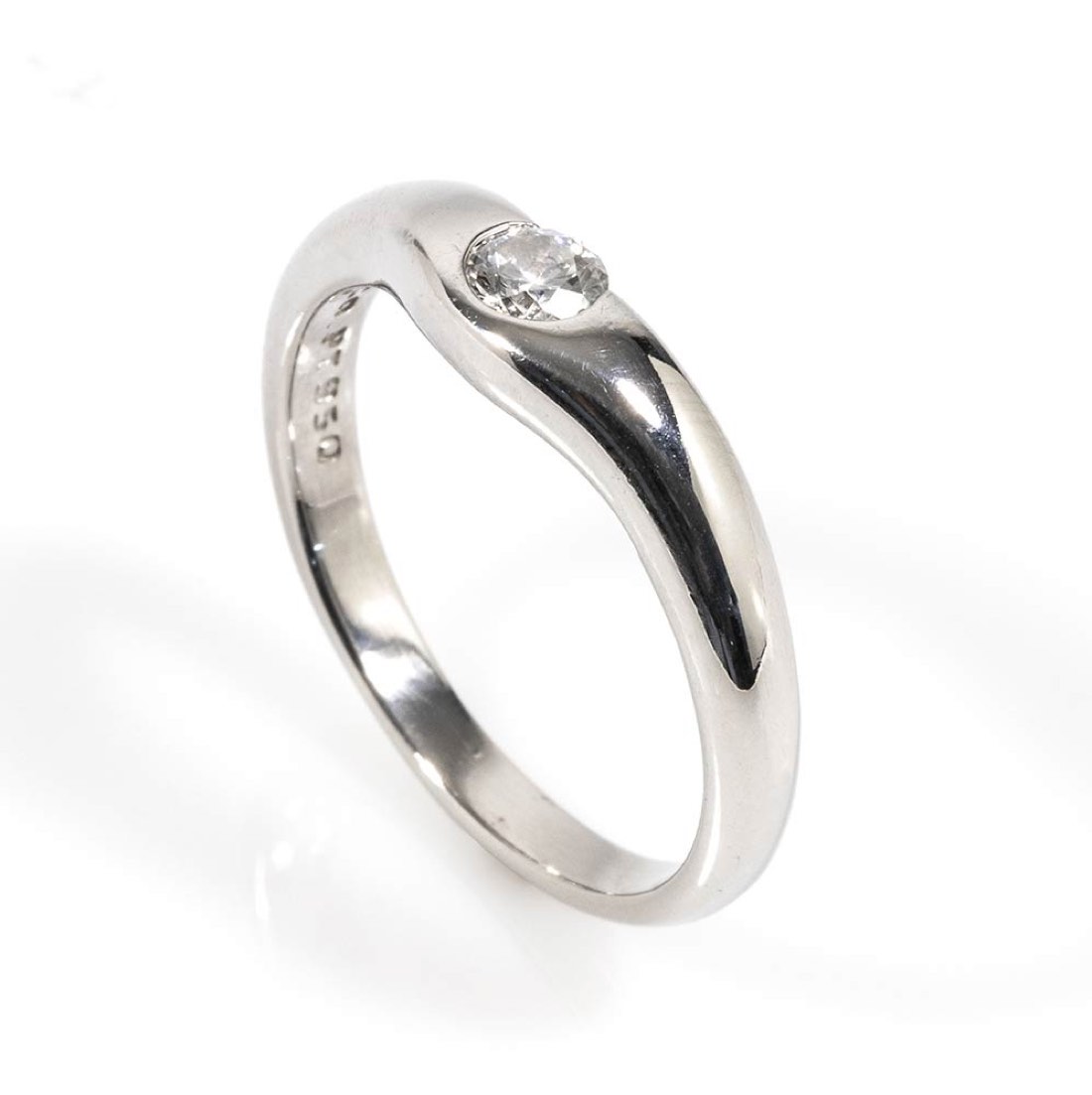 in platino 950 con diamante taglio brillante 0,18 ct circa, E-F, IF-VVS. Realizzato da TIFFANY & CO, collezione ELSA PERETTI. Larghezza 6 mm. Misura IT 16 - Misura US 7,5. Punzonato "TIFFANY & CO.", "PT 950", "345 MI" e "PERETTI". Peso 6,8 gr. Stato di conservazione: ***** eccellente.