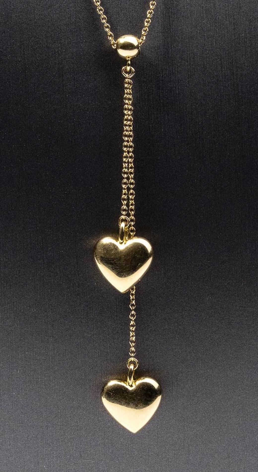 oro giallo 18k con due pendenti a forma di cuore. Punzonata "Tiffany & Co." e "750 ". Lunghezza 40 cm. Peso 8,1 gr. Stato di conservazione: ***** eccellente.