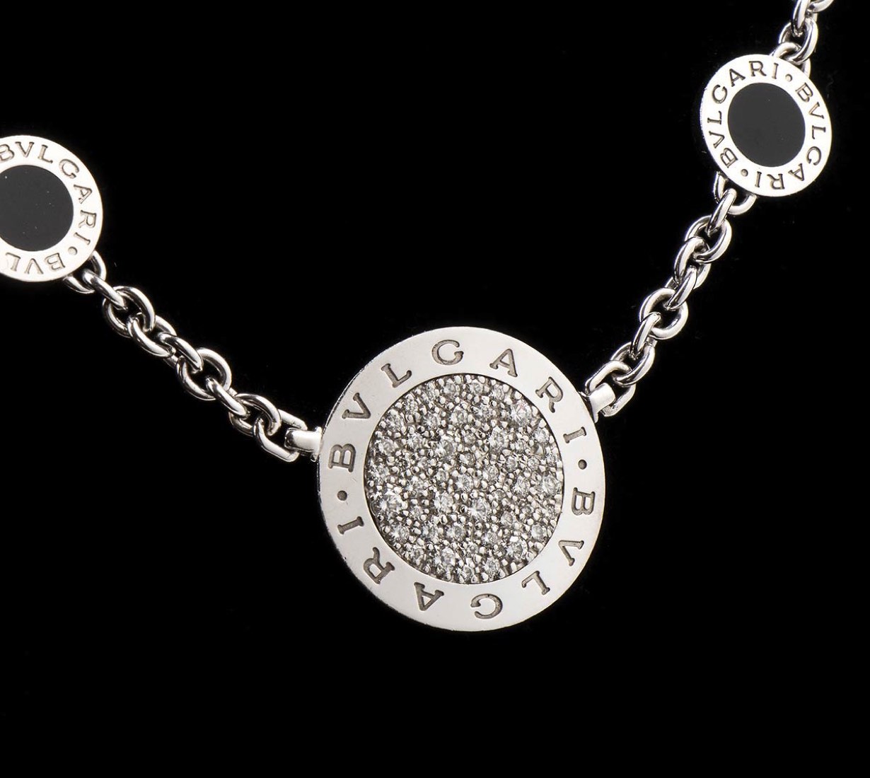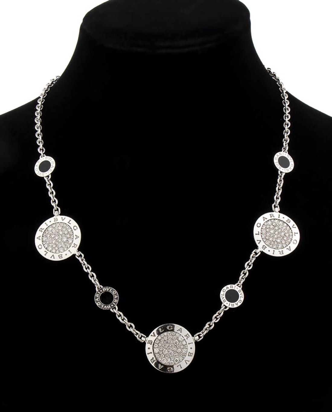 oro bianco 18k, collezione Bvlgari-Bvlgari, 3 dischi incastonati con pavé di damanti contornati dal logo Bvlgari-Bvlgari e 3 dischi reversibili incastonati con onice e contornati dal logo Bvlgari-Bvlgari. Diamanti di forma rotonda taglio brillante 3,50 ct circa, F-G, VVS. Firmato "Bvlgari" e punzonato "750", "1498 AR" e "Made in Italy". Lunghezza 48 cm. Peso 38,4 gr. Stato di conservazione: ***** eccellente.