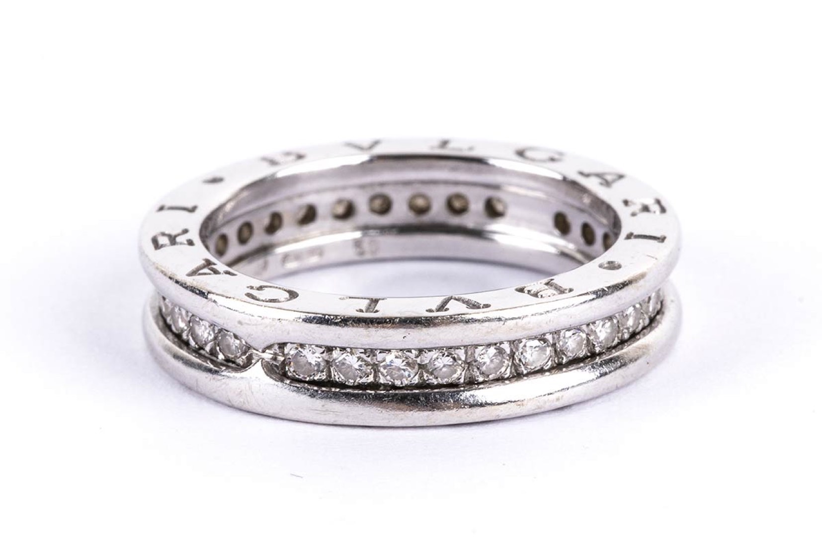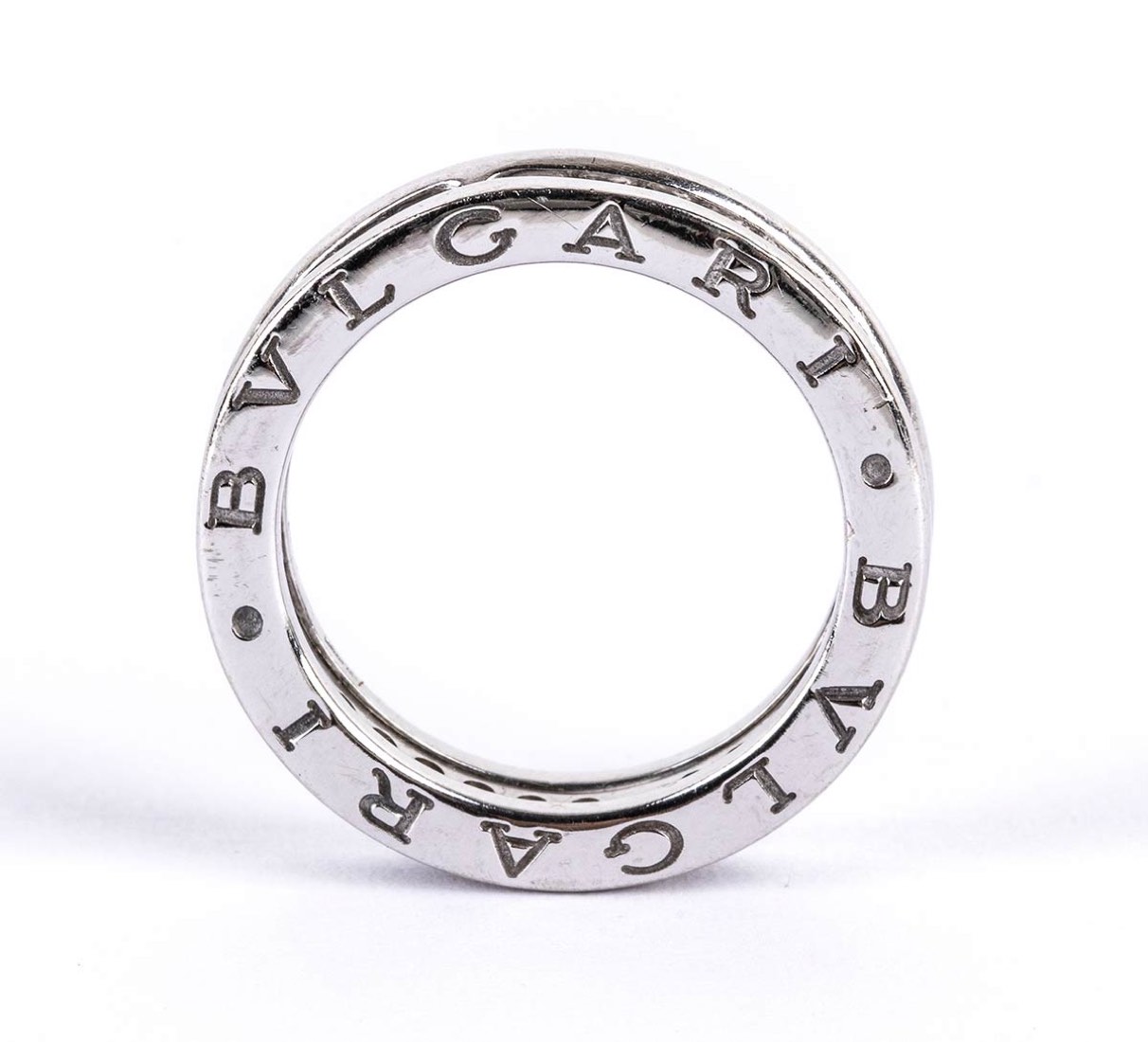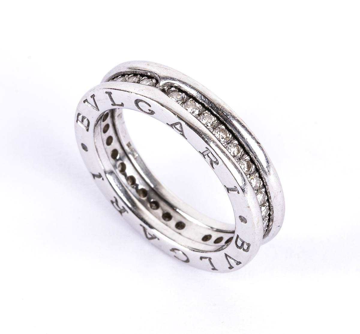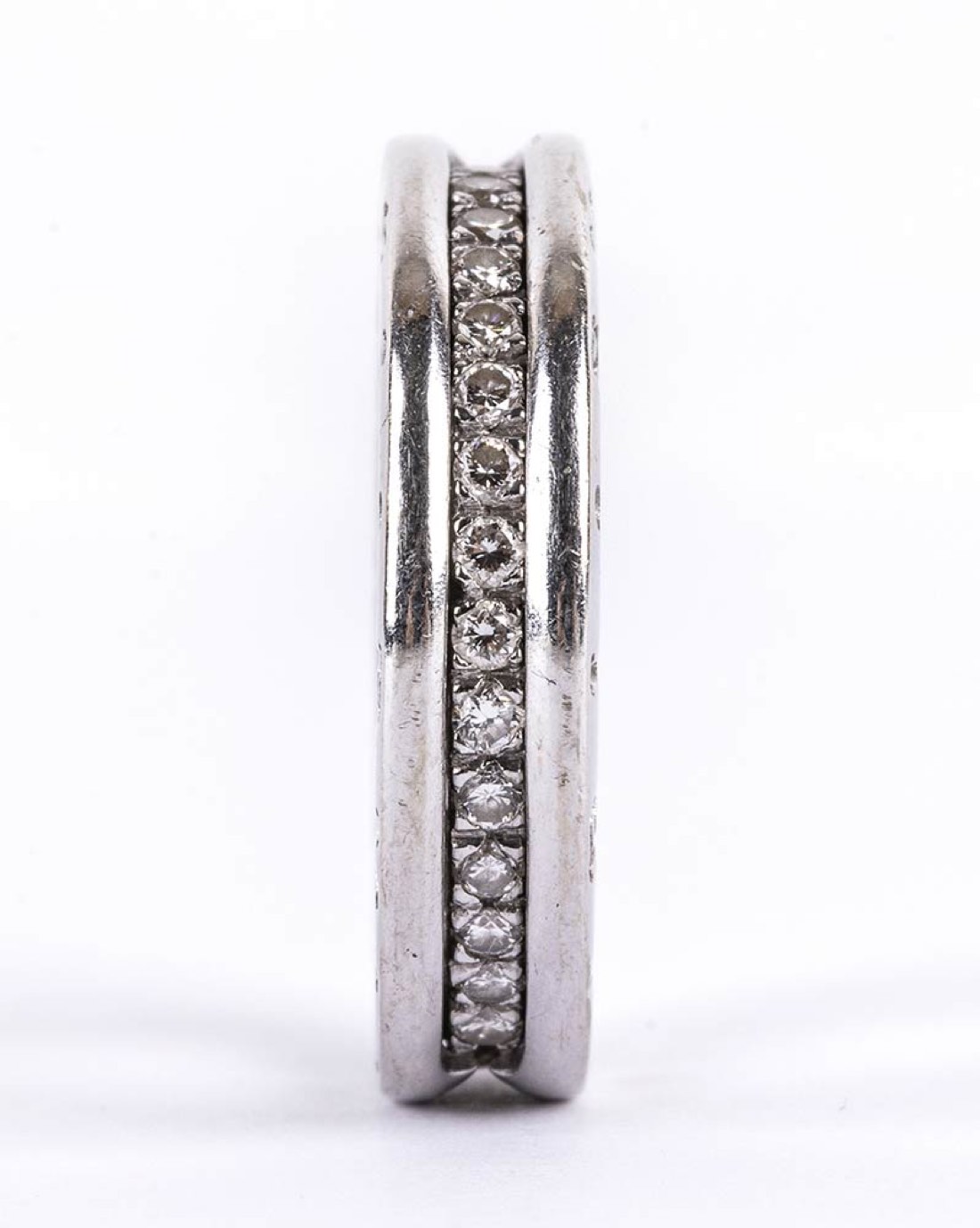 oro bianco 18k, incastonato con pavé di diamanti 0,45 ct circa, F-G, VVS. Manifattura BVLGARI, collezione" B zero", ispirata al Colosseo. Misura IT 10, misura US 5. Punzonato "10 MI", "MADE IN ITALY", "750"e "BVLGARI". Peso 5,9 gr. Stato di conservazione: ***** eccellente.