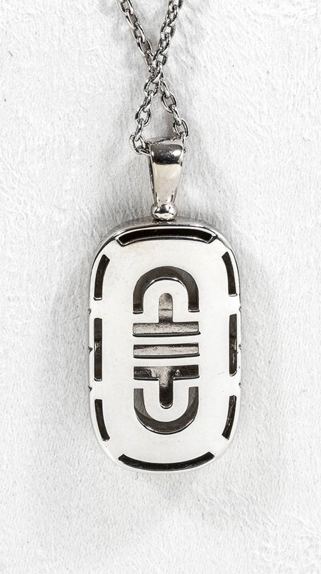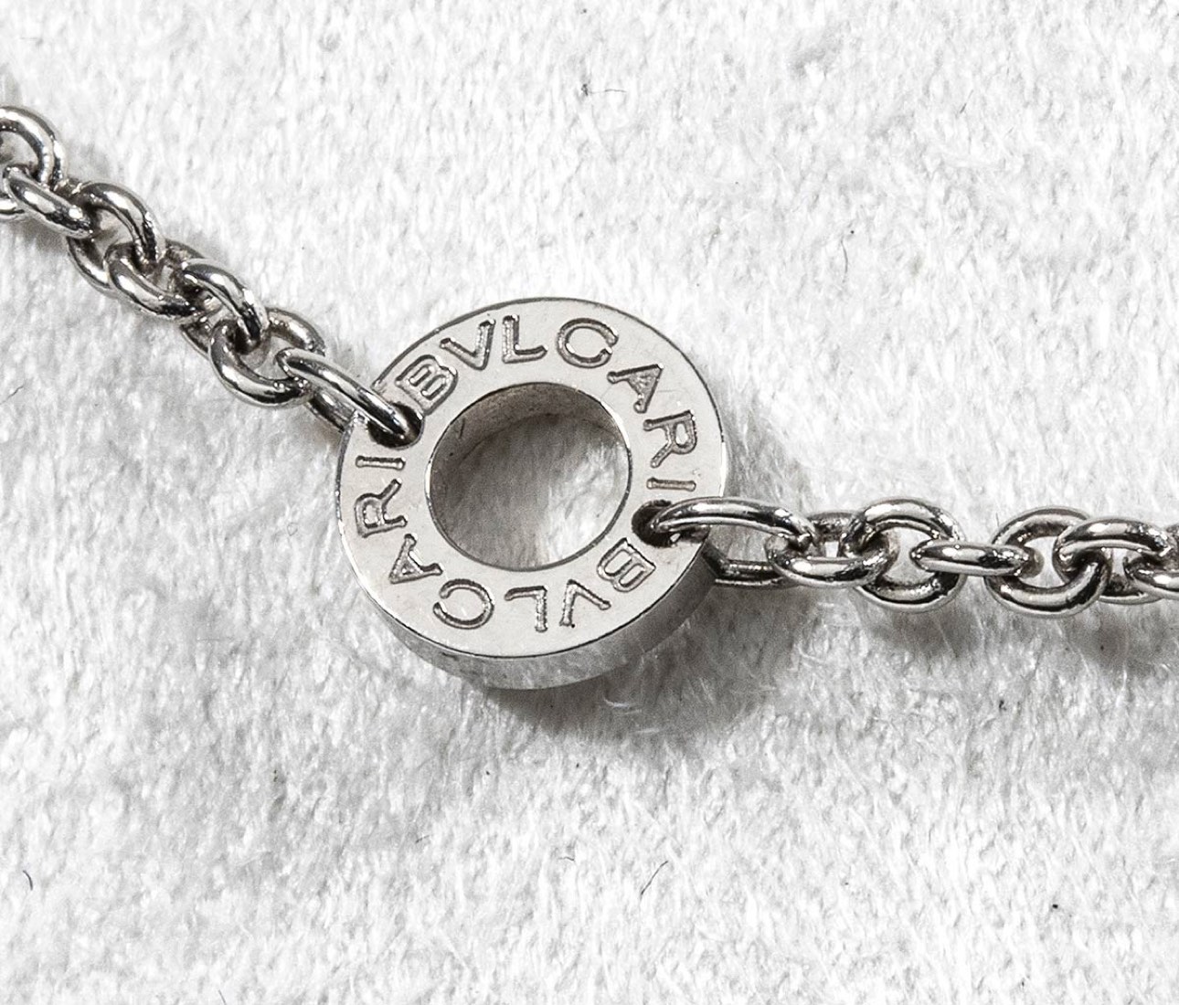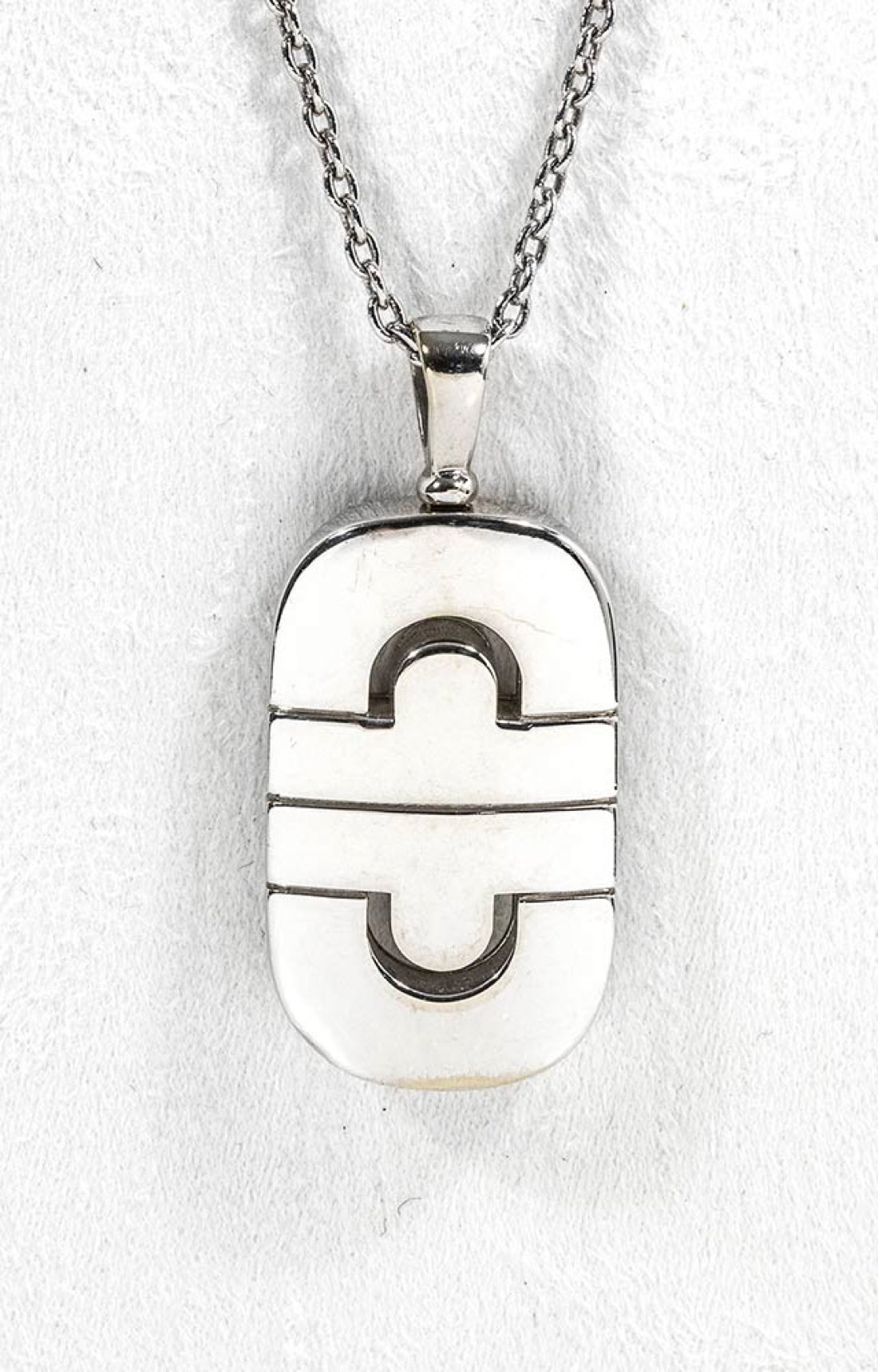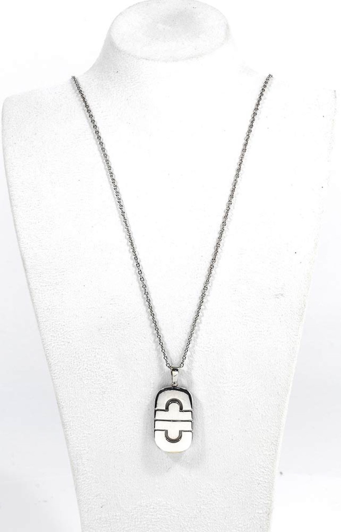 oro bianco 18k, manifattura BVLGARI, dalla collezione "PARENTESI". Lunghezza regolabile da 41 a 46 cm. Dimensioni pendente 15 x 26 mm. Punzonata: "750", "BVLGARI", "Made In Italy" e "2337AL". Peso 15,9 gr. Corredato con scatola originale. Stato di conservazione: ***** eccellente.