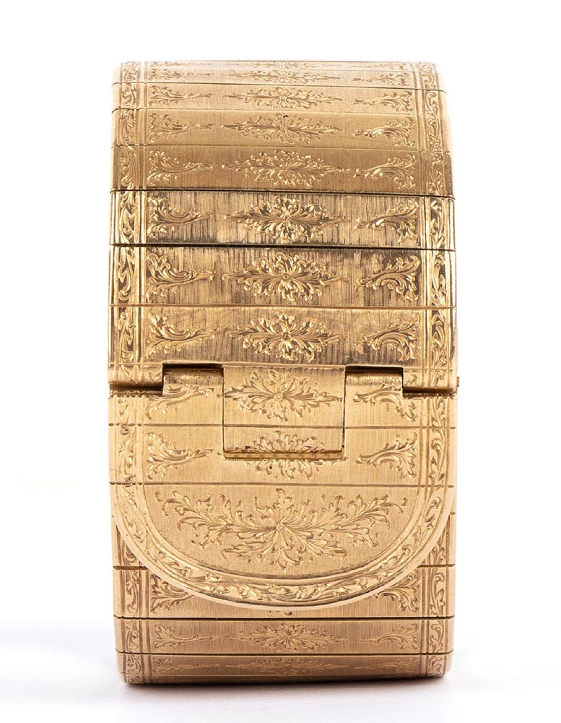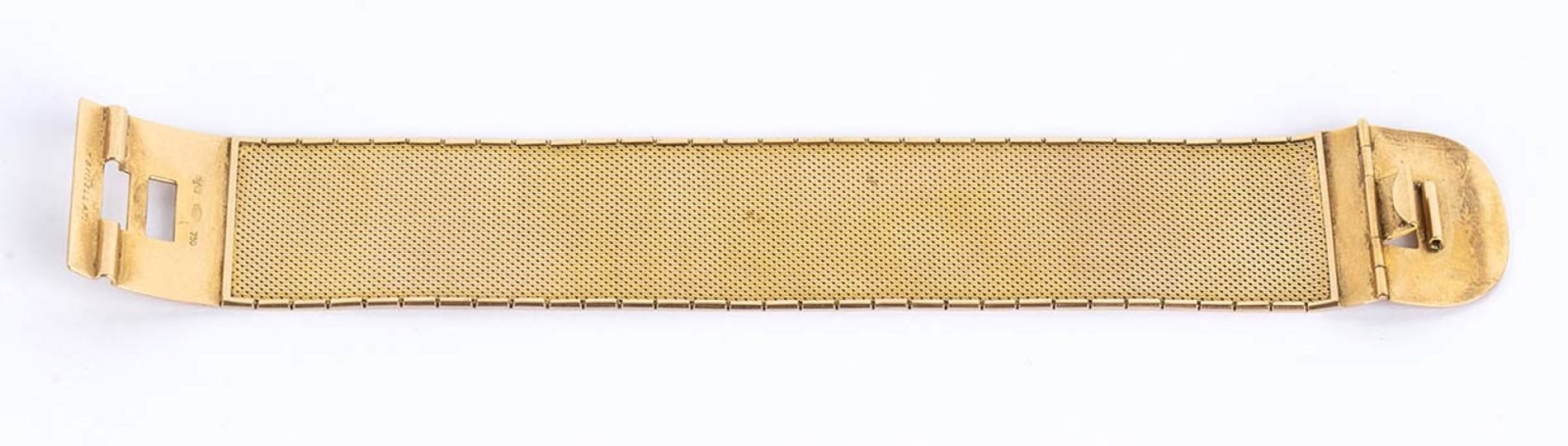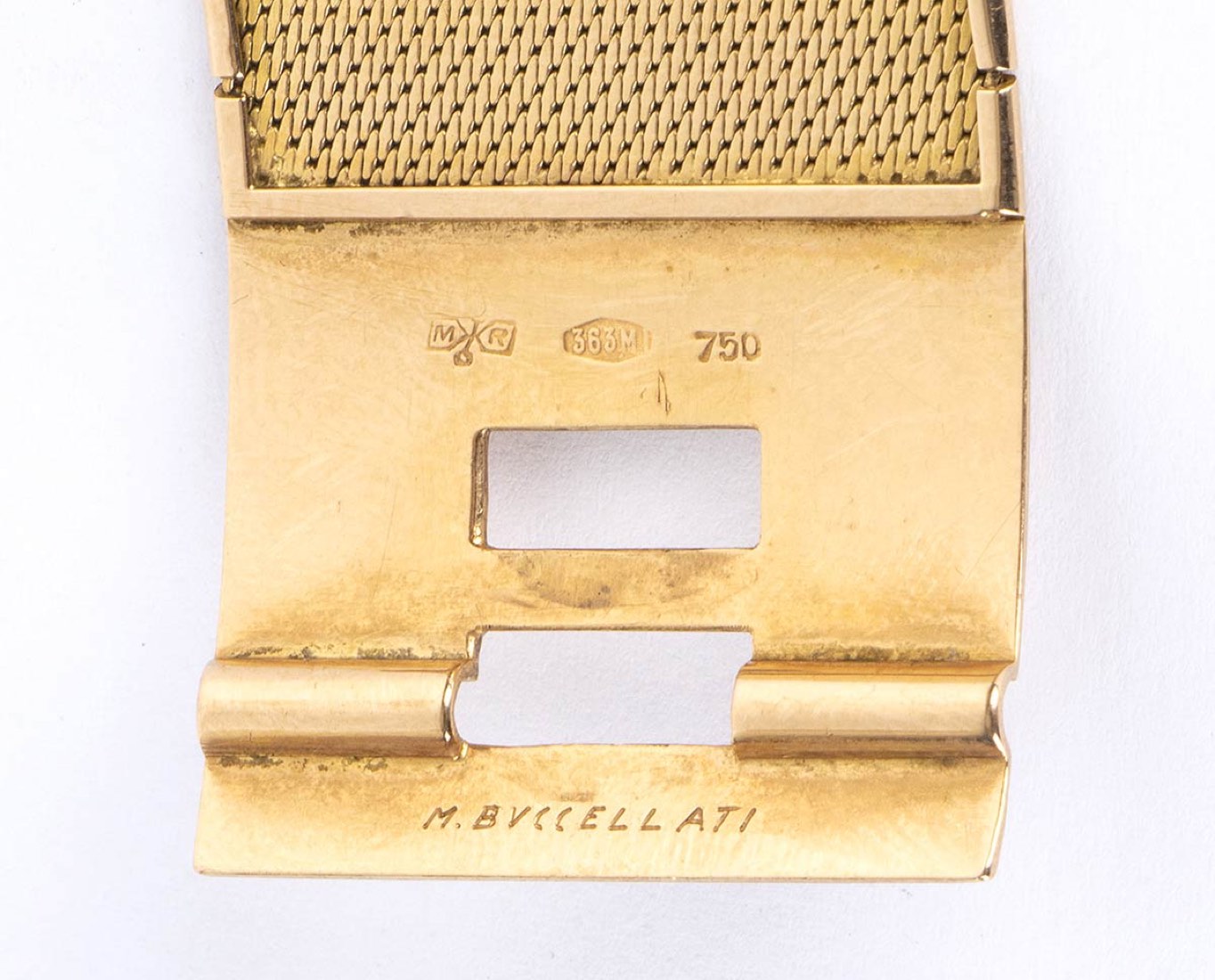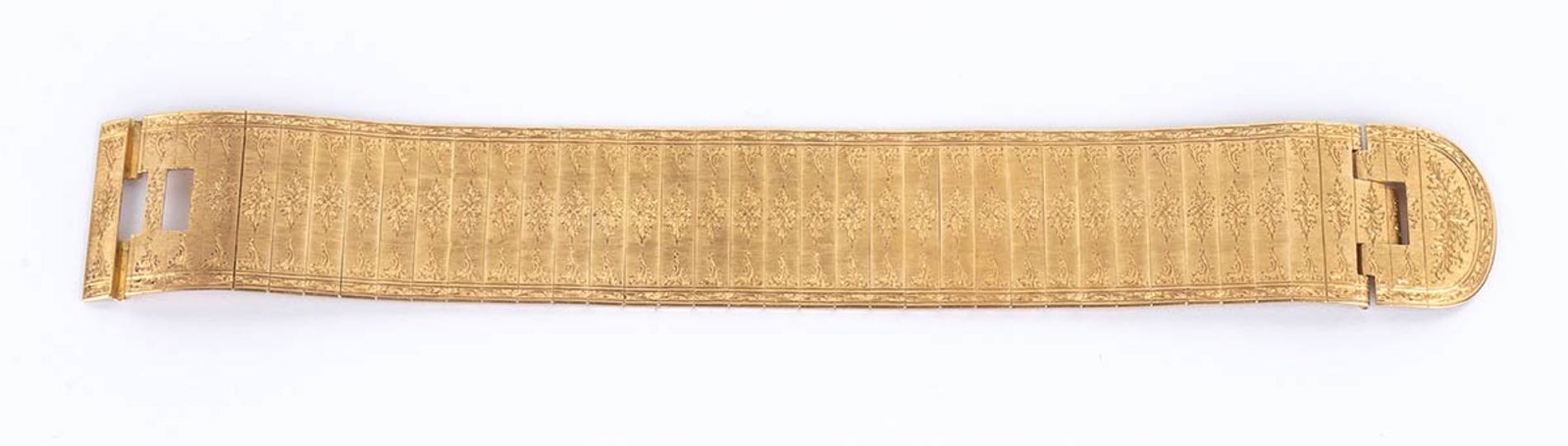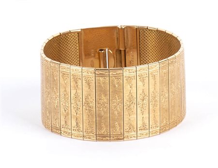 in oro giallo 18k, finemente inciso a "rigato" e motivi vegetali. Firmato "M. BUCCELLATI". Lunghezza 21 cm. Larghezza 3 cm. Punzonato "750" e "363 MI". Peso 87,5 gr. Stato conservazione : **** buono.