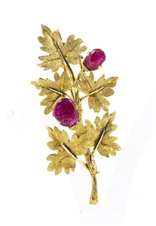 in oro giallo 18k realizzato a mano dal maestro orafo MARIO BUCCELLATI. Gioiello vintage finemente rifinita con cesellature tipiche del suo stile raffigurante un ramo di quercia ed Impreziosita con rubini incisi 2,90 ct ca. Dimensioni 62 x 26 mm. Punzonata "750" and "M. BUCCELLATI". Peso 12,73 gr. Stato di conservazione: ***** eccellente.