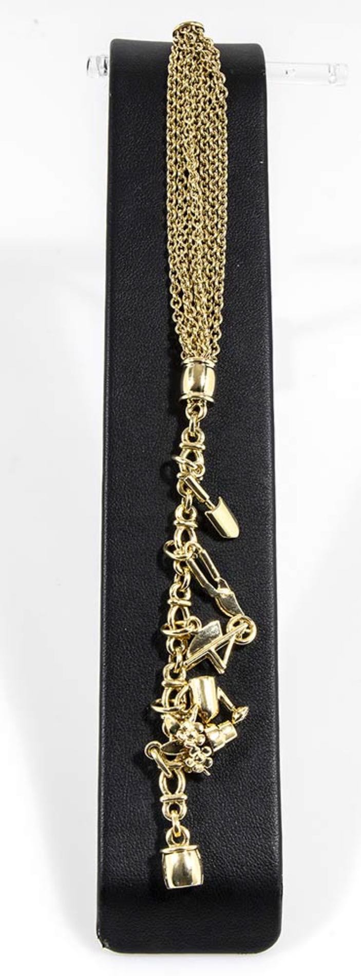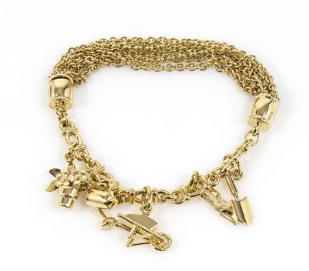 oro giallo 18k, con 7 file di maglia a catena a cui sono sospesi 5 pendenti di forme varie. Manifatura POMELLATO, Milano. Punzonato "750","469MI" e "Pomellato". Lunghezza 19 cm. Peso 42 gr. Stato di conservazione: ****** eccellente.
