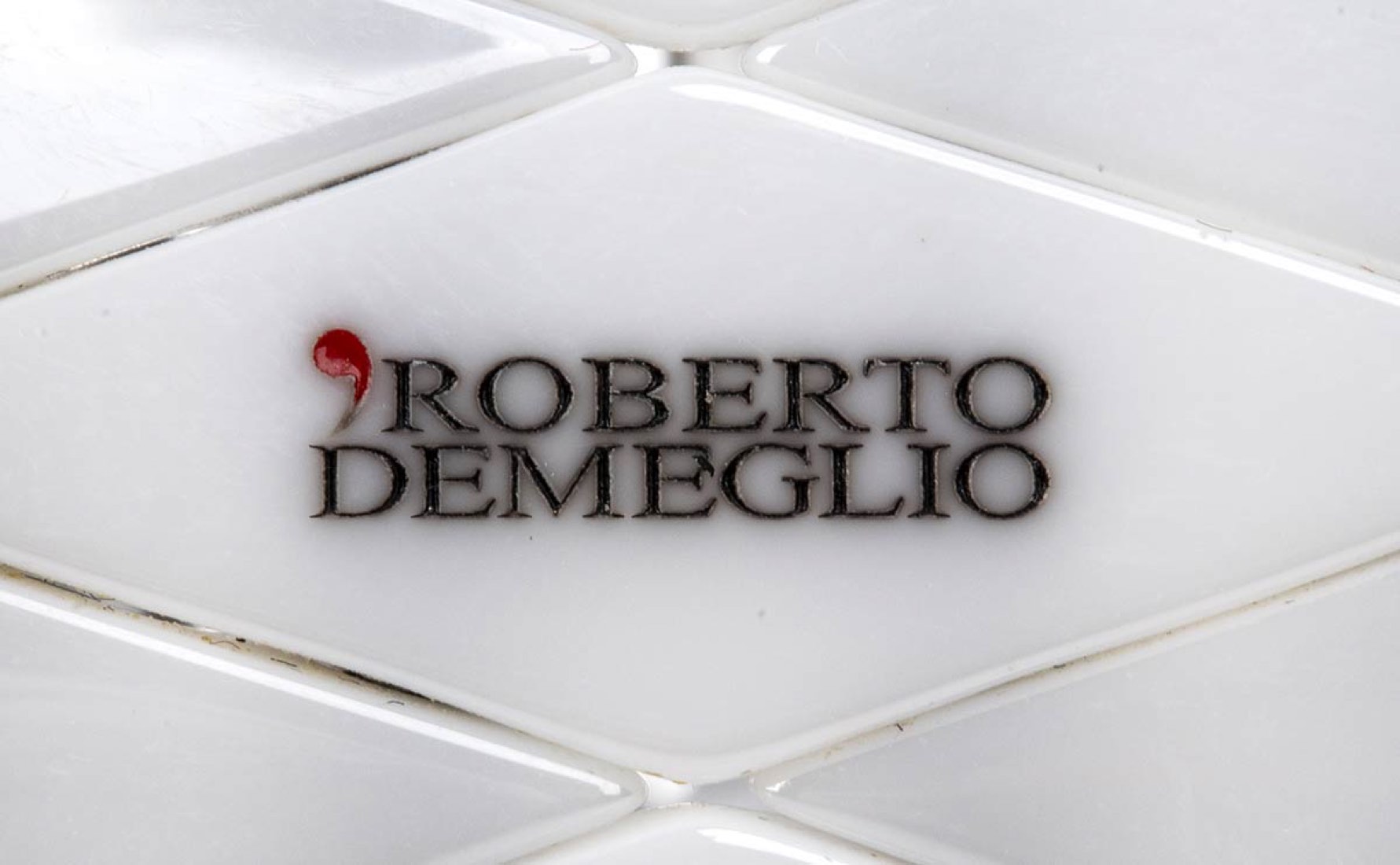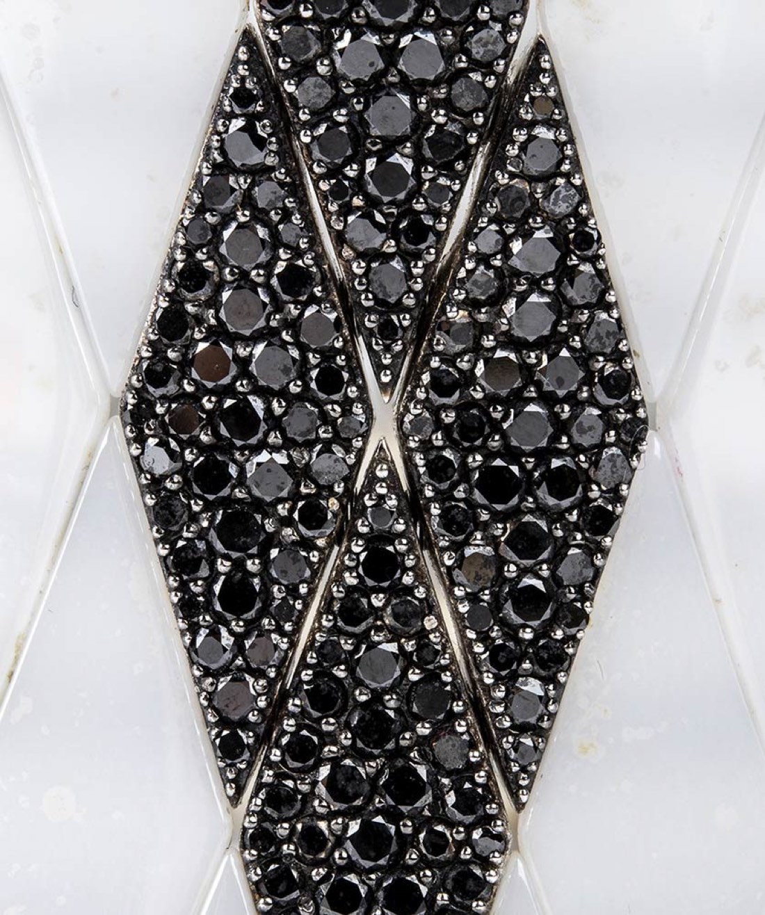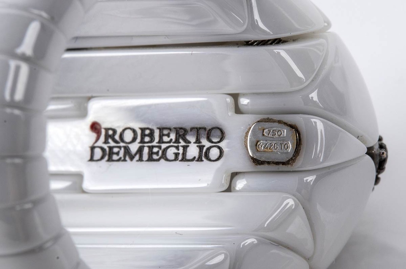 collezione "DIVA", ceramica bianca e diamanti neri; oro bianco 18k con motivo geometrico in pavé di diamanti neri 9,00 ct totali. Firmati "ROBERTO DEMEGLIO" e punzonati "750" e "426 TO". Peso anello 23 gr, peso bracciale 174 gr. Stato di conservazione: ***** eccellente.