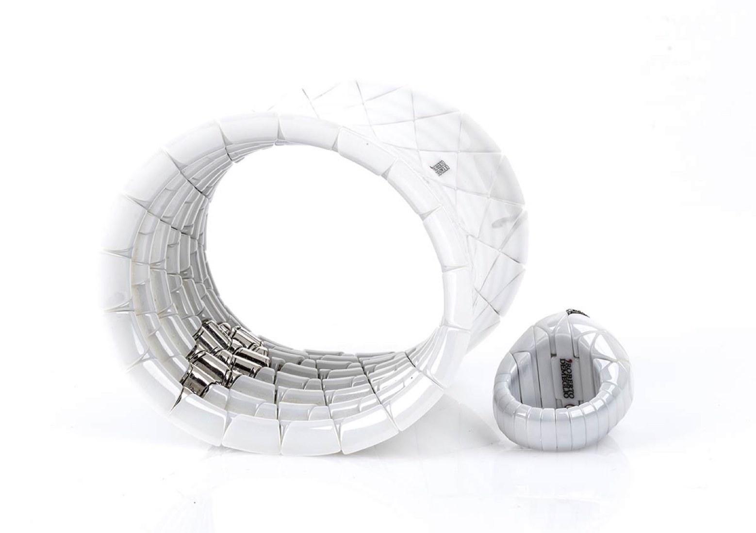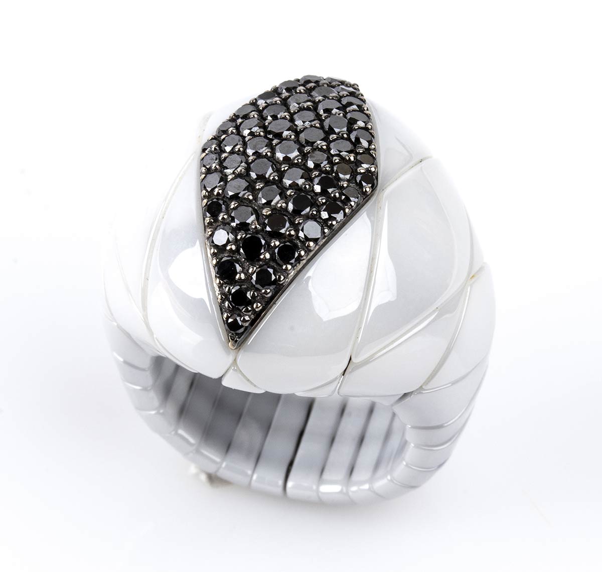 Parure bracciale ed anello elastici con ceramica bianca e diamanti neri, manifattura ROBERTO DEMEGLIO, TORINO