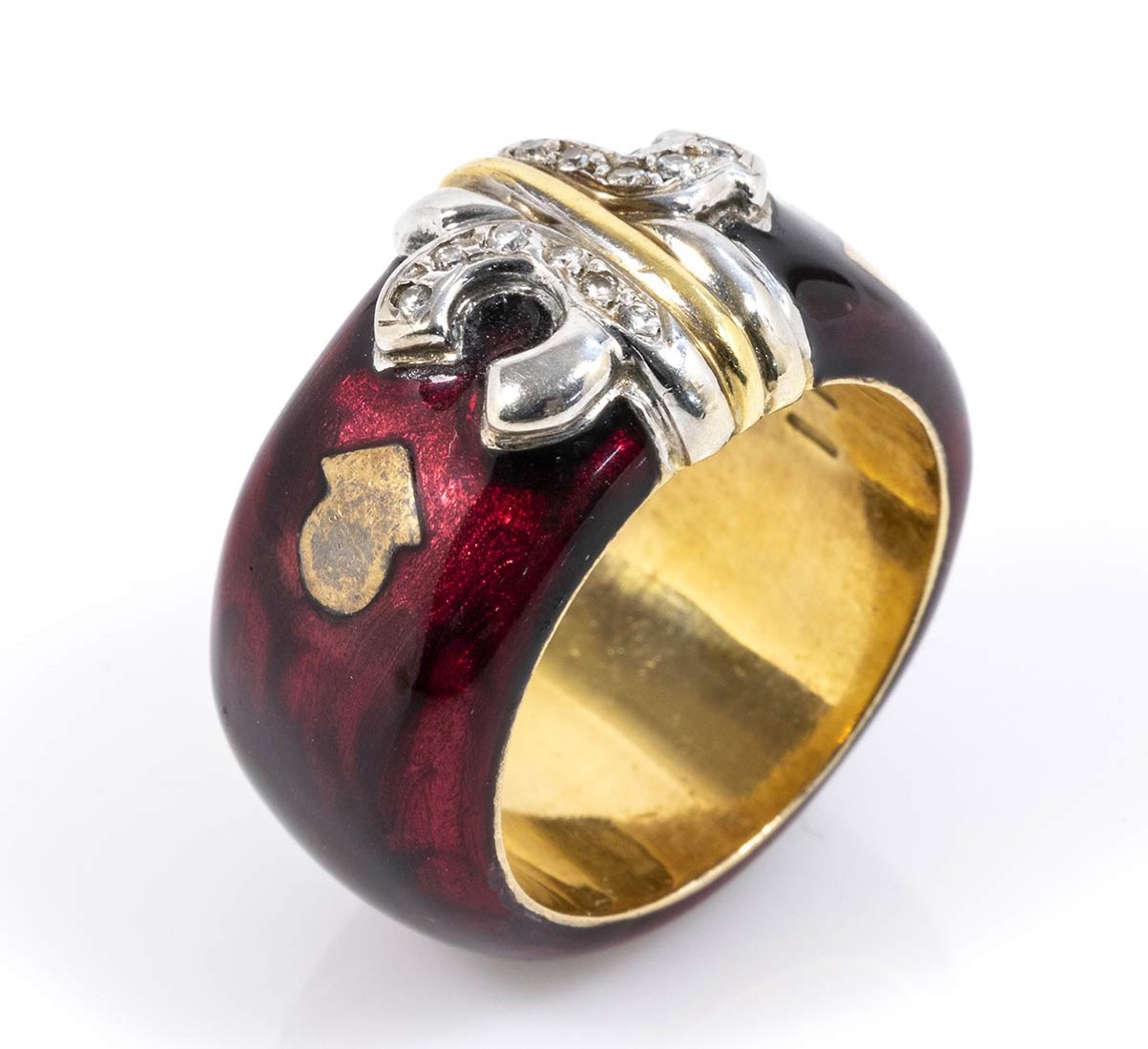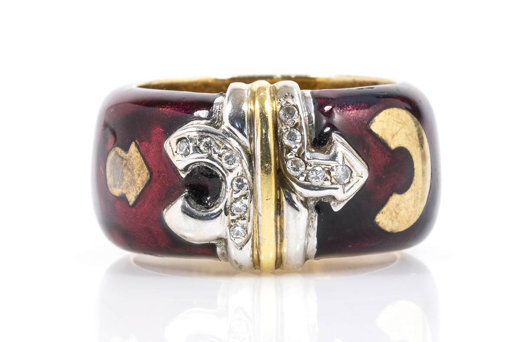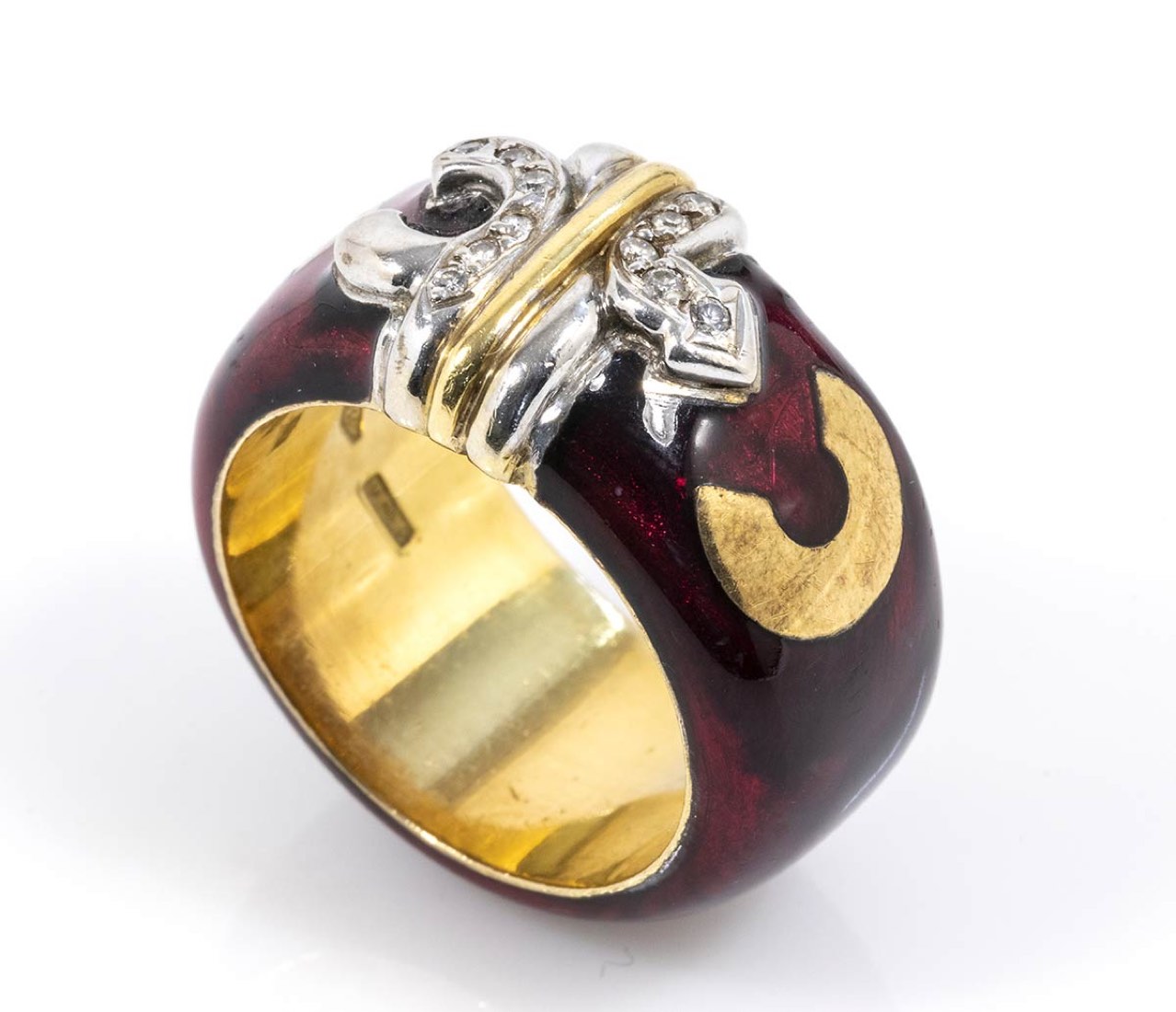 oro giallo 18k ed argento, decorato con applicazione di smalto, incastonato con diamanti taglio brillante 0,12 ct circa, H, VVS. Dimensioni fronte 24 x 13 mm. Peso 16,1 gr. Misura IT 16,5 - misura US 7,7. Stato di conservazione: ***** eccellente.