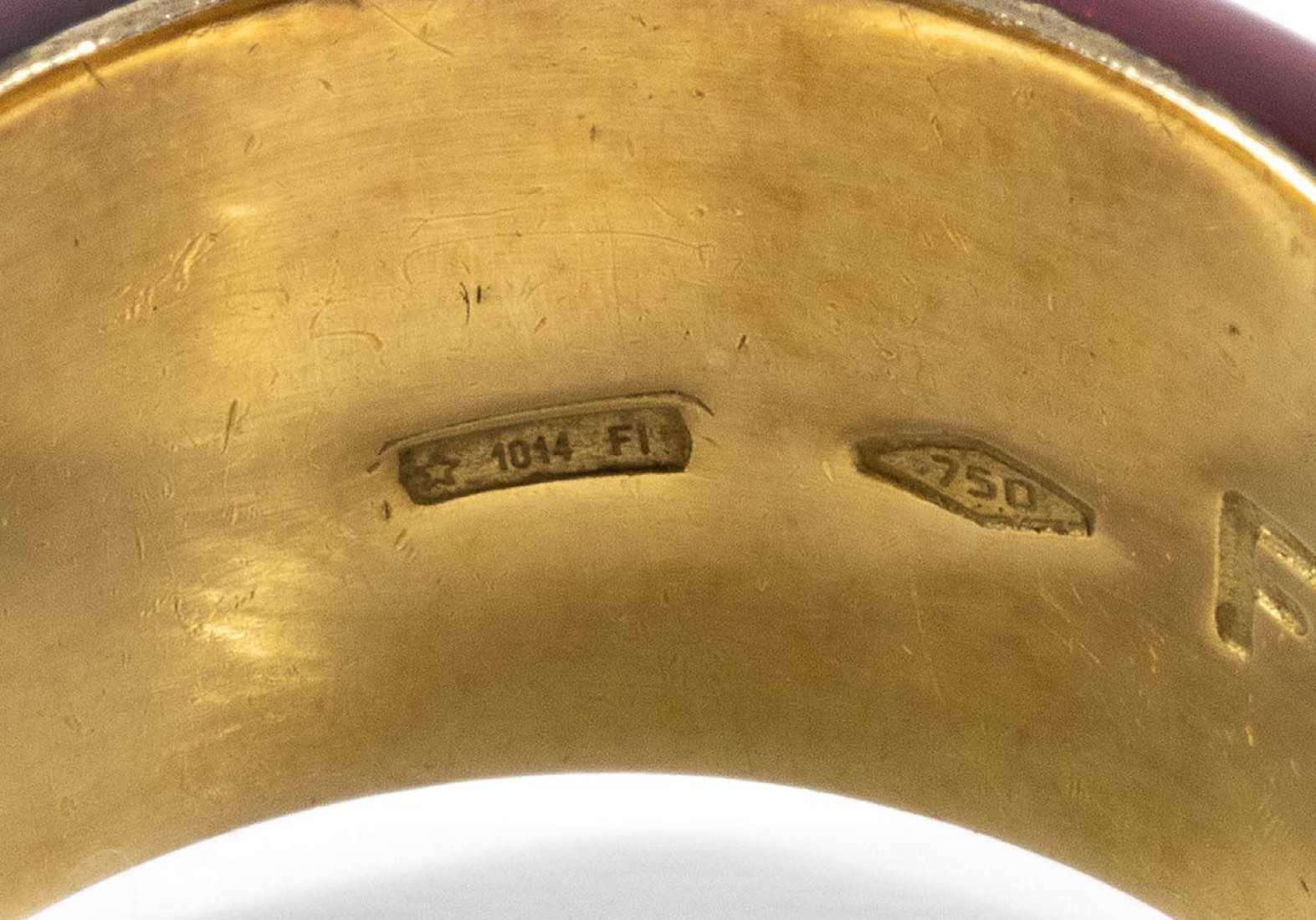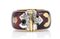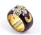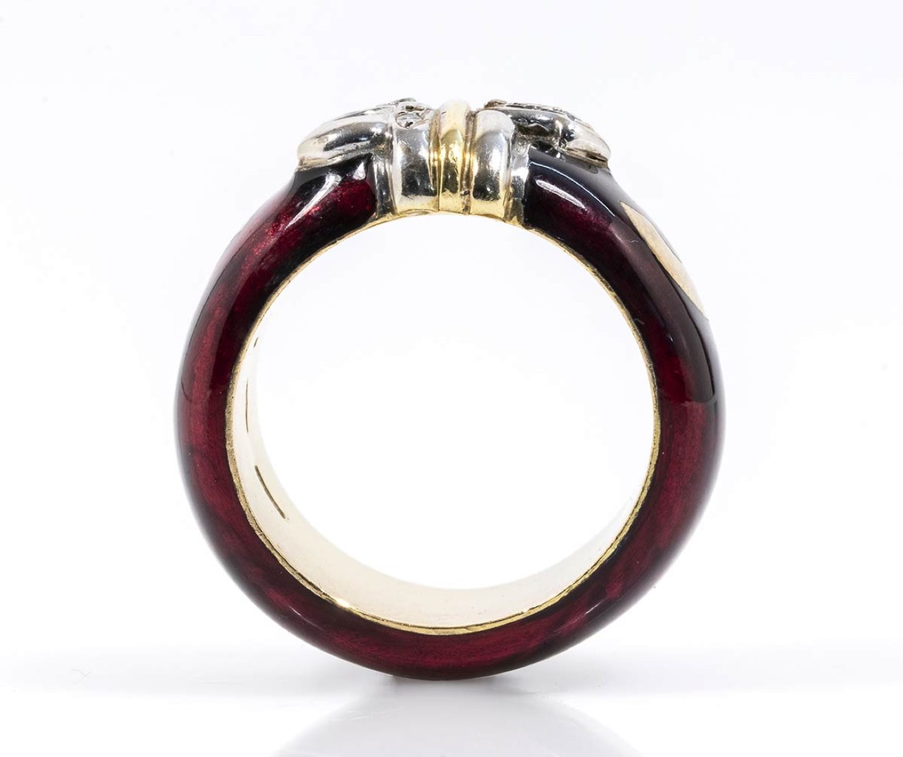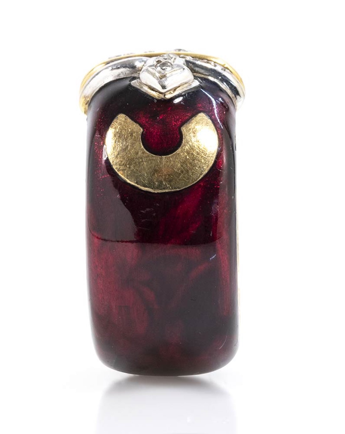 oro giallo 18k ed argento, decorato con applicazione di smalto, incastonato con diamanti taglio brillante 0,12 ct circa, H, VVS. Dimensioni fronte 24 x 13 mm. Peso 16,1 gr. Misura IT 16,5 - misura US 7,7. Stato di conservazione: ***** eccellente.