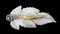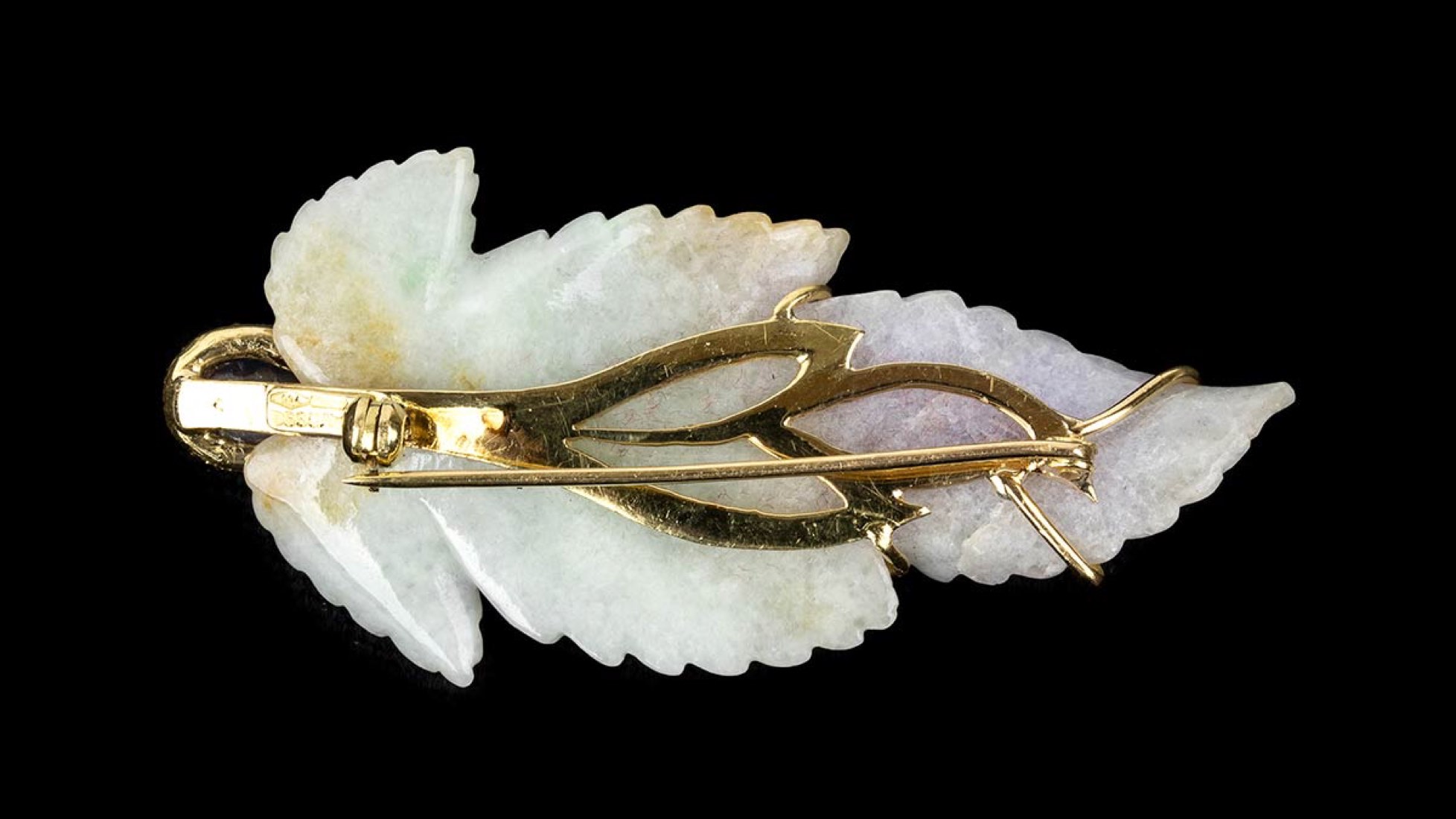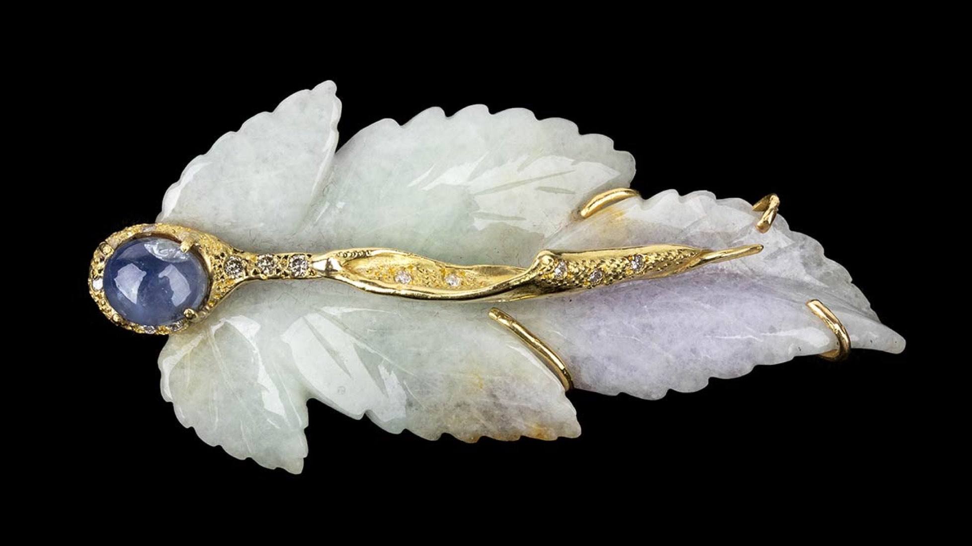 oro giallo 18k, con foglia scolpita in giadeite dai colori verde e lavanda, incastonata con zaffiro asteria, dettagli in diamanti taglio brillante 0,10 ct circa, H, VS-SI. Firmata "D'AVOSSA" e punzonata "750". Dimensioni 65 x 30 mm. Peso 20,8 gr. Stato di conservazione: ***** eccellente.
