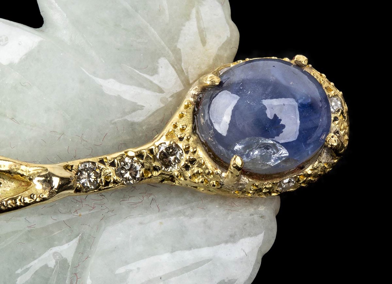 Spilla-pendente in oro, giadeite policroma, diamanti e zaffiro stellato, manifattura D'AVOSSA, ROMA