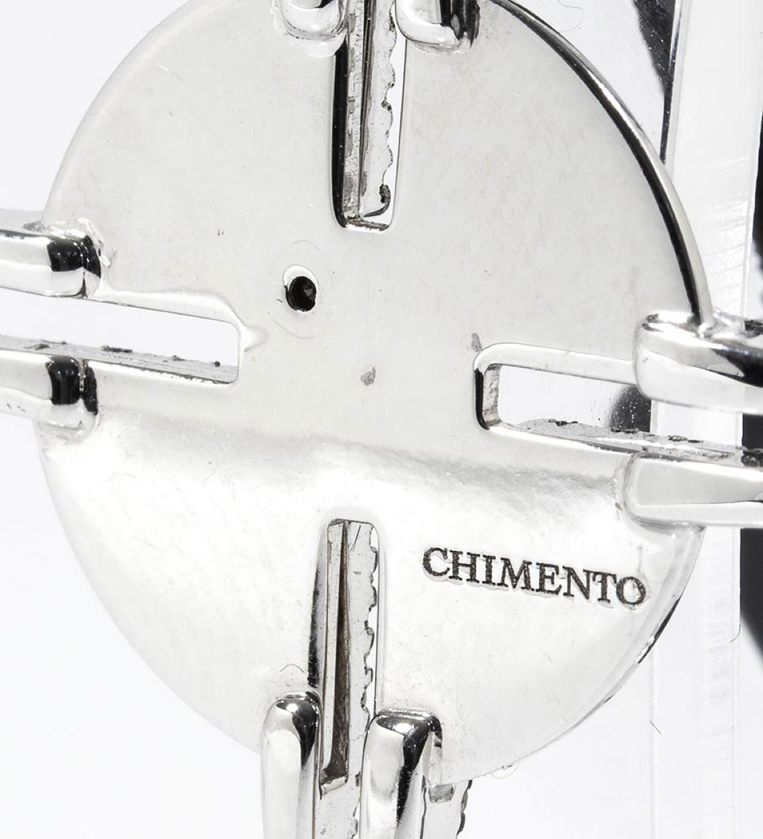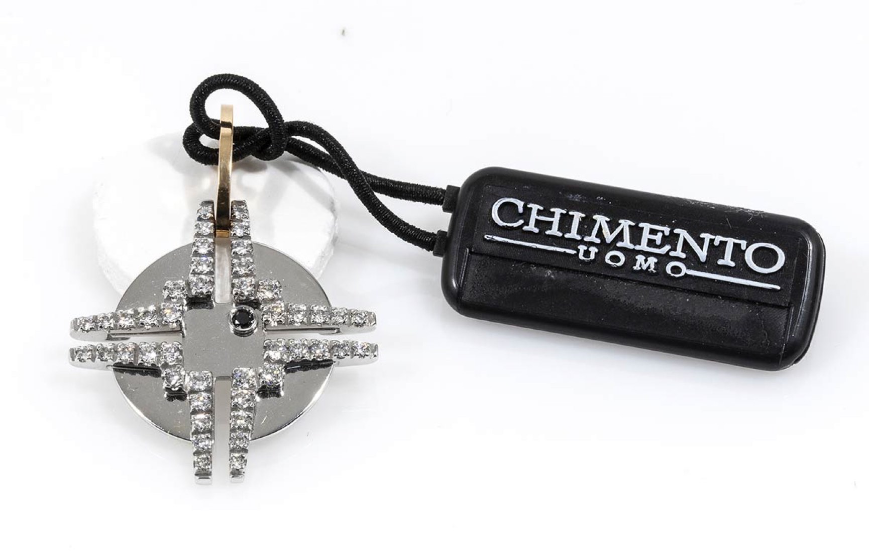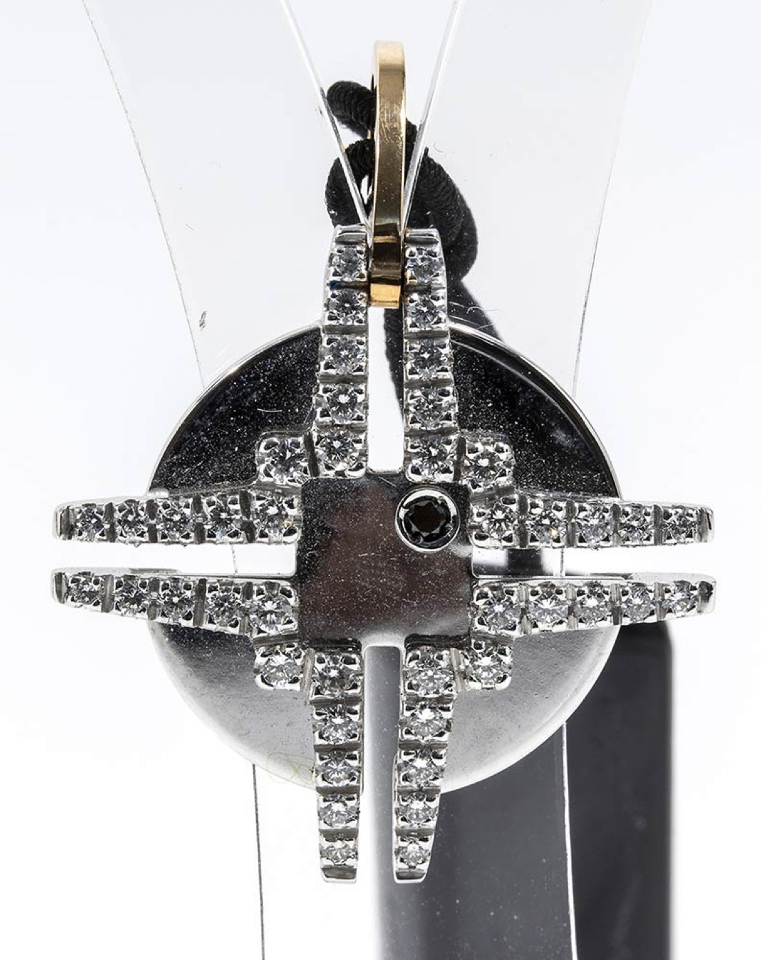 oro bianco e giallo 18k, di forma rotonda, incastonato con diamanti a disegno di croce 0,35 ct circa, G, VVS e diamante nero 0,02 ct. Manifattura CHIMENTO. Punzonato "750", "406 VI" e "CHIMENTO". Dimensioni fronte 34 x 26 mm. Peso 6,2 gr. Stato di conservazione: ***** eccellente.