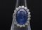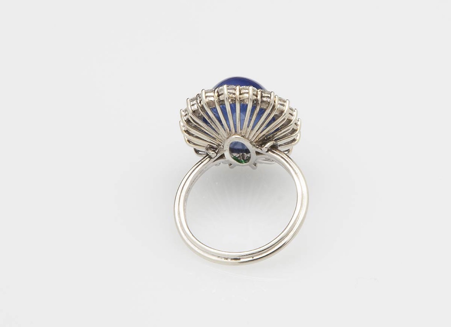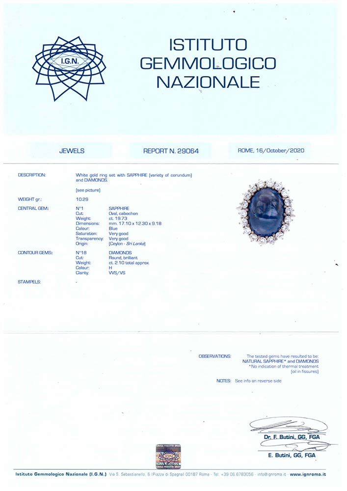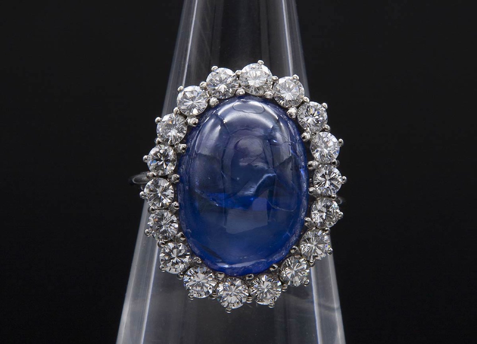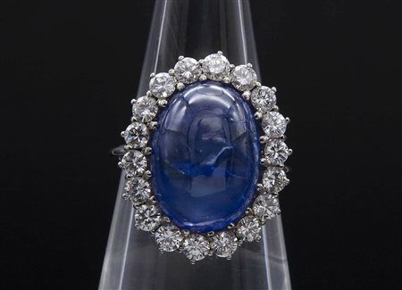 oro bianco 18k, con zaffiro cabochon centrale non trattato 19,73 ct, provenienza Ceylon, contornato di diamanti taglio brillante 2,10 ct circa. Misura ITA 17 - misura US 7,75. Peso 10,29 gr. Stato di conservazione: ***** eccellente.