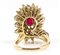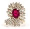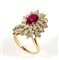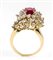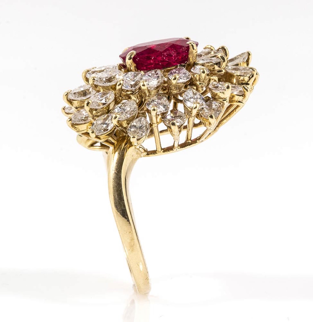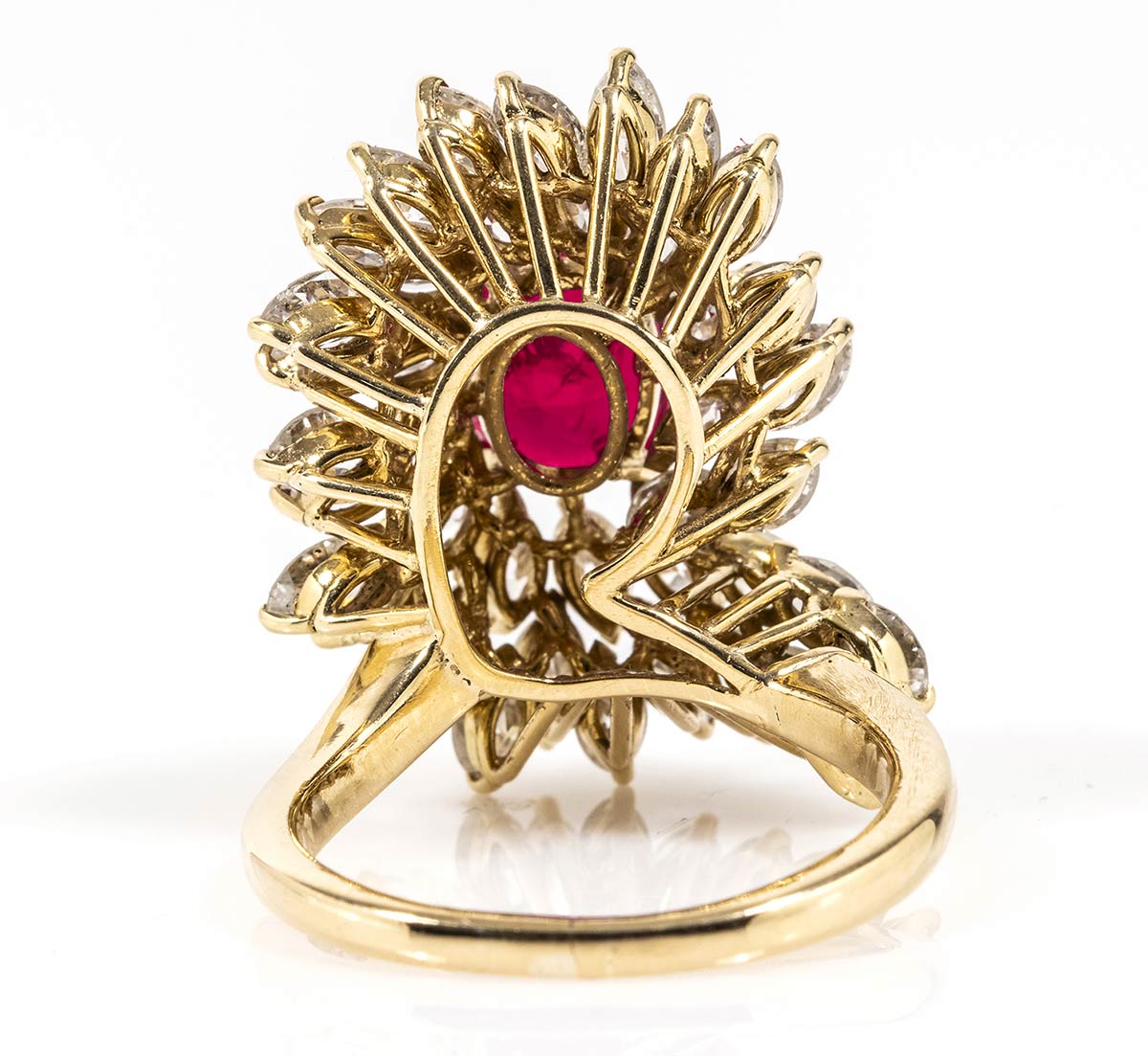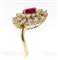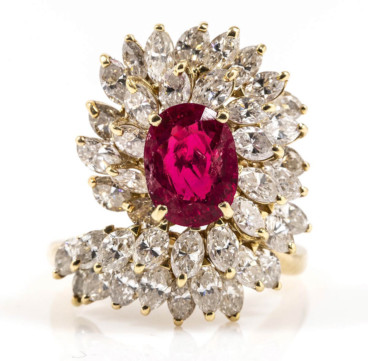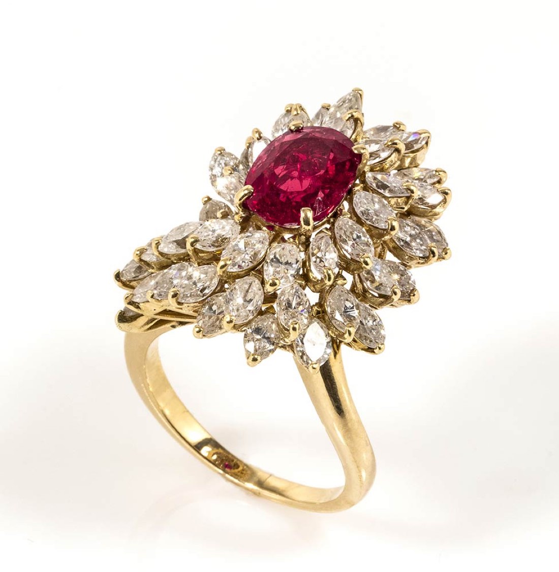oro giallo 18k, incastonato con rubino birmano ovale, non trattato, 2,71 ct circa contornato da diamanti taglio a navetta 5,50 ct circa, H, IF-VS. Dimensioni fronte 24 x 17 mm. Misura IT 15 - misura US 7. Peso 10,1 gr. Stato di conservazione: ***** eccellente. Accompagnato da perizia tecnica Istituto Gemmologico Nazionale I.G.N.