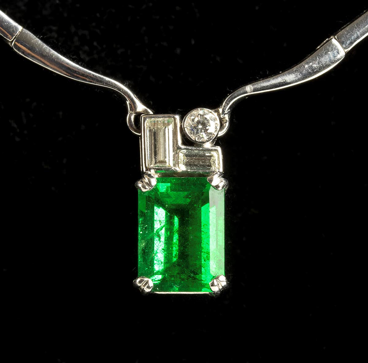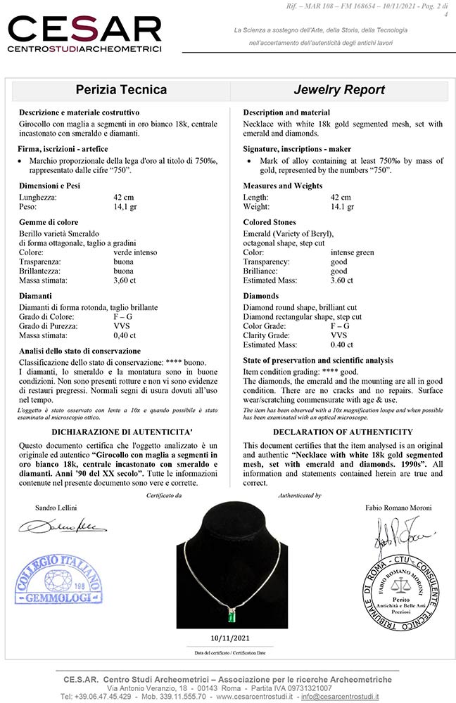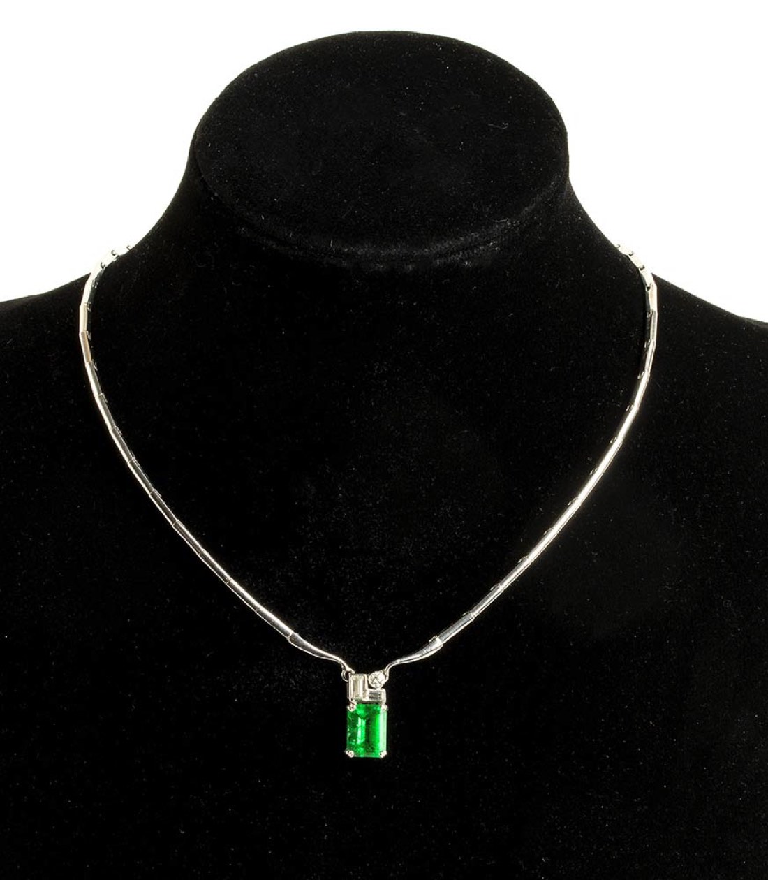 oro bianco 18k, incastonato con smeraldo colombiano taglio ottagonale 3,60 ct circa e diamanti taglio brillante 0,40 ct circa, F-G, VVS. Lunghezza della collana 42 cm. Punzonata "750". Peso 14,1 gr. Stato di conservazione: ***** eccellente. Accompagnato da certificato di verifica gemmologica Ce.S.Ar. Centro Studi Archeometrici.
