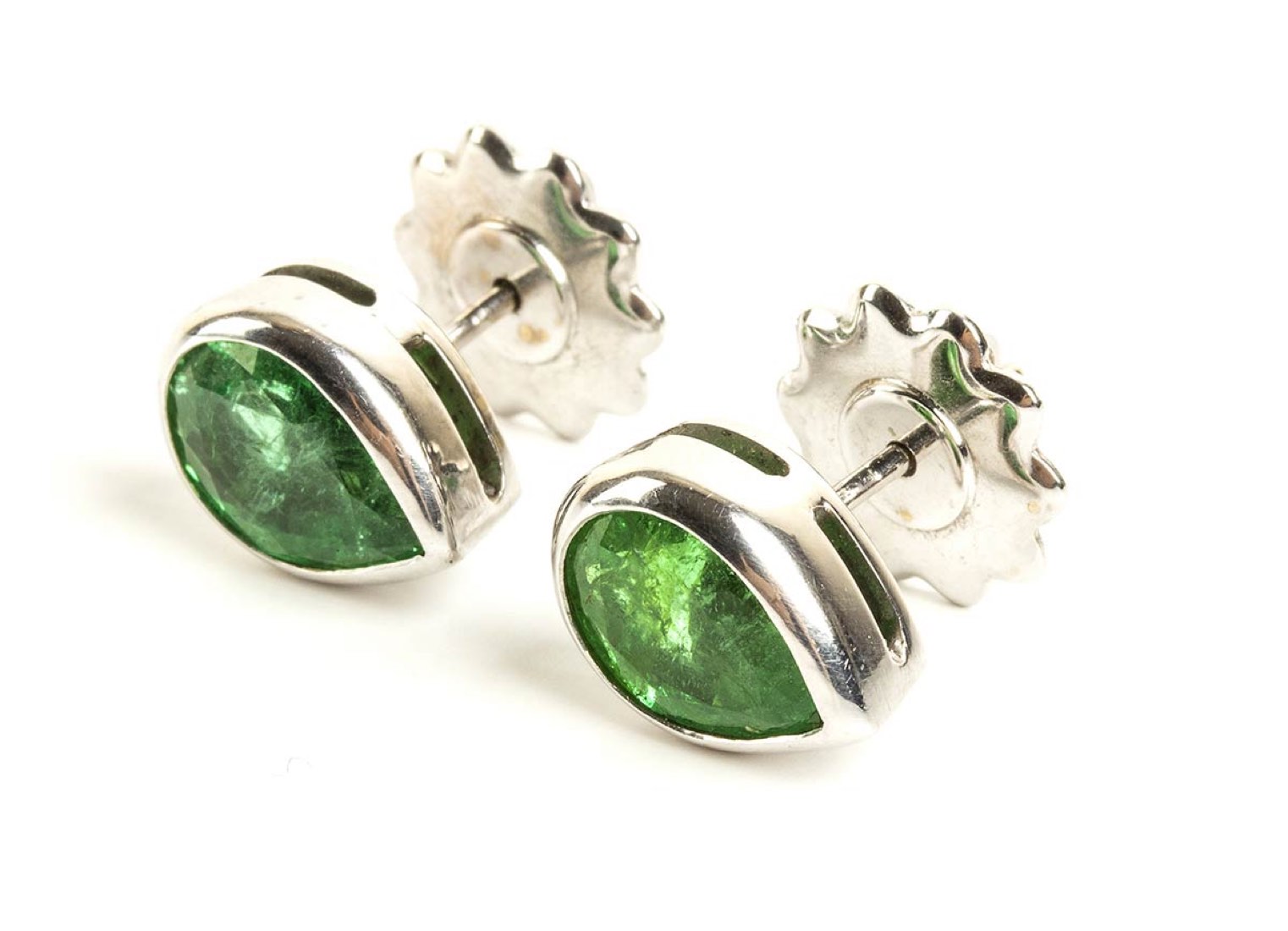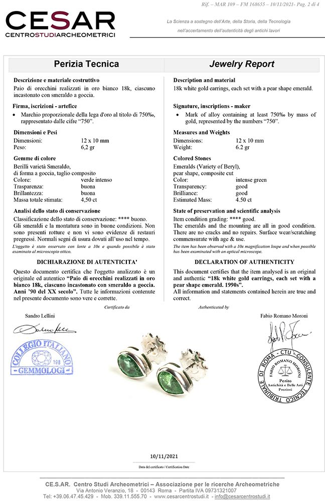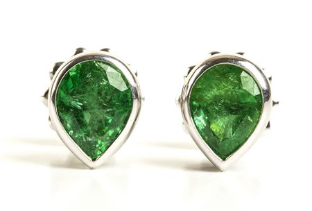 oro bianco 18k, incastonati con smeraldi colombiani a goccia 4,50 ct circa. Dimensioni 12 x 10 mm. Peso 6,2 gr. Stato di conservazione: ***** eccellente. Accompagnato da certificato di verifica gemmologica Ce.S.Ar. Centro Studi Archeometrici.