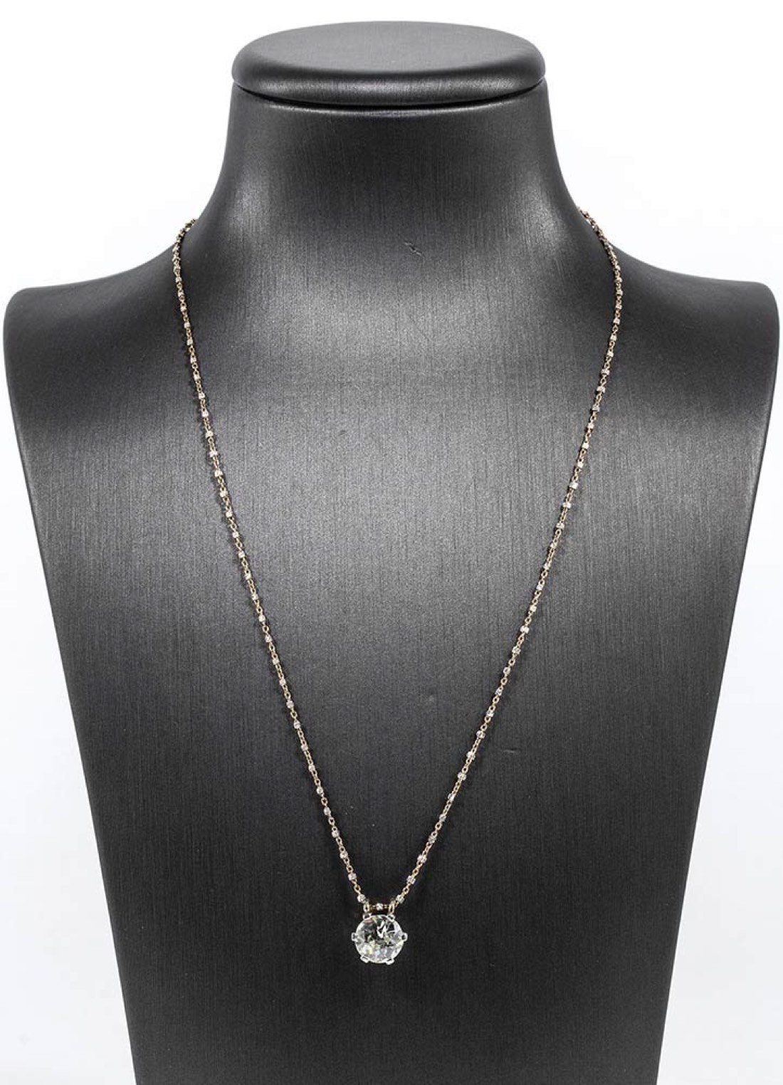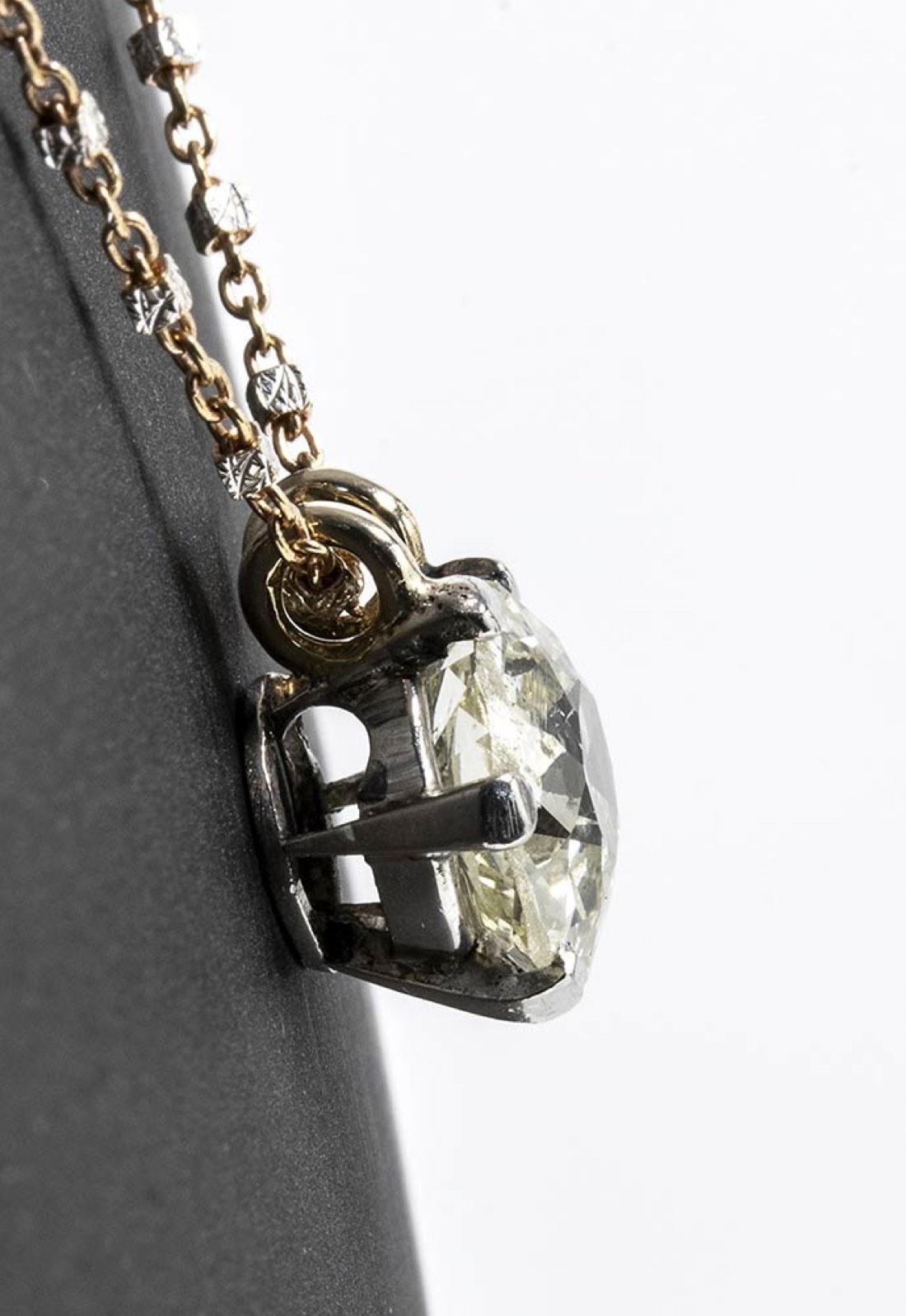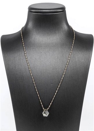 in oro giallo e rosa 18k. Pendente modello solitario con diamante taglio vecchio europeo 1,80 ct ca. colore J/K purezza SI. Lunghezza 40,5 cm. Punzonata "750" e "1617 AR". Peso 4 gr. Stato di conservazione: ***** eccellente. Accompagnato da certificato di verifica gemmologica Ce.S.Ar. Centro Studi Archeometrici.