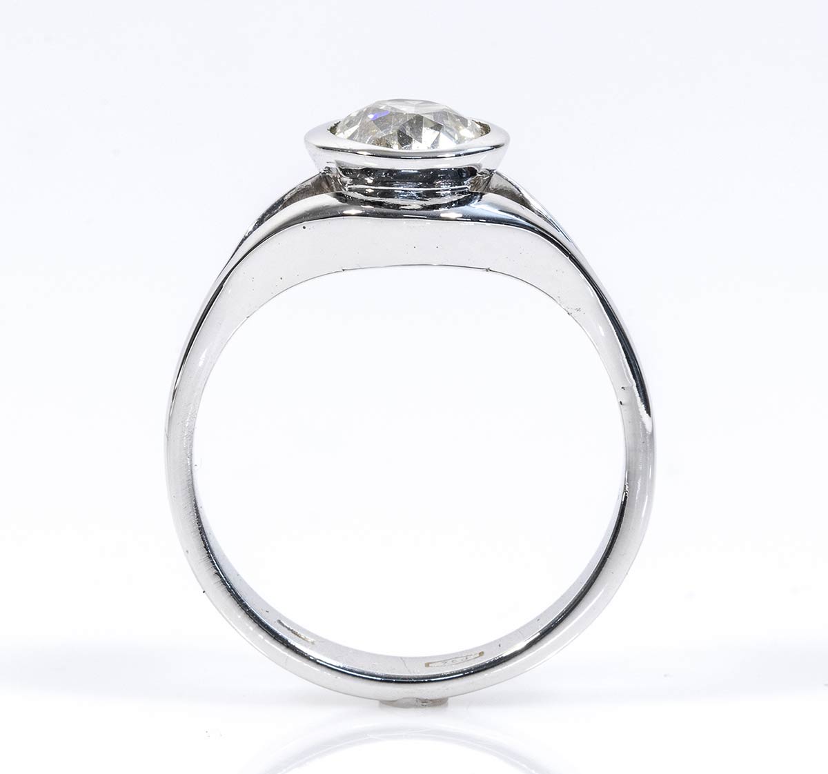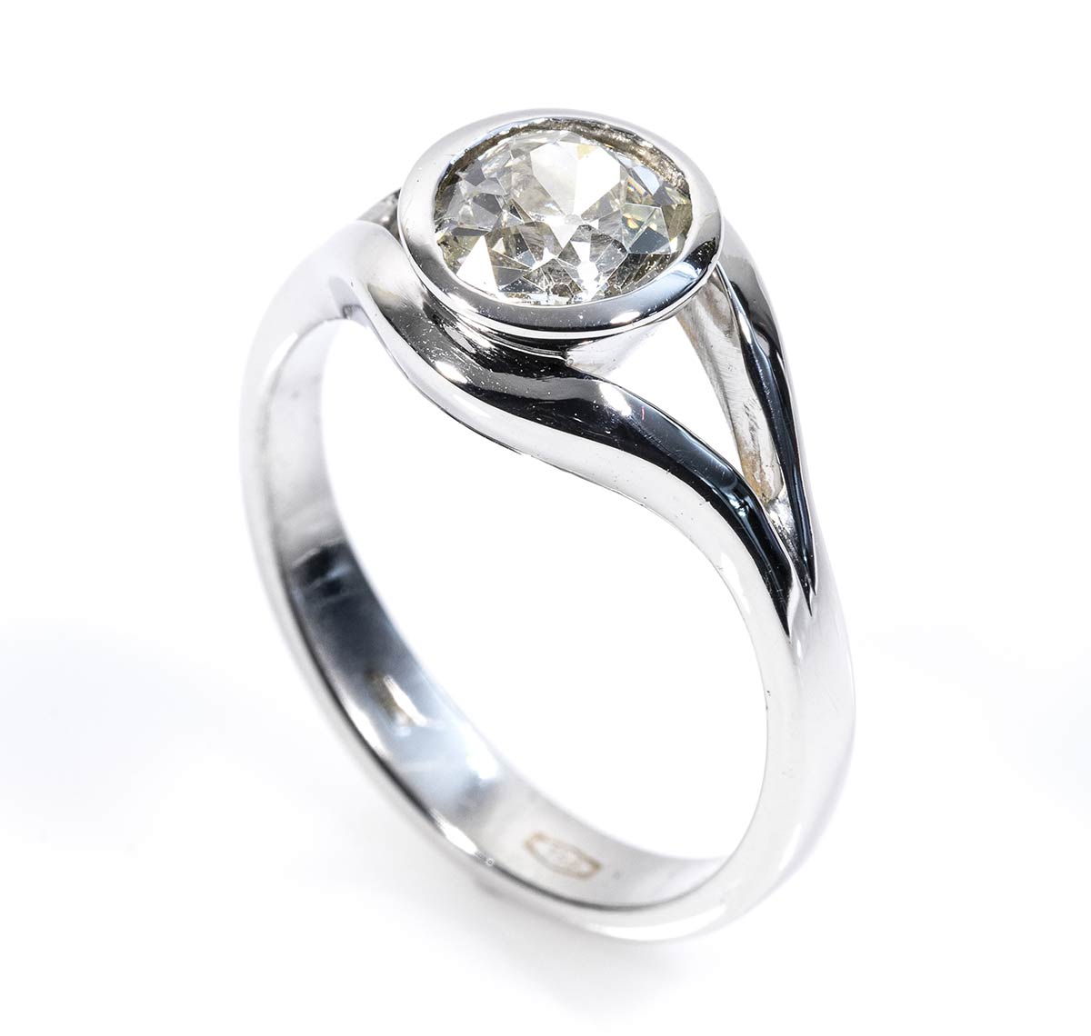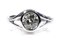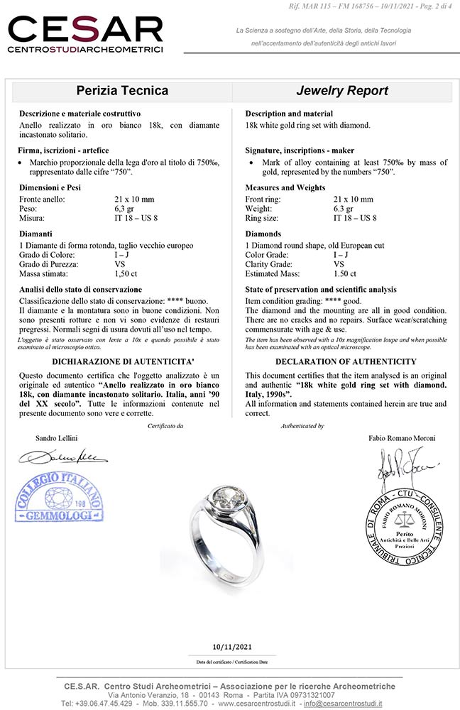 oro bianco 18k, con diamante di taglio vecchio europeo 1,50 ct circa, I-J, VS. Dimensioni fronte 21 x 10 mm. Punzonato "750". Misura IT 18 - misura US 8. Peso 6,3 gr. Stato di conservazione: ***** eccellente. Accompagnato da certificato di verifica gemmologica Ce.S.Ar. Centro Studi Archeometrici.
