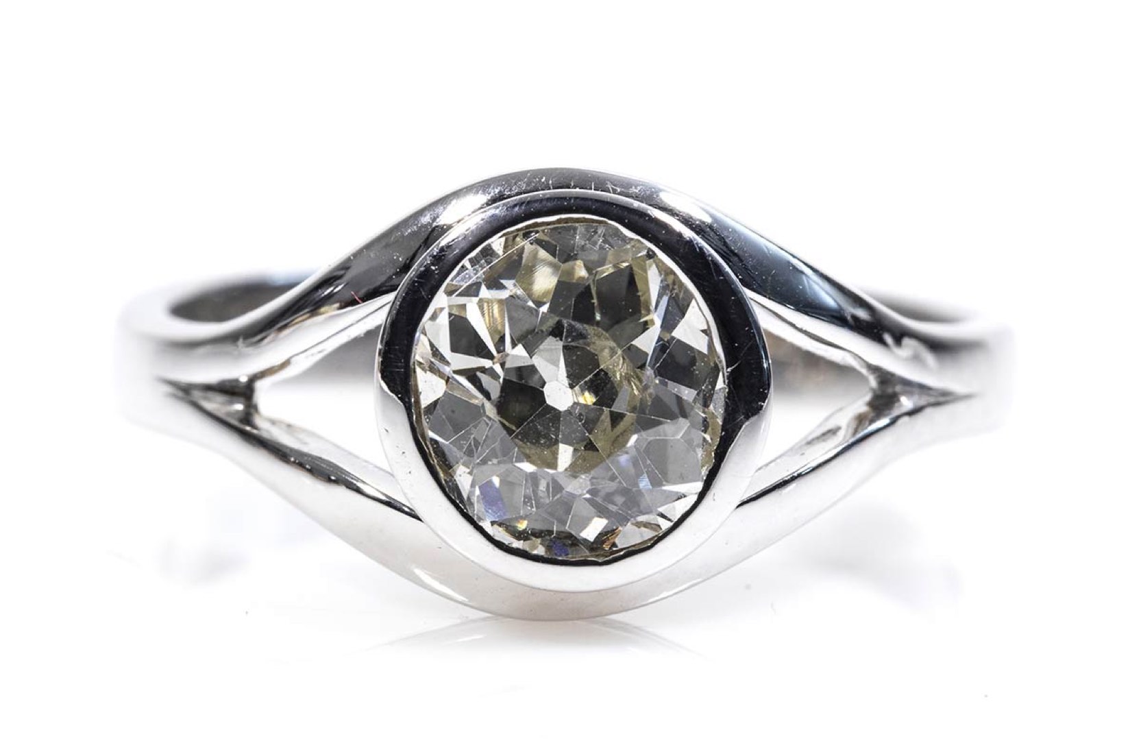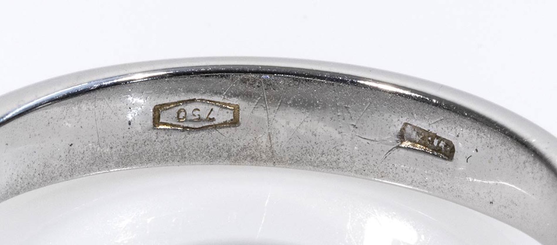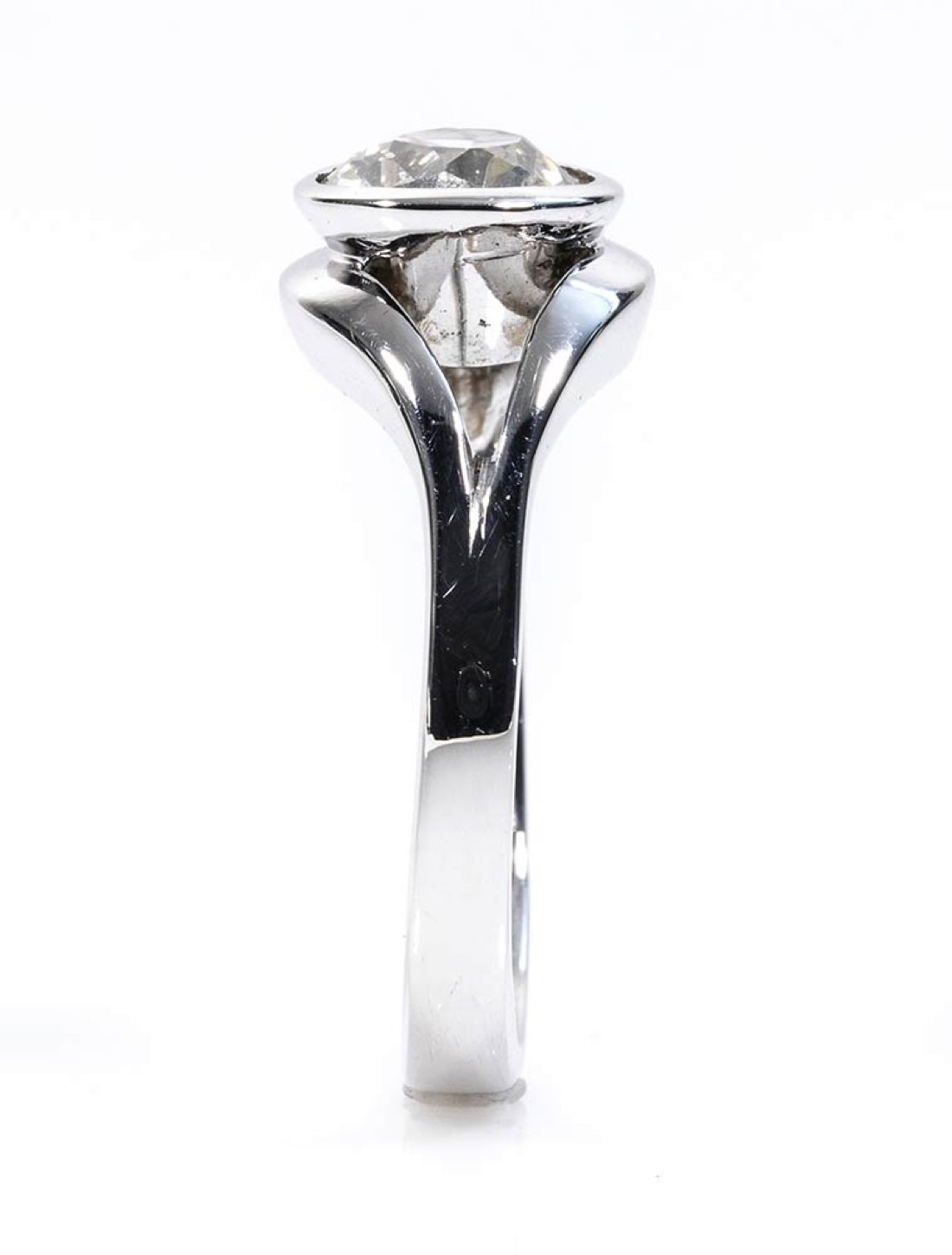 oro bianco 18k, con diamante di taglio vecchio europeo 1,50 ct circa, I-J, VS. Dimensioni fronte 21 x 10 mm. Punzonato "750". Misura IT 18 - misura US 8. Peso 6,3 gr. Stato di conservazione: ***** eccellente. Accompagnato da certificato di verifica gemmologica Ce.S.Ar. Centro Studi Archeometrici.