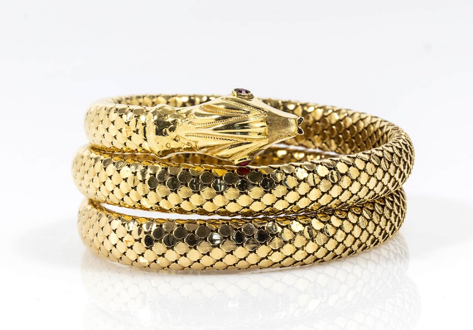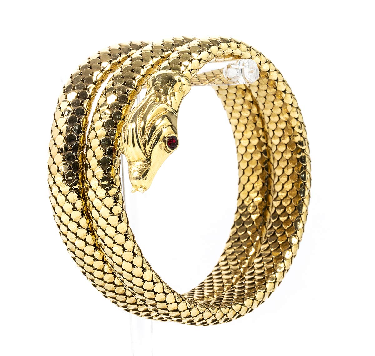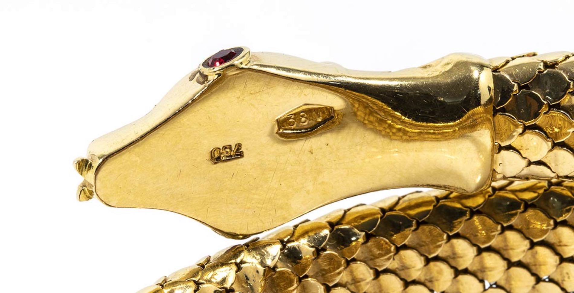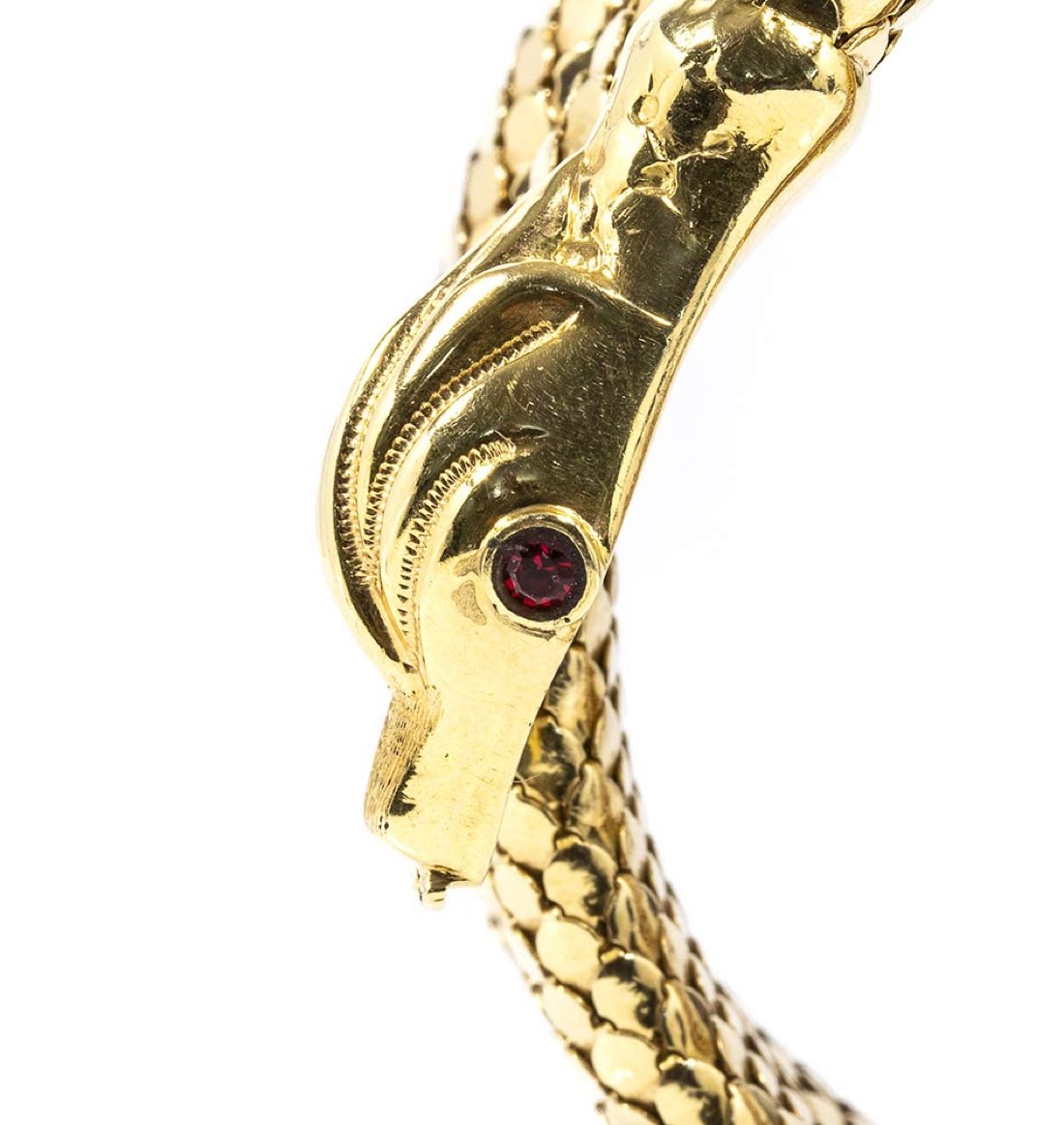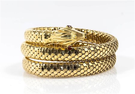 in oro giallo 18k a forma di serpente avvolto a spirale con finitura a squame, occhi in pietre rosse. Punzonato "750" e "38VI". Dimensioni fronte 60 x 30 mm. Peso 73,8 gr. Stato di conservazione: ***** eccellente.